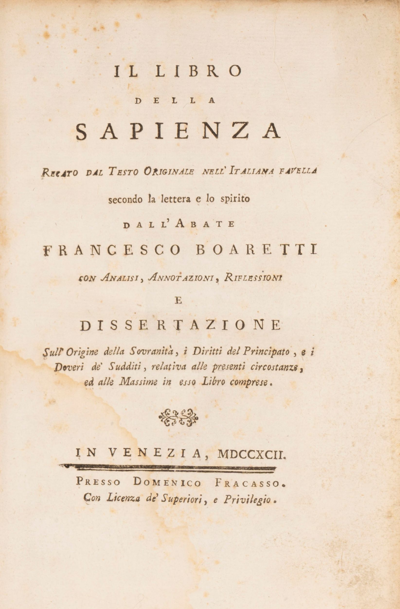 1792 Venezia, presso Domenico Fracasso, 1792. In 8°. Testo su due colonne, qualche lieve fioritura e arrossatura, leggera gora d'acqua al margine interno delle prime carte, legatura coeva in cartoncino decorato, lievi difetti.