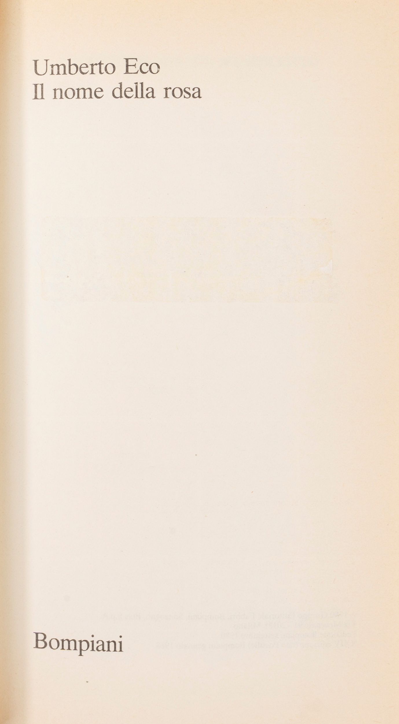 1980 Milano, Bompiani, 1980. In 8°. Legatura editoriale in tela rossa, sovraccoperta a colori. Firma di Umberto Eco alla carta di guardia.§ Insieme nel lotto altre due prime edizioni: Eco, Umberto. L'Isola del giorno prima. Milano, Bompiani, 1994. Legatura in tela rossa, sovraccoperta a colori e Eco, Umberto. Baudolino, Milano, Bompiani, 2000. Legatura editoriale in tela blu, sovraccoperta illustrata, lievi segni di usura.