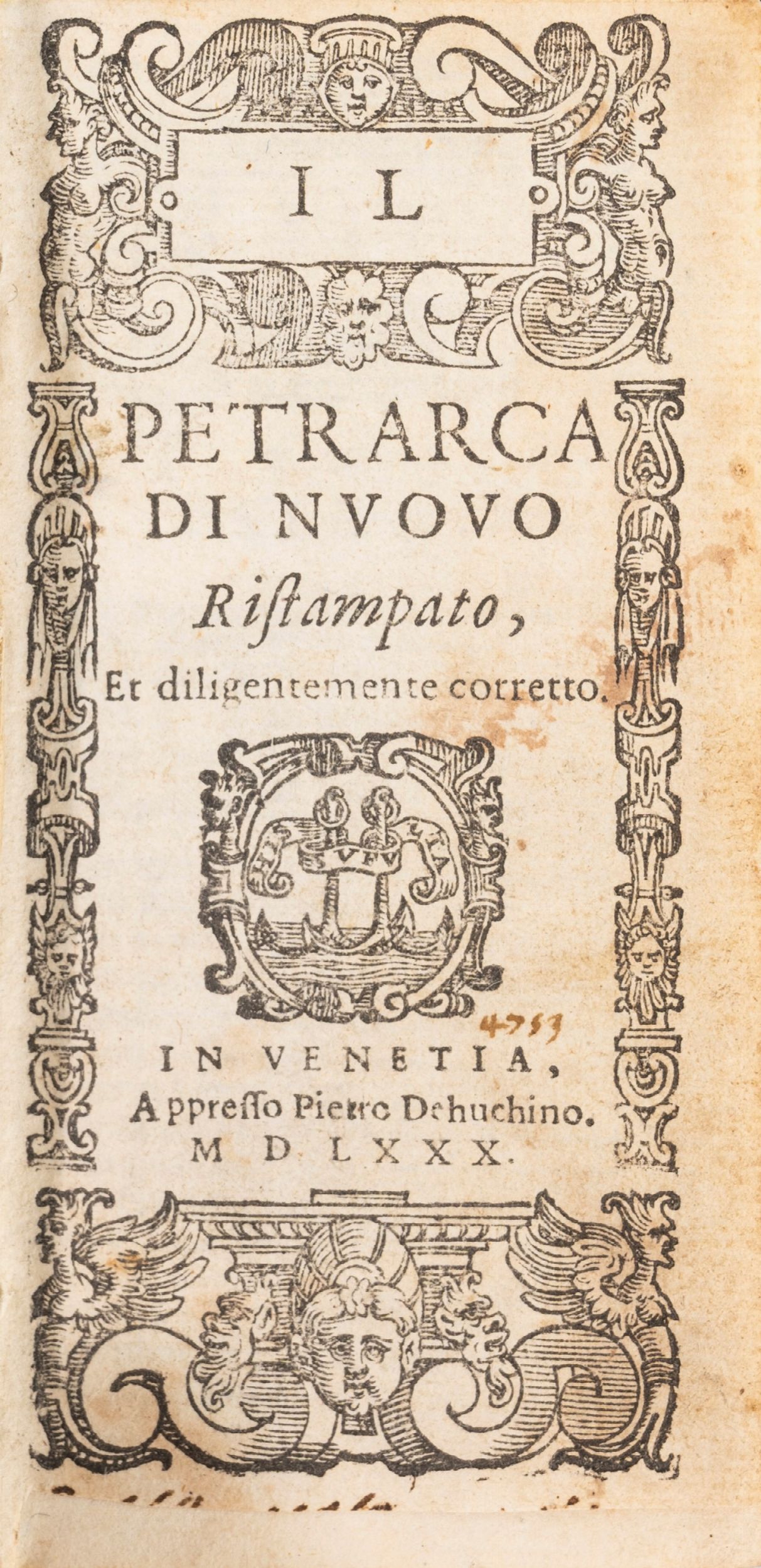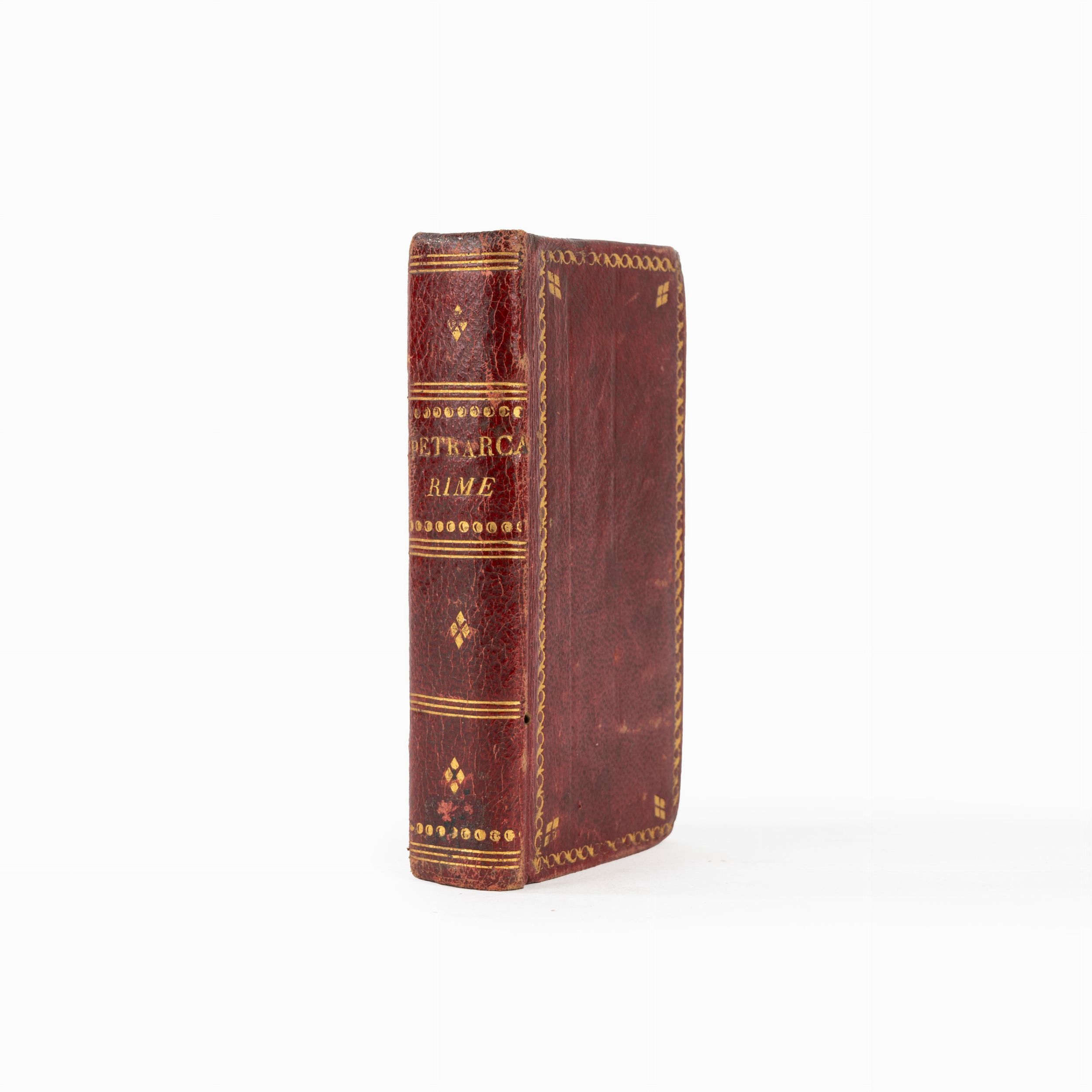 1580 Venezia, Pietro Deuchino, 1580. In 24°, 98 x 52 mm., 336, [12] p. Frontespizio entro cornice xilografica finemente elaborata, al centro marca tipografica con due ancore unite da nastro, in alto, in ovale inserito nella cornice, tre gigli, coi ritratti di Laura e Petrarca e piccoli intagli in legno nei Trionfi, manca un striscia di 4 mm. al margine bianco inferiore del frontespizio, il sonetto 92a p.94 sull'Avara Babilonia come di consueto censurato, esemplare perfetto, in una elegante legatura del sec.XVIII in marocchino rosso con decorazioni in oro ai piatti e al dorso.