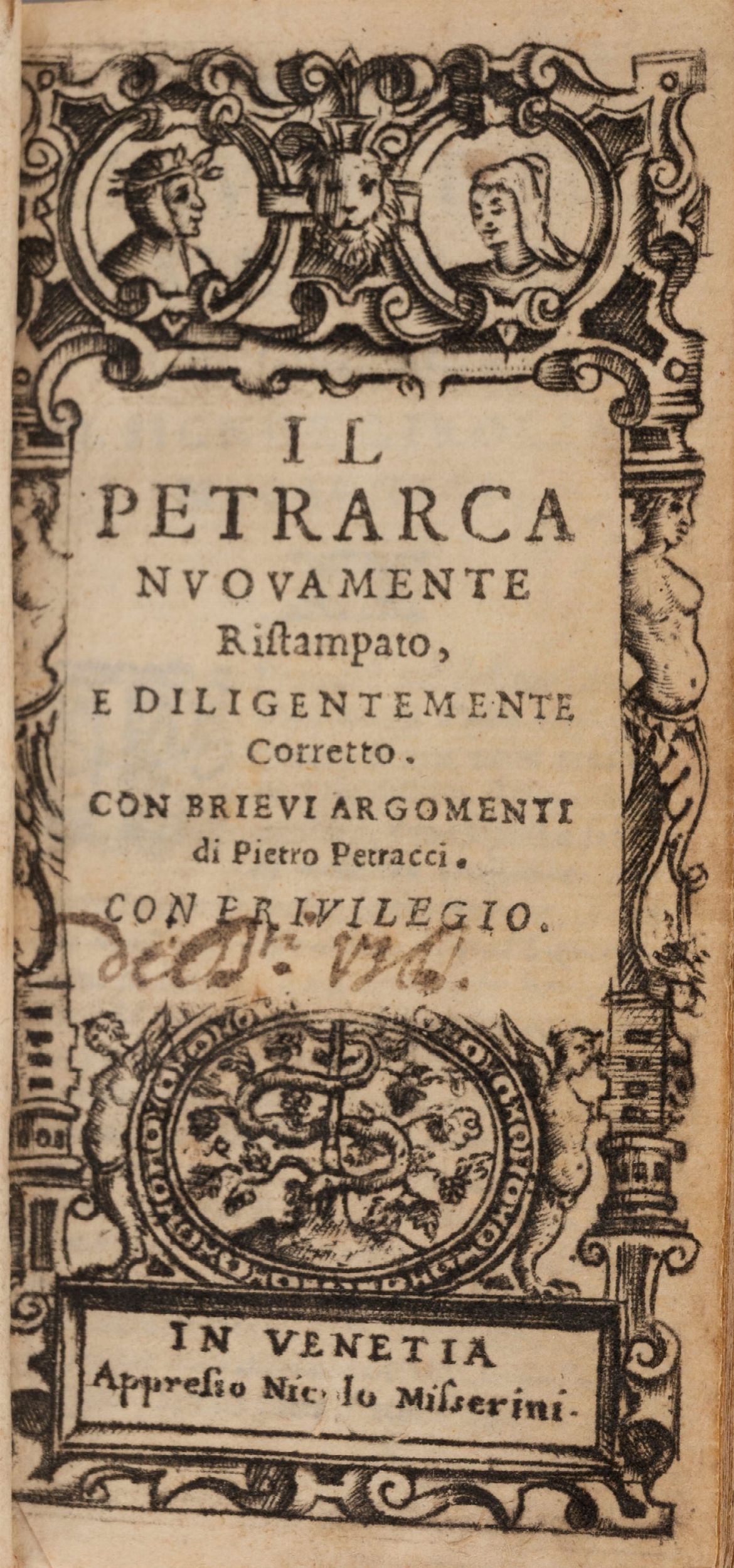 1624 Venezia, Nicolo Misserini, 1624. In 24° lungo. Frontespizio entro cornice architettonica con ritratti di Laura e Petrarca, incisioni nel testo, iniziali xilografiche, marca tipografica al verso dell'ultima carta, rare arrossature, legatura coeva in pelle, piccole mancanze al dorso, spellature, piatto anteriore allentato, lievi difetti. Timbro ed ex libris cartaceo alle carte di guardia.