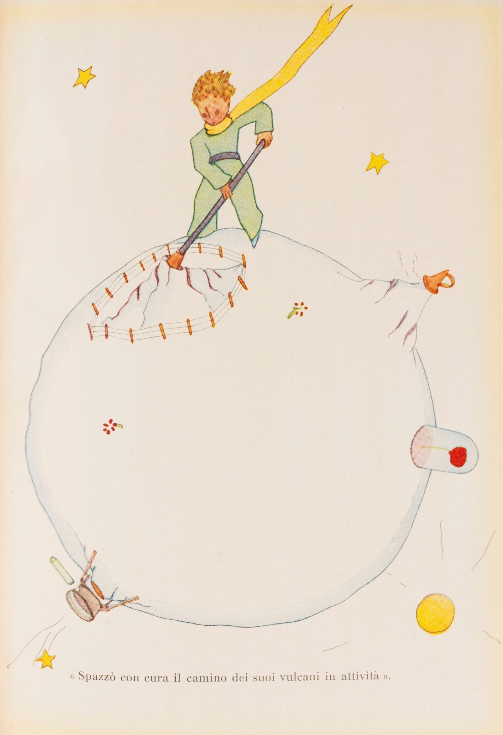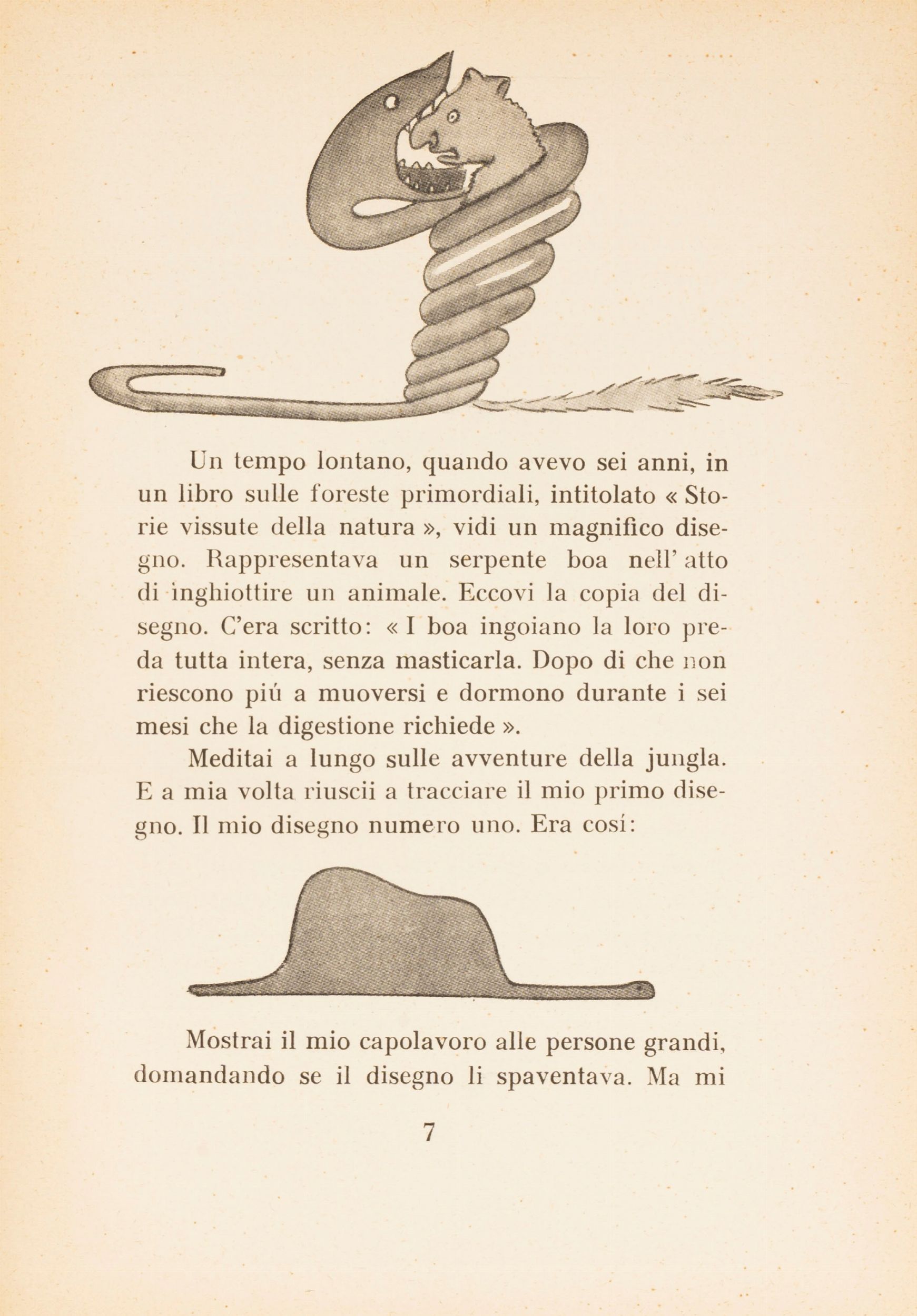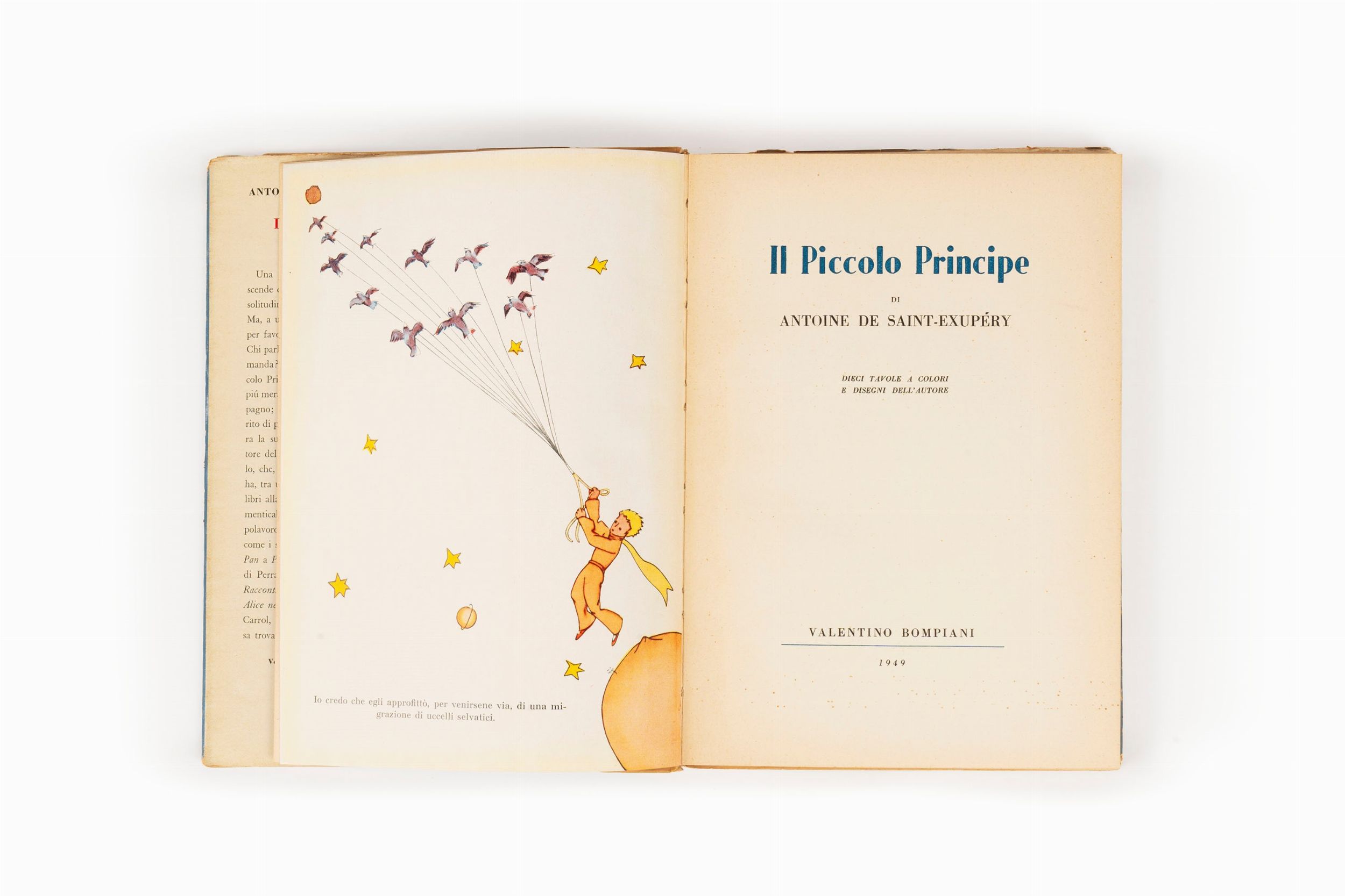 1949 Milano, Valentino Bompiani, 1949. Illustrato con dieci tavole a colori e sei disegni dell'autore, legatura editoriale in cartonato con al piatto anteriore disegno del piccolo principe, sovracoperta illustrata a colori, piccoli strappi.