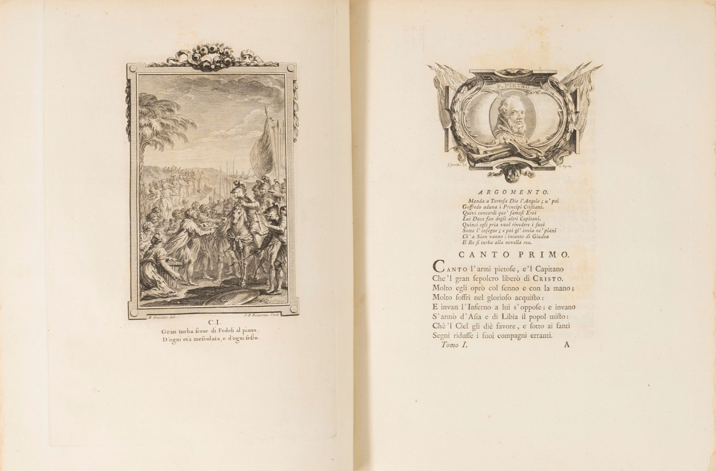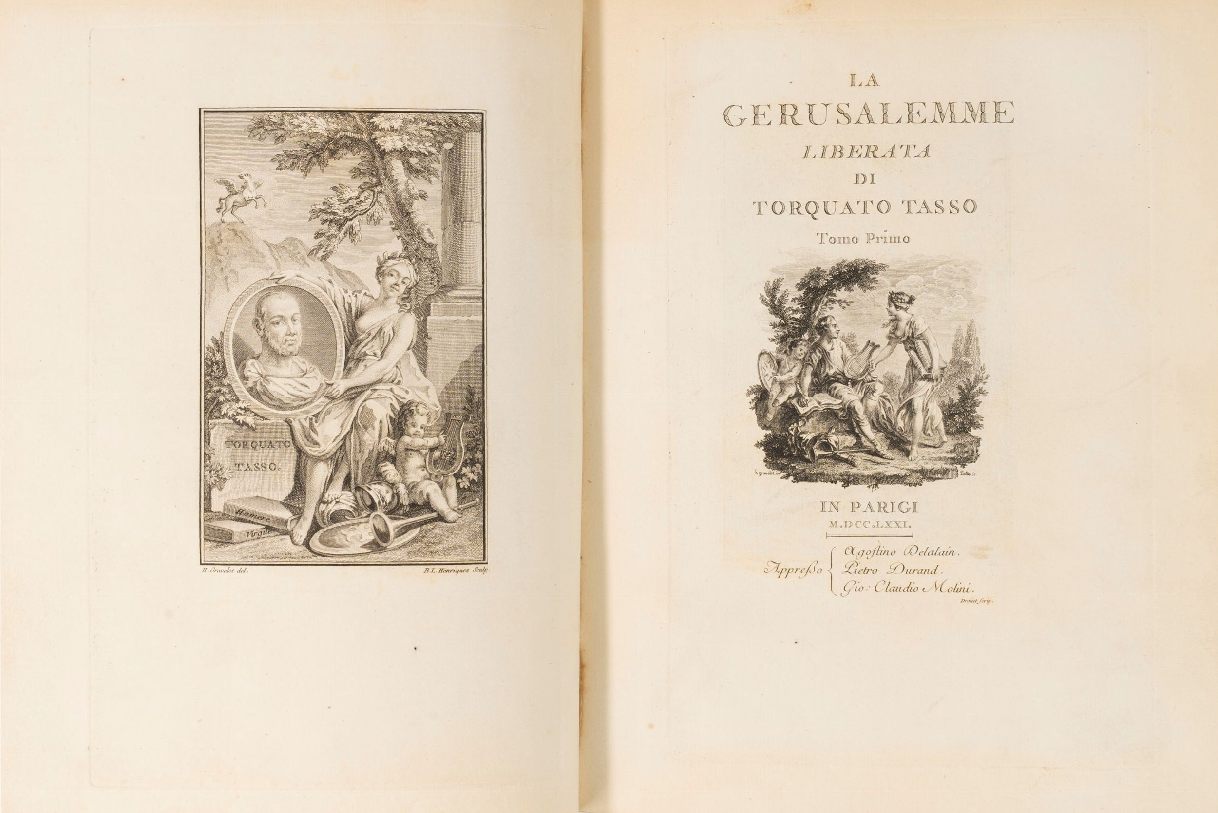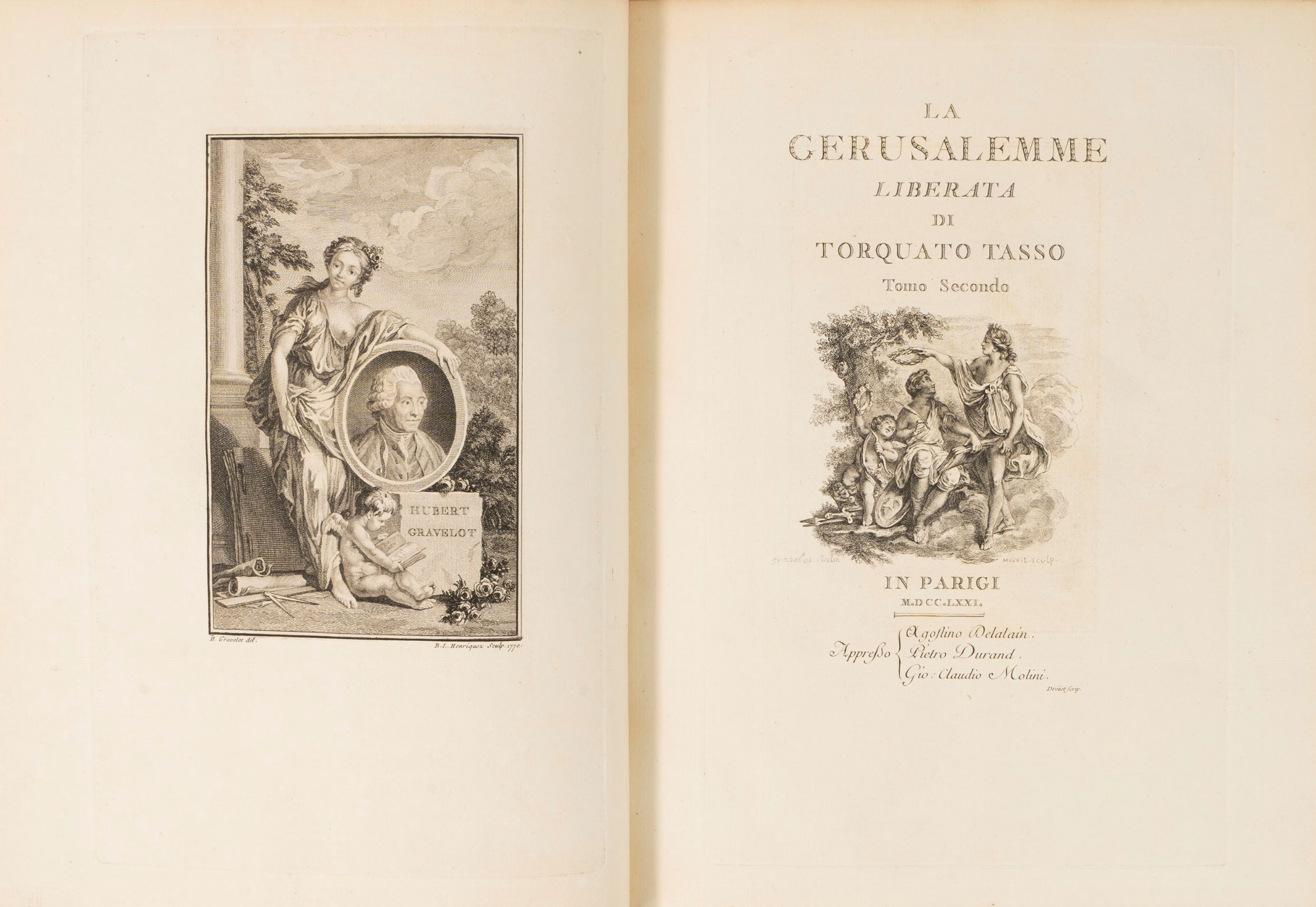 1771 Parigi, Agostino Delalain, Pietro Durand, Gio Claudio Molini, 1771. In 4° grande, 285 x 220 mm. 2 voll. ESEMPLARE IN GRAN PAPIER. La vera prima edizione, con i ritratti in italiano anziché in francese . Superbamente illustrata con 20 tavole a piena pagina finemente incise, frontespizio col ritratto di Tasso opera di Gravelot, frontespizi incisi in ogni volume, copiosamente ornato da belle incisioni tra cui 9 culs-de-lame a piena pagina, 20 testate e 14 cul-de-lampe disegnati da Gravelot e incisi in rame da Baquoy, Duclos, Henriquez, Leveau, Le Roy, Massard ed altri, splendida legatura coeva in marocchino rosso con doppia cornice di filetti in oro, dorso a sei scomparti con decorazioni e fregi in oro, titolo su tassello verde a lettere dorate, tagli dorati. Ex libris al contropiatto recante motto: 'Deo Patriae Amicis'.
