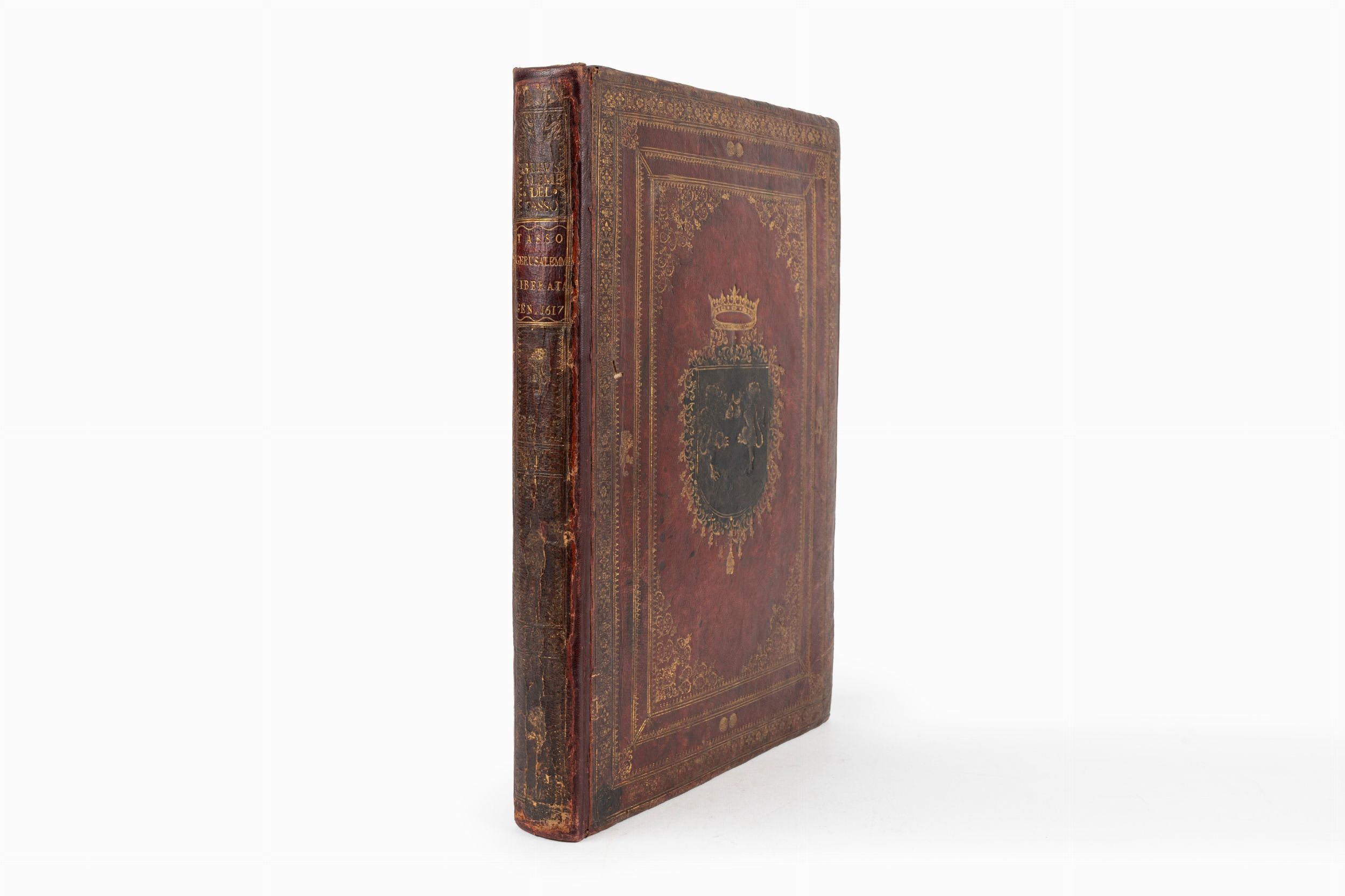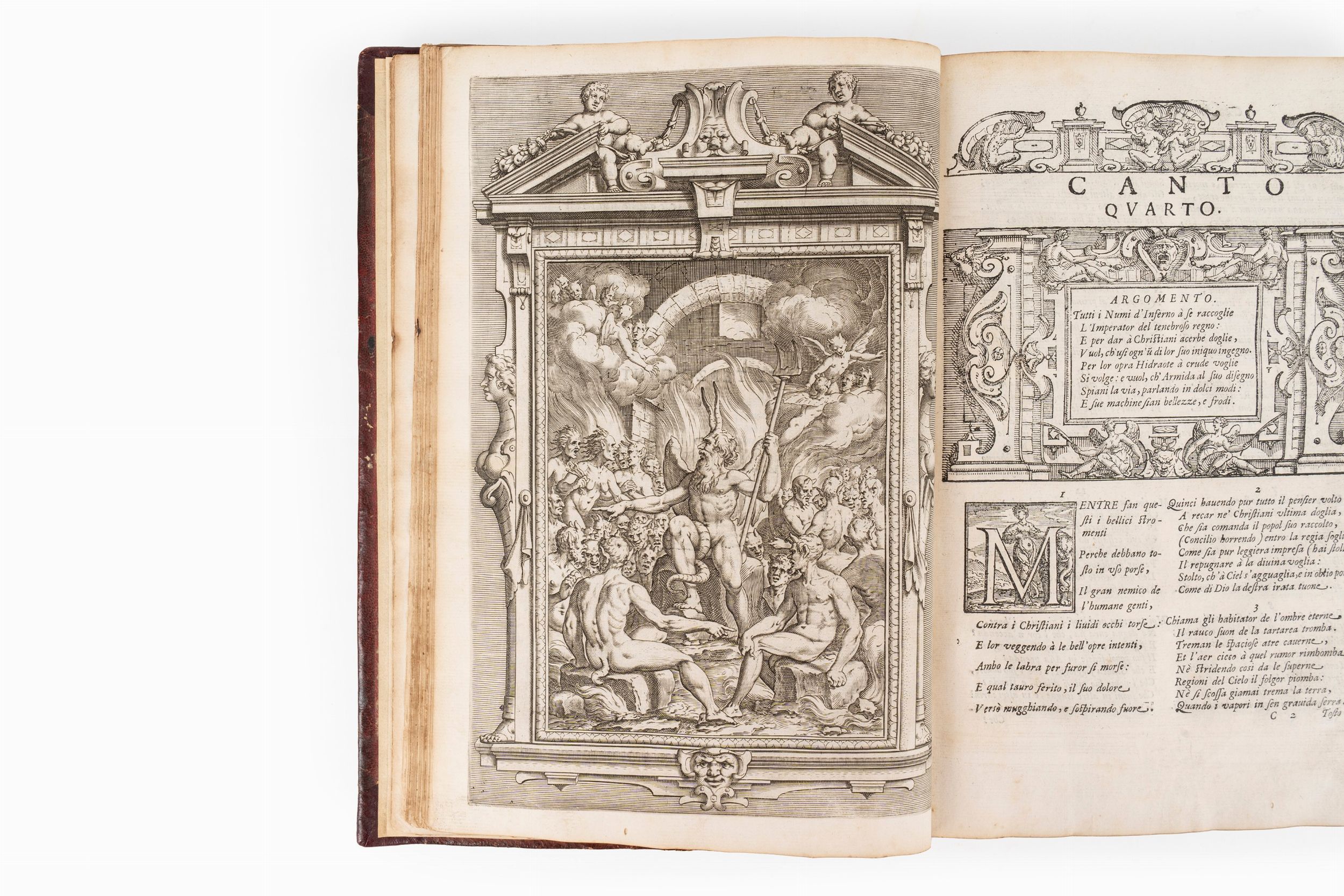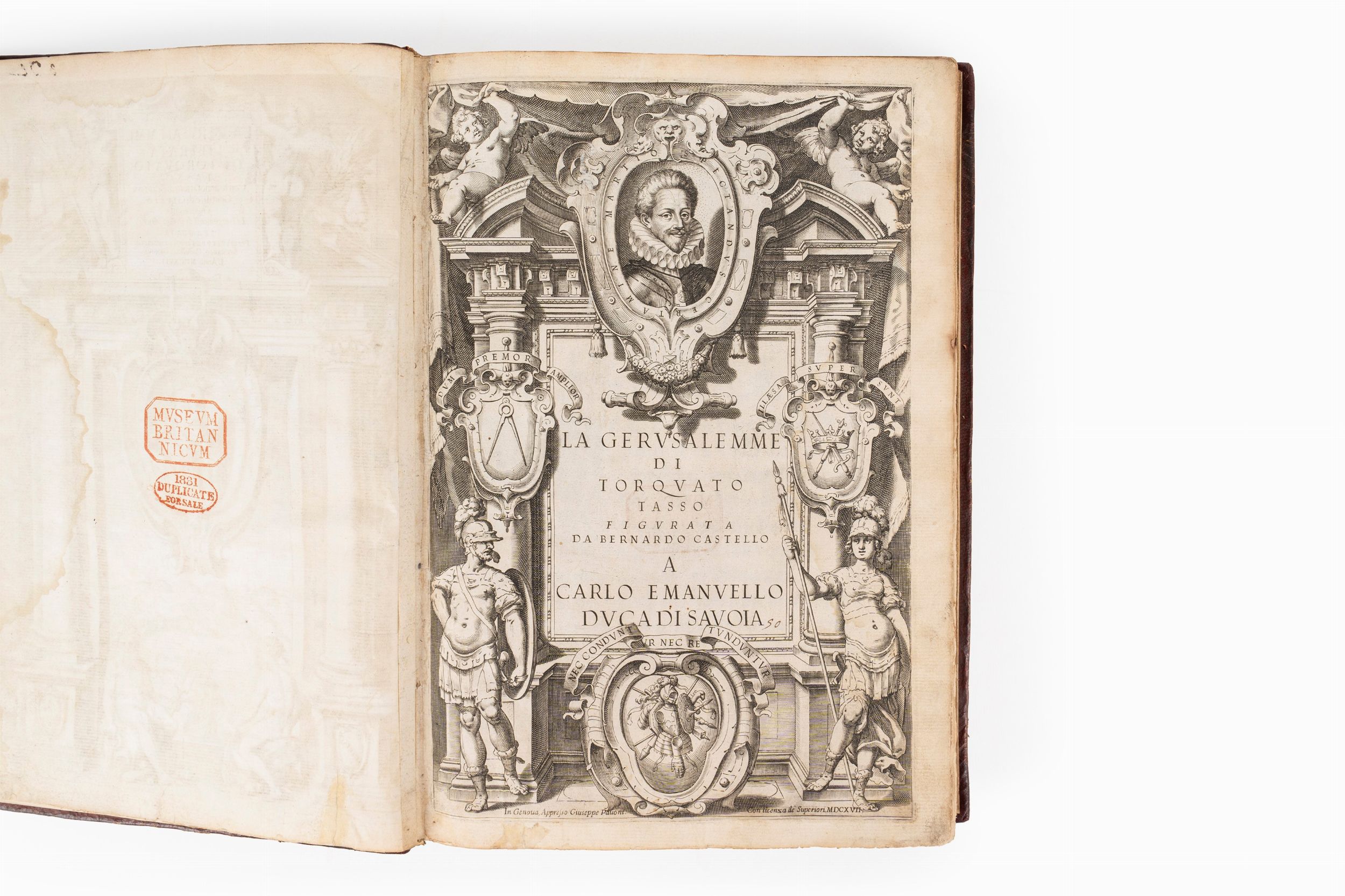 1617 Genova, Giuseppe Pavoni, 1617. In 2°. Due magnifici frontespizi calcografici inquadrati in elaborati motivi architettonici, uno con il ritratto di Carlo Emanuele di Savoia e l'altro con un panorama di Genova ed il ritratto del Tasso, 20 tavole incise in rame da disegni di Castello poste in apertura di ciascun canto, eleganti raffigurazioni inquadrate in ricche cornici architettoniche, testate, finalini e capilettera ornati incisi in legno, qualche arrossatura, leggere macchie ed aloni di umidità , SPLENDIDA LEGATURA COEVA in vitello bordeaux con raffinate cornici dorate ai piatti, decorate da ferri fitomorfi, al centro uno stemma nobiliare che racchiude due leoni rampanti uno di fronte l'altro, difetti. Timbro al verso dell'antiporta del 'Museum Britannicum - 1881 Duplicate for sale'.