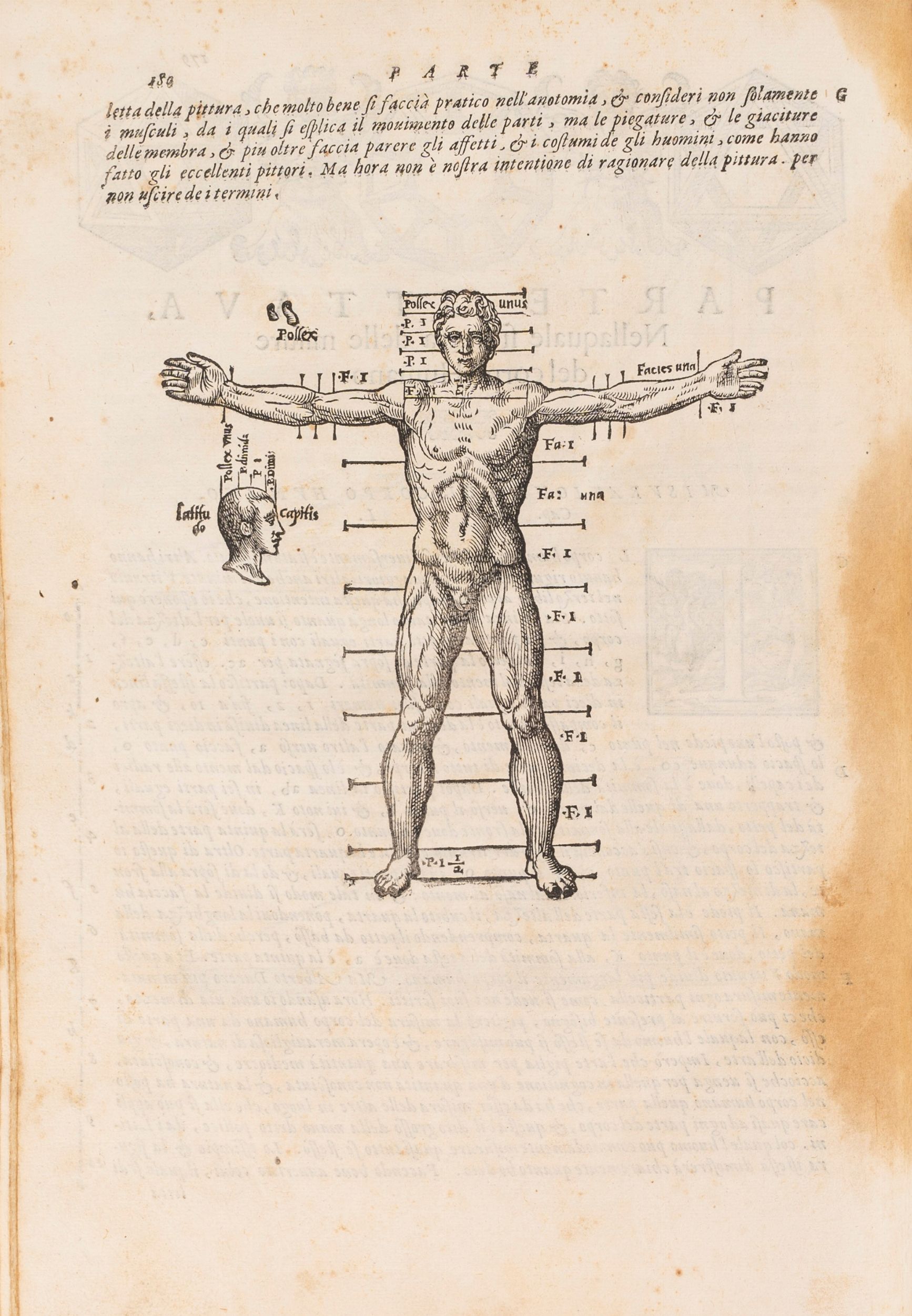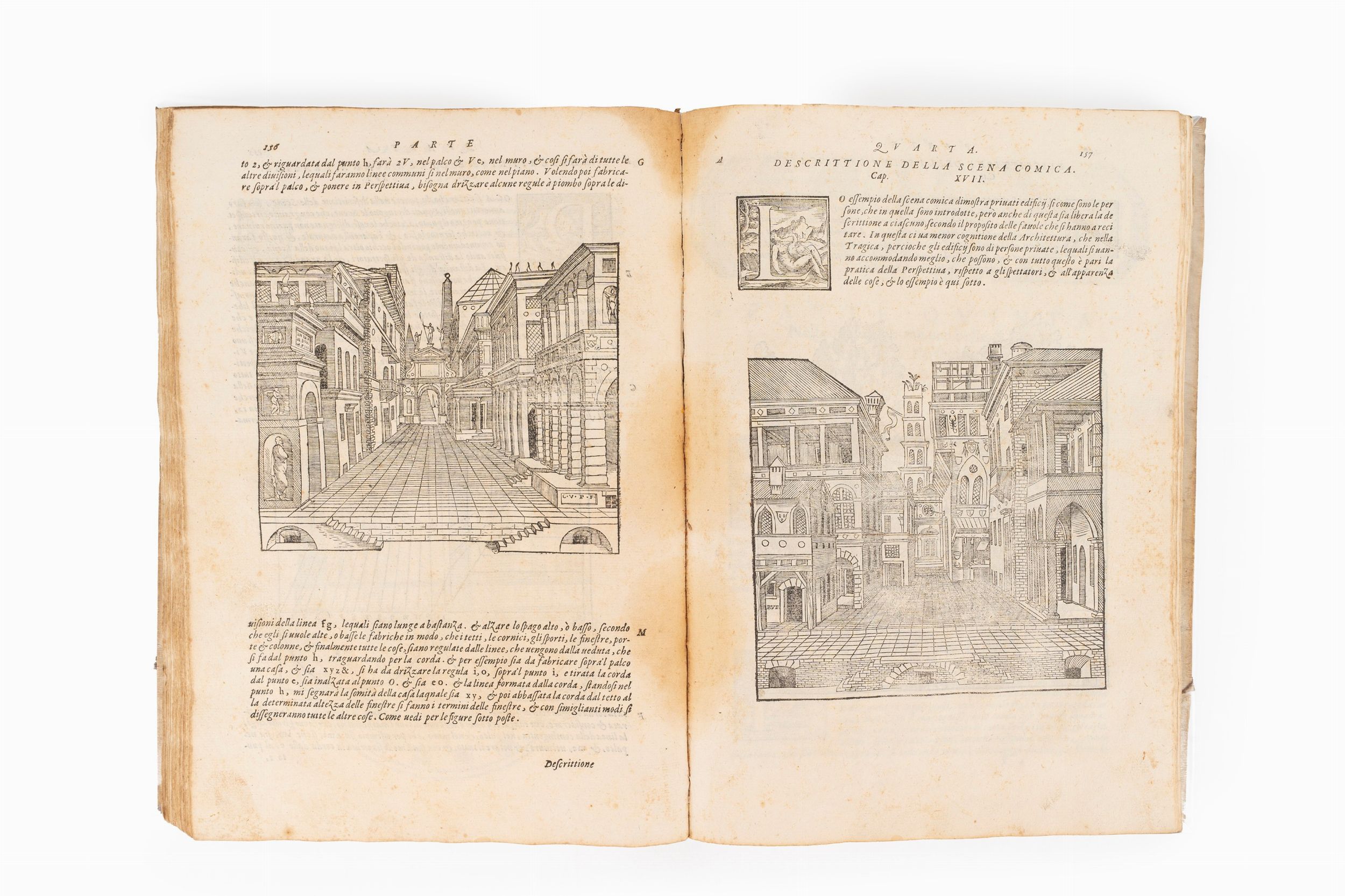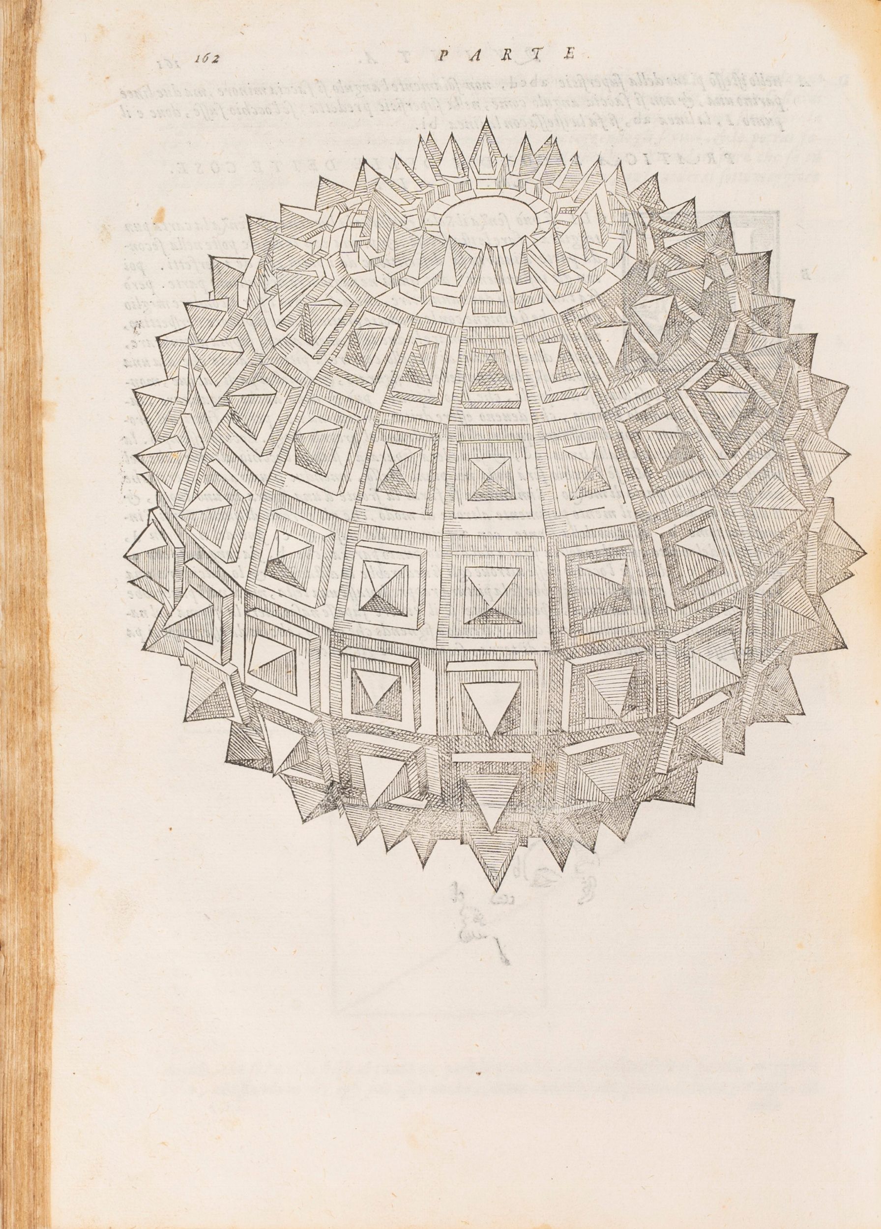 1568 Venezia, Camillo e Rutilio Borgominieri, al Segno di San Giorgio, 1568. In 2°. Titolo entro bordura xilografica che racchiude le prime due parole e marca xilografica dello stampatore, ripetuta a 2B6v., carattere corsivo, 220 illustrazioni e diagrammi xilografici, 23 a piena pagina, uno a doppia pagina, testate xilografiche con forme geometriche tridimensionali e iniziali xilografiche, arrossature e marginali aloni, legatura coeva in pergamena floscia, copia estremamente genuina. Nota di possesso manoscritta al frontespizio del sec.XVI.