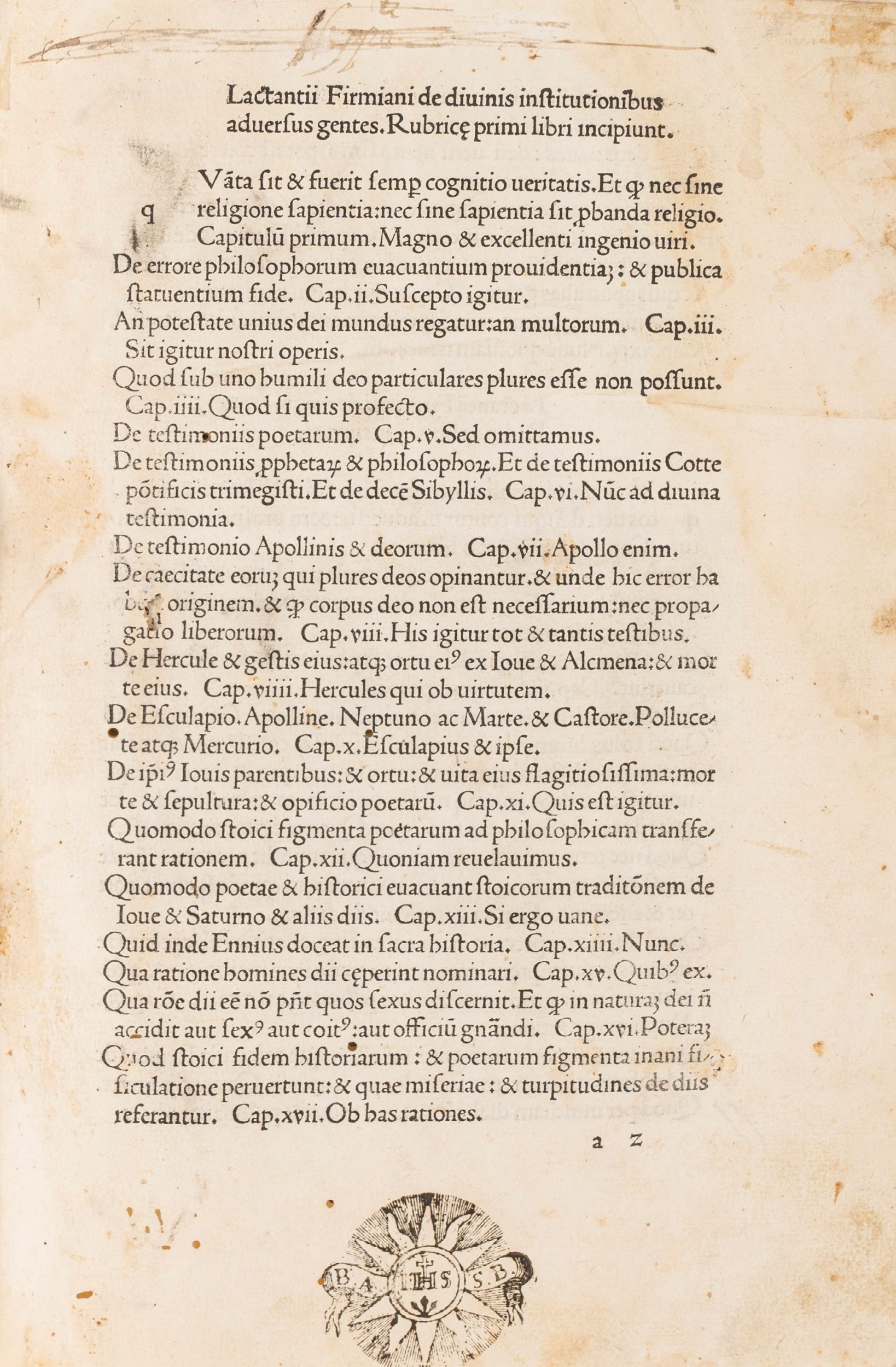 1478 Venezia, Johannes de Colonia & Manthen, Johannes, 27 agosto 1478. In 2°. Carattere romano, spazio per lettere guida, note di mano antica, mancanti 9 carte: la 1 carta bianca e le ultime 9 (il quaderno dopo il registro), queste ultime sostituite da riproduzione, piccoli fori di tarlo alle prime carte, qualche lieve gora d'acqua, piccoli fori alle ultime carte, leggermente rifilato, legatura di epoca successiva in pergamena e carta marmorizzata, tassello con titolo in oro al dorso, tagli marmorizzati, piccola mancanza al tassello, piccoli difetti. Timbro al frontespizio.