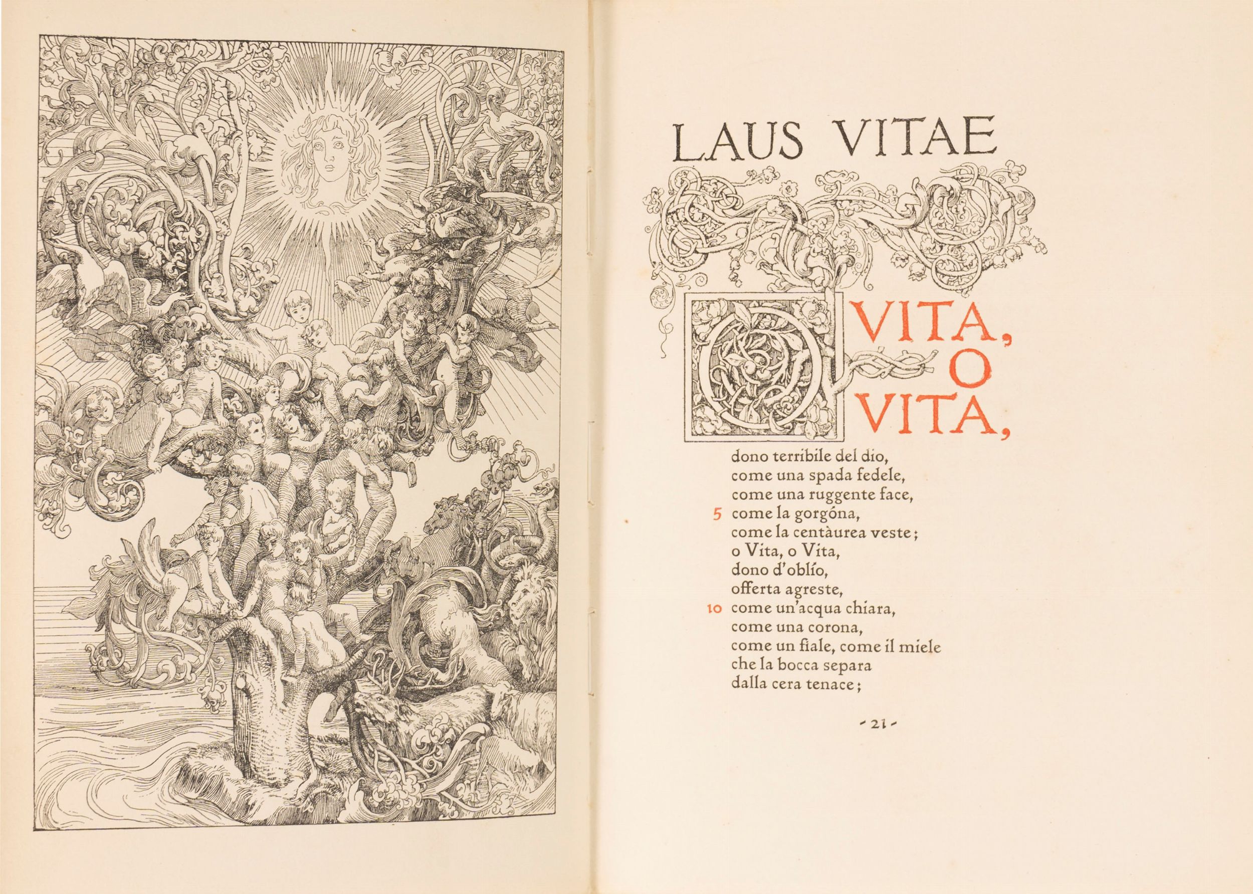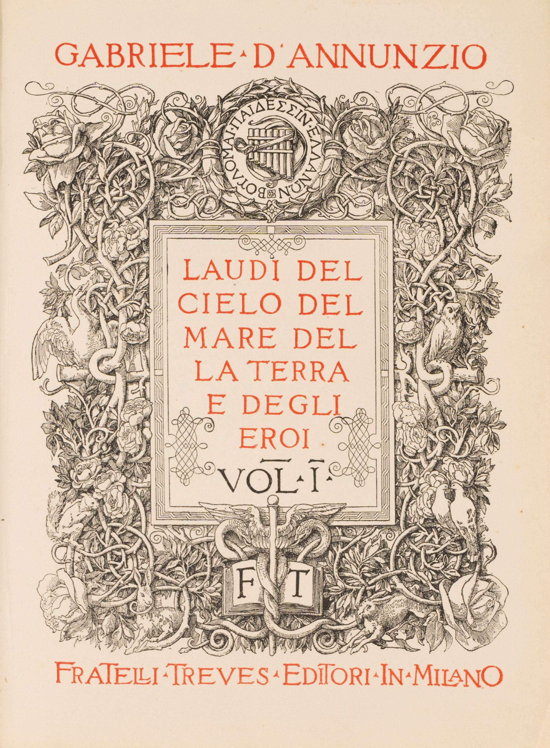 1903 Milano, Treves, 1903. 2 volumi in-4°. Frontespizio calcografico e illustrazioni nel testo di Giuseppe Cellini. Legatura editoriale in piena pergamena con bindelle in stoffa, alcune lacerate, decorazioni impresse in oro ai piatti anteriori con motivi fitomorfi nel I vol. e con la figura di un veliero nel II, titolo in oro al dorso. Esemplari in barbe.