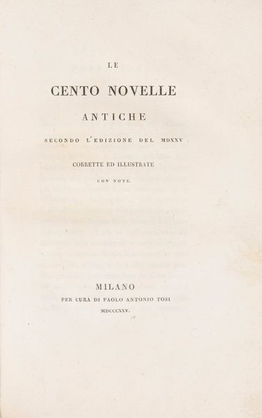 1825 Milano, Paolo Antonio Tosi, 1825. In 8°. Perfetto esemplare legato in mezza pelle verde e cartone marmorizzato dell'epoca. § La Fabula del Pistello da l'agliata tratta da un'antica stampa e la Quistione d'amore testo inedito del secolo XV . Bologna, Gaetano Romagnoli, 1878. In 8° piccolo, 175 x 120 mm. In antiporta riproduzione della xilografia originale quattrocentesca dell'edizione della Fabula . Esemplare n.7/202. Raffinata legatura coeva in mezza pelle con iscrizione in oro al piatto.