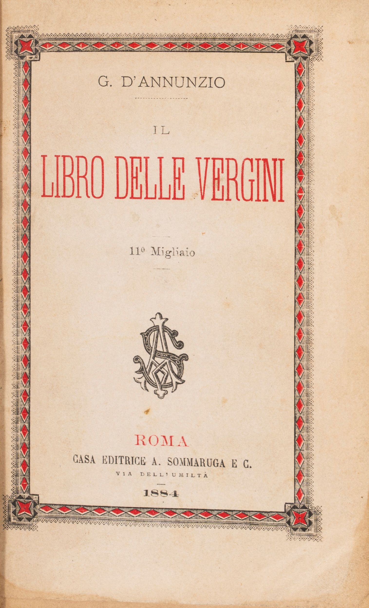 1936 Roma, per l'Oleandro, 1936. Brossura editoriale figurata, testo in ottime condizioni, fresco e in barbe. Copia appartenente alla tiratura di 3001 esemplari su carta di Pescia, esemplare n.2540. Guabello, 386; Falqui, p. 42. Insieme nel lotto: Il Libro delle Vergini. Roma, Sommaruga, 1884. In 8°. Prima edizione in ottimo esemplare. Il libro delle vergini è una raccolta di quattro racconti ( Le vergini; Favola sentimentale; Nell'assenza di Lanciotto; Ad altare Dei ). Si tratta della prima esperienza letteraria del poeta nel campo della prosa narrativa, dopo le raccolte poetiche Primo vere (1879) e Canto novo (1881): Terra vergine (1882) era infatti una raccolta di bozzetti in tema abruzzese.