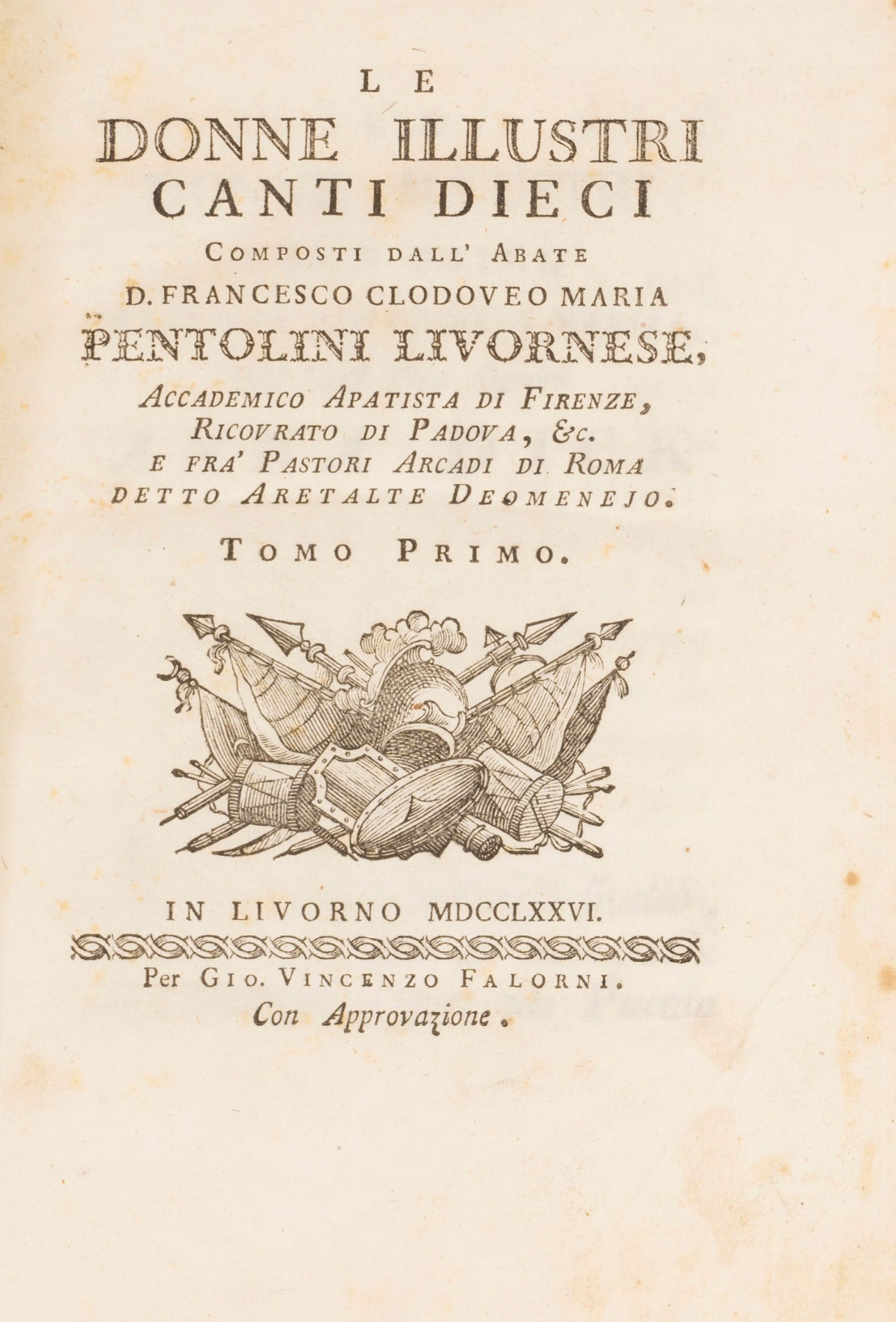 1776 Livorno, Gio. Vincenzo Falorni, 1776. In 8°. Due tomi in un volume ciascuno con proprio frontespizio. Fregio xilografico ai frontespizi, testatine incise in legno, qualche lieve fioritura, piccoli fori di tarlo all'angolo inferiore esterno degli ultimi fascicoli, 2 piccoli fori alla carta A1 del tomo II, legatura coeva in mezza pelle e carta marmorizzata, autore in oro entro tassello al dorso, parte superiore del dorso parzialmente staccata, lievi difetti.