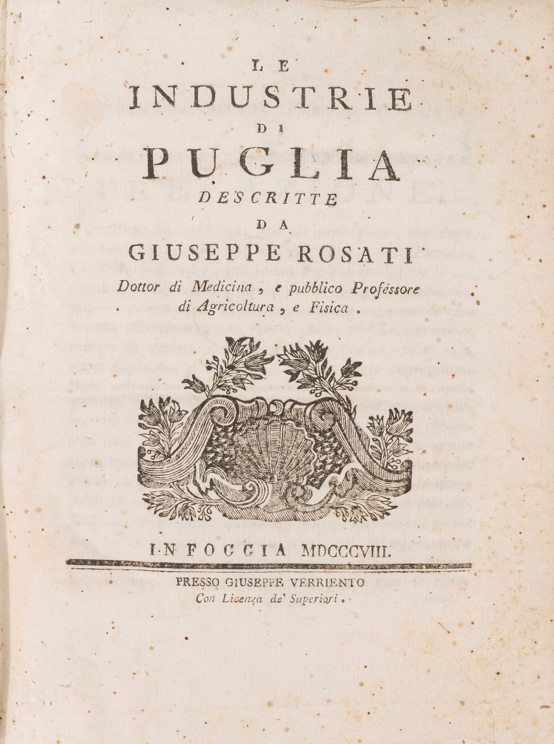 1808 In Foggia, presso Giuseppe Verriento, 1808. In 4°. Vignetta incisa su rame al frontespizio, con una grande carta geografica della Capitanata disegnata e incisa su rame dall'autore. Legatura coeva in mezza pergamena, tassello, titolo in oro al dorso, lievi difetti al dorso. Fioriture, leggera brunitura