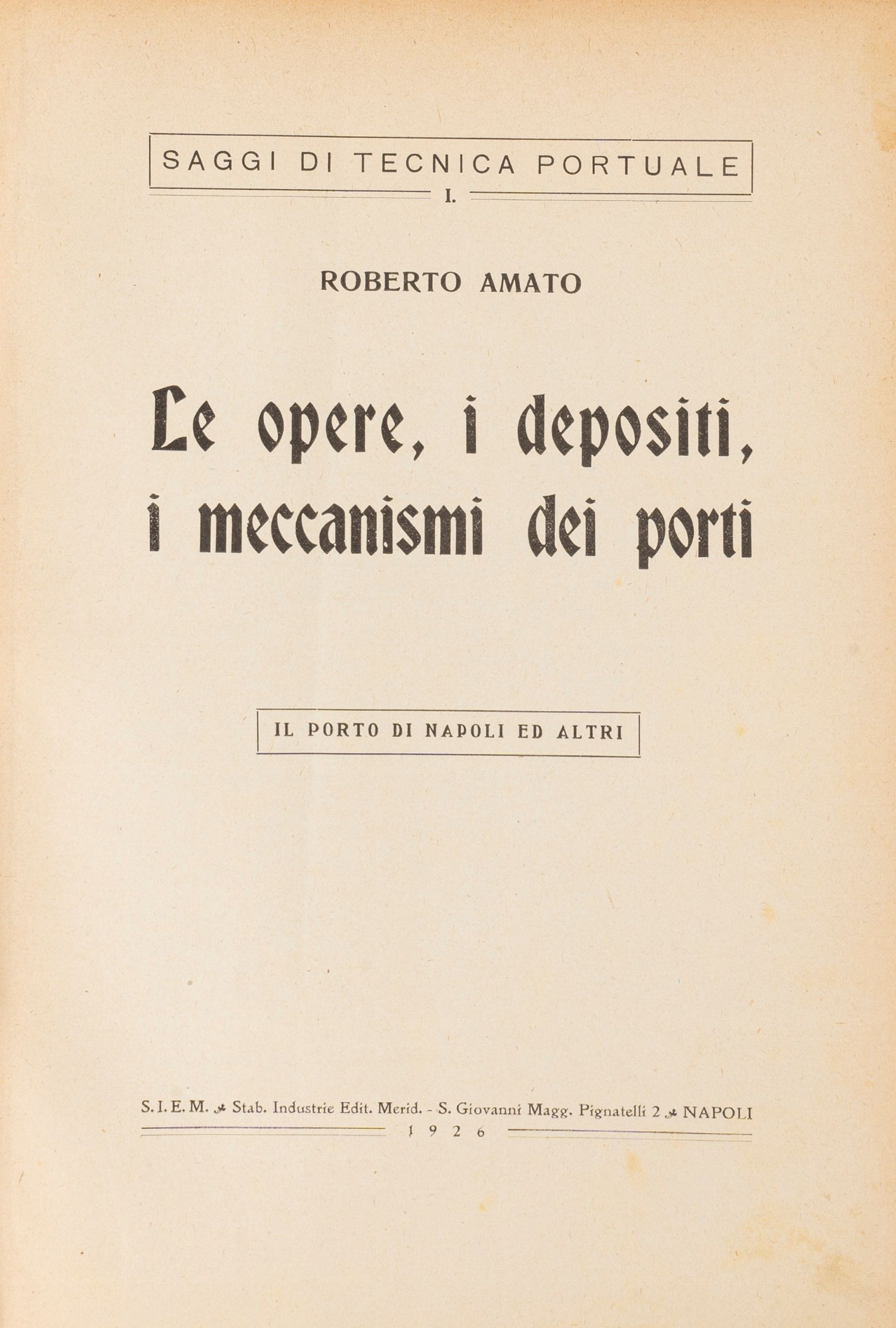 1926 Napoli, S.I.E.M., 1926. In 4°, pp. 254, con 13 illustrazioni nel testo una pianta topografica del porto di Genova e 10 grandi piante topografiche del porto di Napoli in cui sono evidenziati i vari progetti di sviluppo, modifiche ed ampliamenti. Legatura coeva in tela, titolo in oro al dorso, conservata la brossura originale.