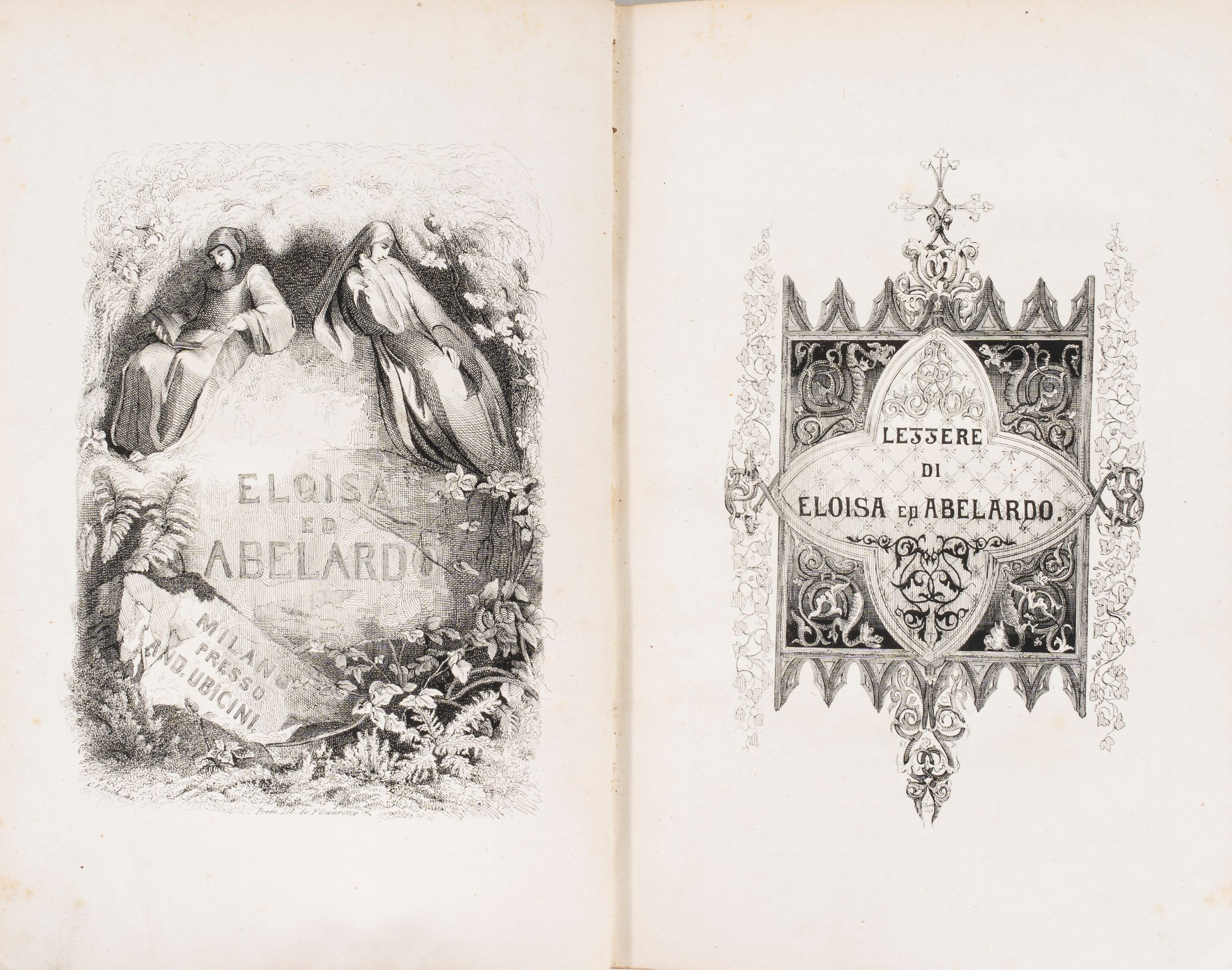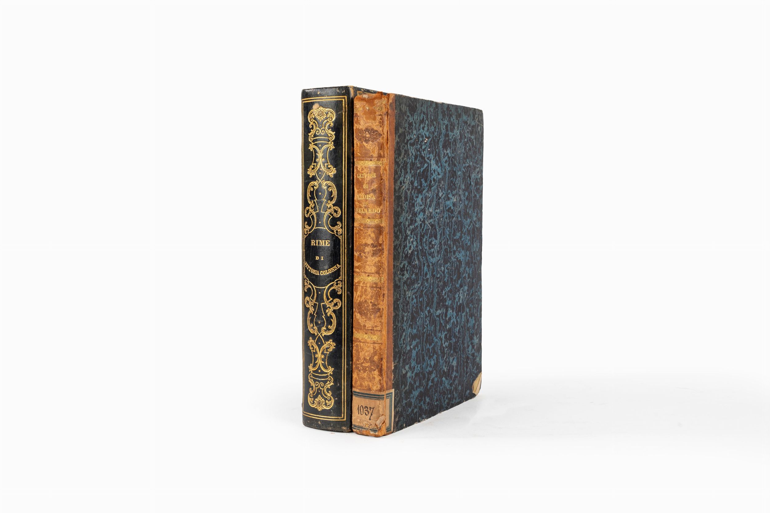 1840 Roma, dalla tipografia Salviucci, 1840. In 8° grande, 250 x 170 mm. Tre tavole incise f.t. col ritratto di Vittoria Colonna e due tavole di medaglie, sontuosa legatura d'edizione in marocchino blu decorata a secco ed in oro al dorso e sui piatti, al centro dei quali sono impresse le armi araldiche delle famiglie Colonna e Torlonia, tagli dorati. Insieme nel lotto. Lettere di Abelardo ed Eloisa...versione di Gaetano Barbieri . Opera illustrata da I. Gigoux. Milano, Andrea Ubicini, 1841. In 8° grande. Antiporta e frontespizio finemente illustrati, innumerevoli tavole fuori testo, legatura in mezza pelle coeva.