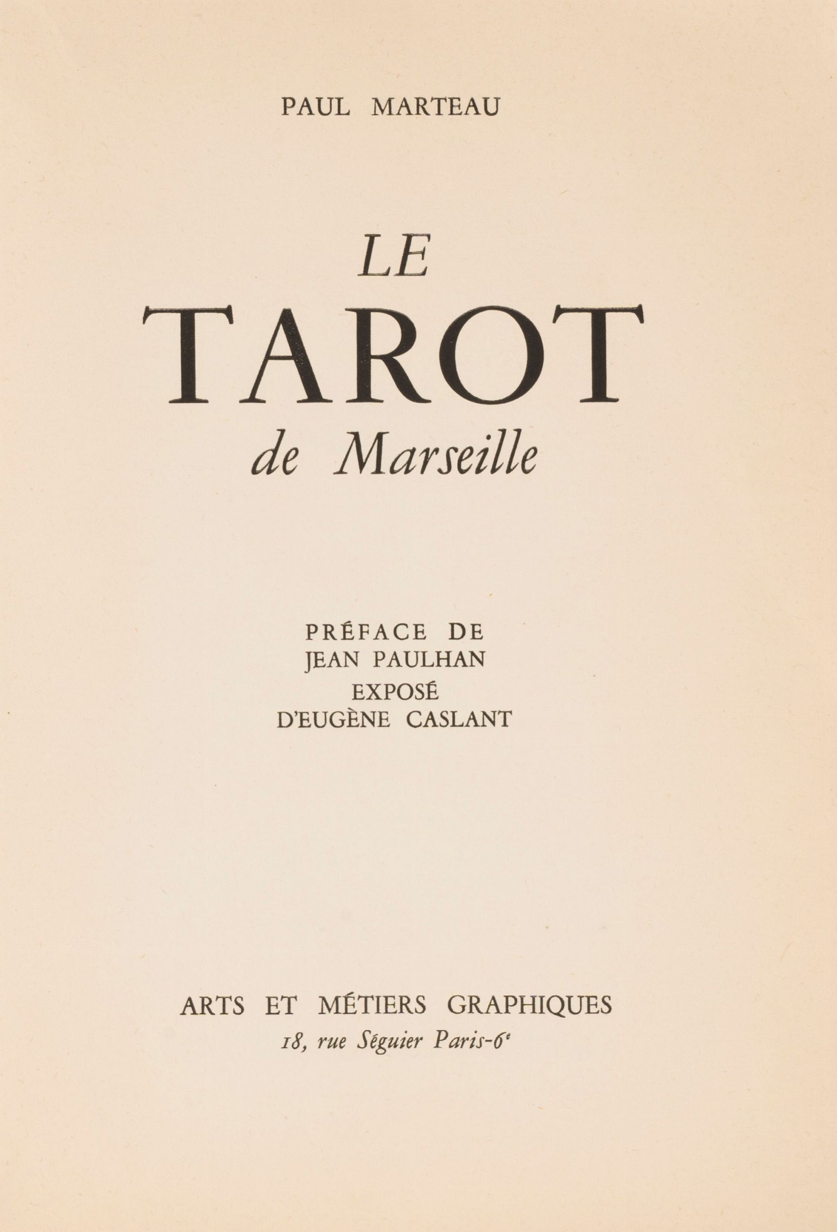 1949 Parigi, Arts et Mètiers Graphiques, 1949. In ottavo grande. Fregi impressi in nero nel testo, carte dei tarocchi a colori incollate nel testo. Brossura illustrata a colori, lievi difetti e segni del tempo.
