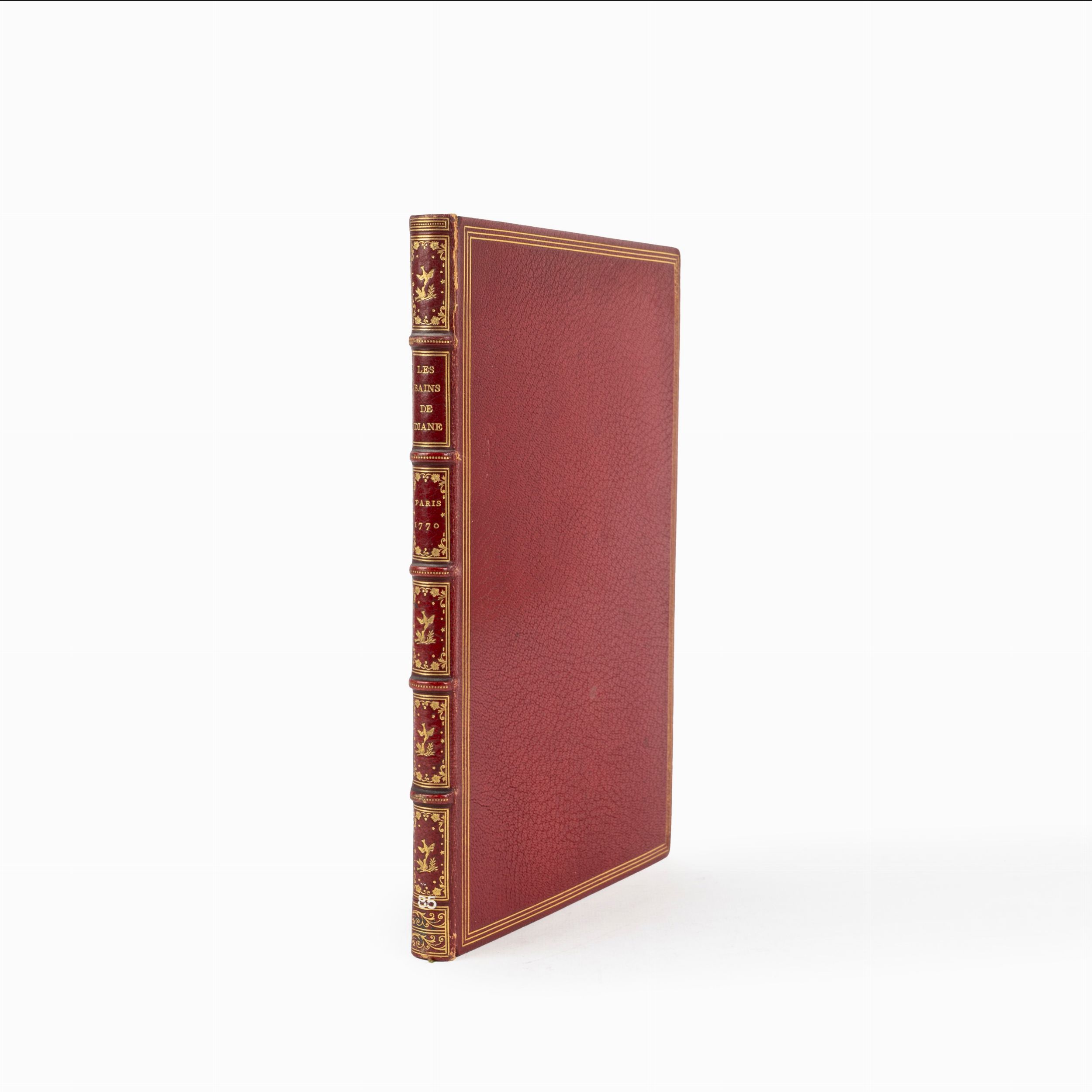1770 Paris, J. P. Costard, 1770. In 8°. Magnifico frontespizio figurato di Marillier inciso in rame da De Ghendt e 3 tavole fuori testo, sempre di Marillier, incise da Massard, Ponce e Voyez l'ainé, legatura d'amatore in pieno marocchino rosso ottocentesco - firmata da Reymann - con triplice filetto dorato ai piatti, dorso a comparti con preziose decorazioni e titolo in oro, bellissime dentelles dorate ai risguardi, tagli dorati. Ex libris al contropiatto con Gallo sopra una pila di libri e motto: 'Ognora desto - Dai libri di C. G.'