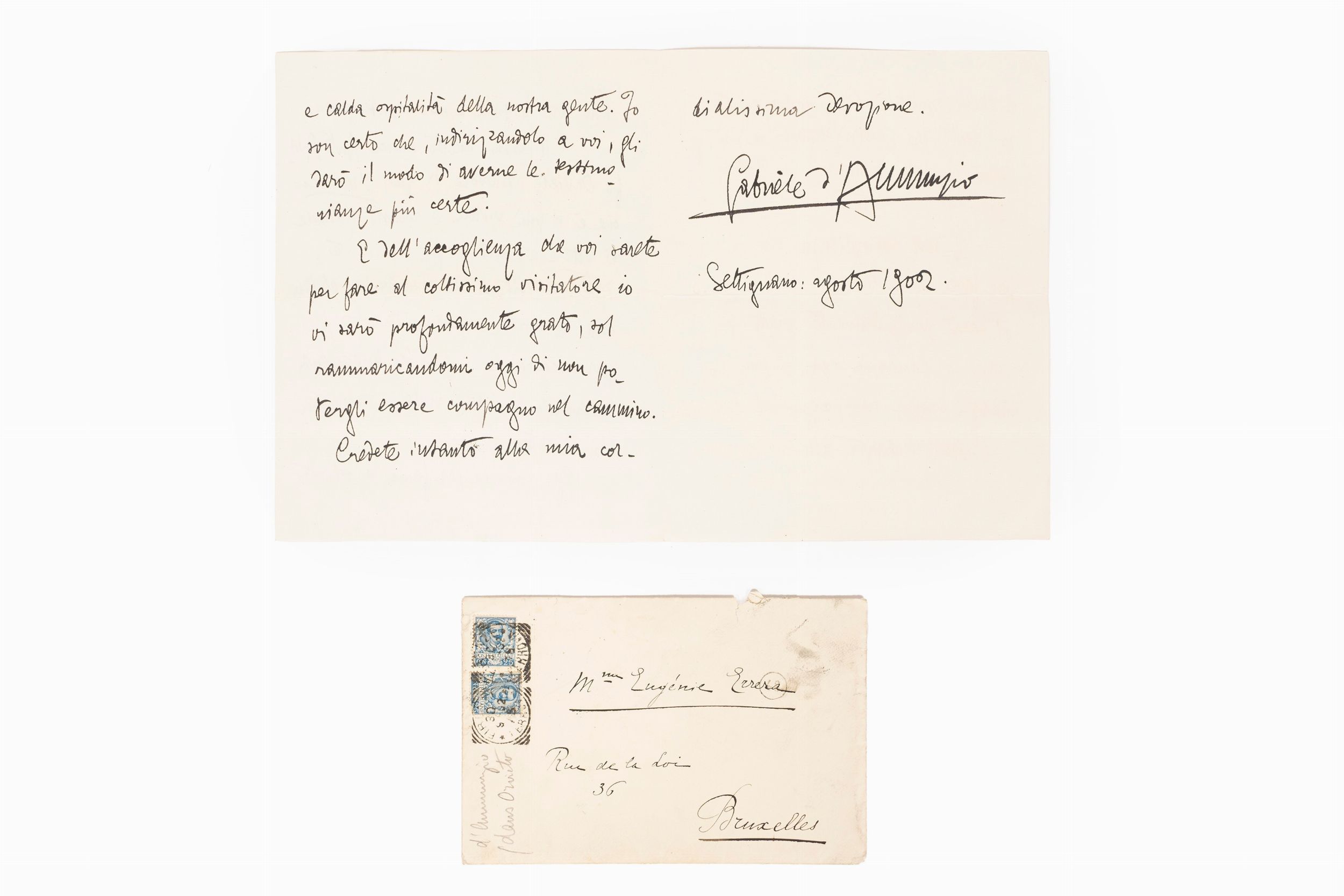 1902 Lettera autografa firmata in 4°, 2 pagine e mezzo, Settignano, agosto 1902. Allegata lettera di Adolfo Orvieto , direttore de Il Marzocco , su carta intestata de Il Marzocco , datata 30 settembre 1902, indirizzata alla sorella Eugenie Errera a Bruxelles, in cui si parla dell'invio dell'autografo di d'Annunzio come dono.