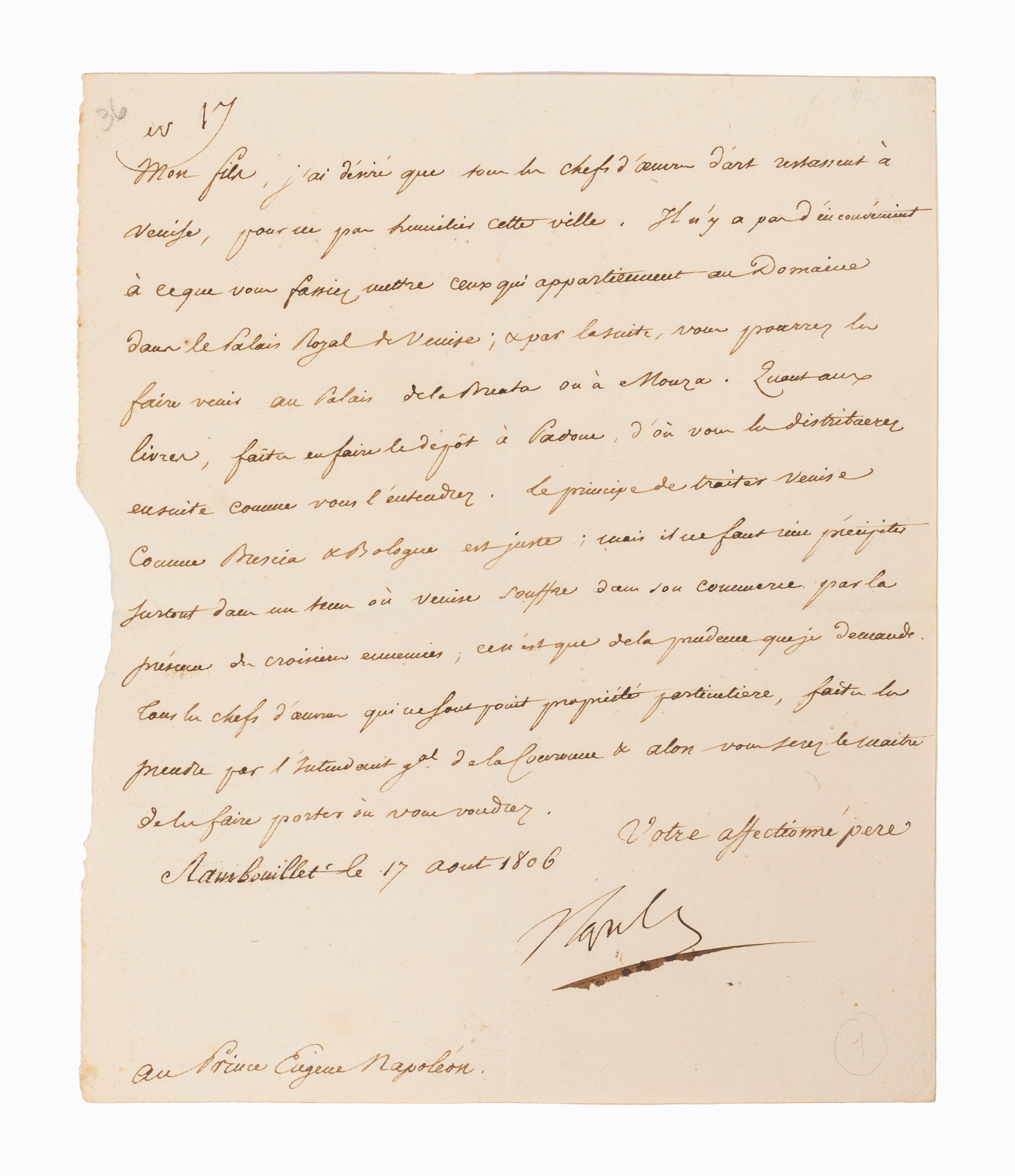 1806 Lettera sottoscritta da Napoleone al figlio, Principe Eugenio, inviata da Rambouillet il 17 agosto 1806, una pagina in 4°, 228 x 188 mm.
