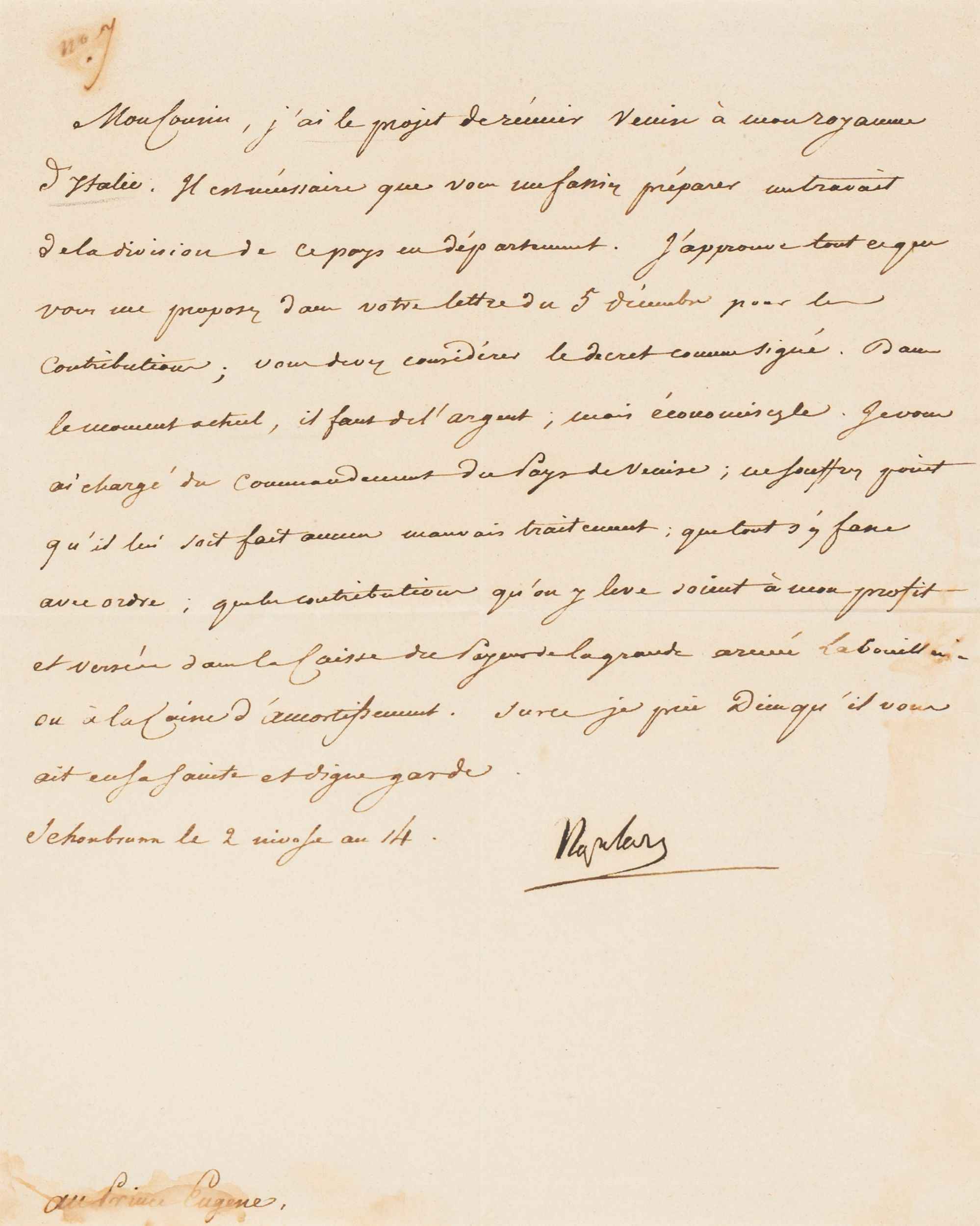 1805 Lettera sottoscritta da Napoleone al Principe Eugenio, inviata da Schonbrun il 23 XII 1805, in 4° 245 x 196 mm.