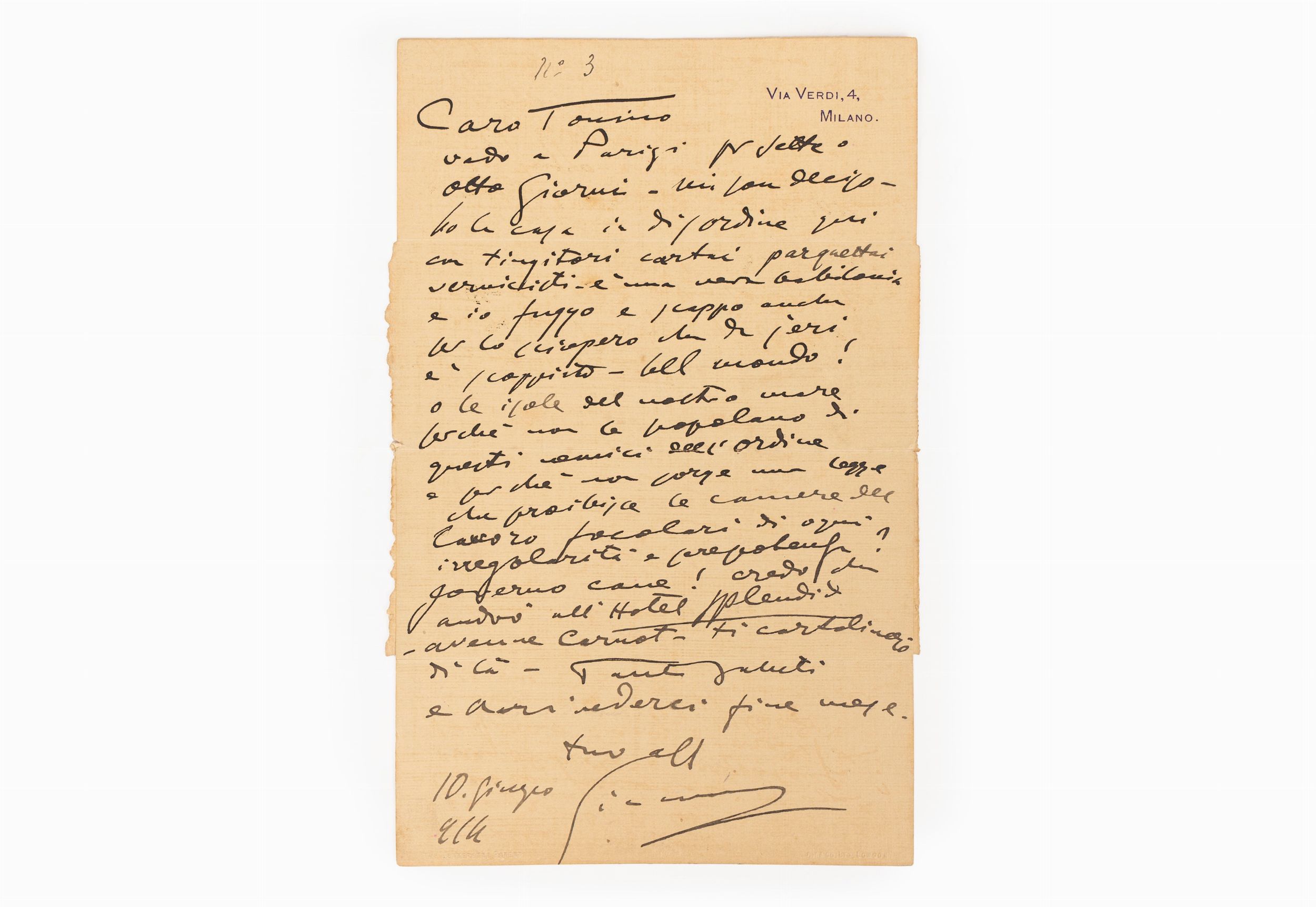 1914 Lettera autografa firmata in 4°, 247 x 156 mm., su carta intestata via Verdi 4 Milano, destinatario e affrancatura al verso, indirizzata ad Antonio Bertolacci, Torre del Lago (Pisa).