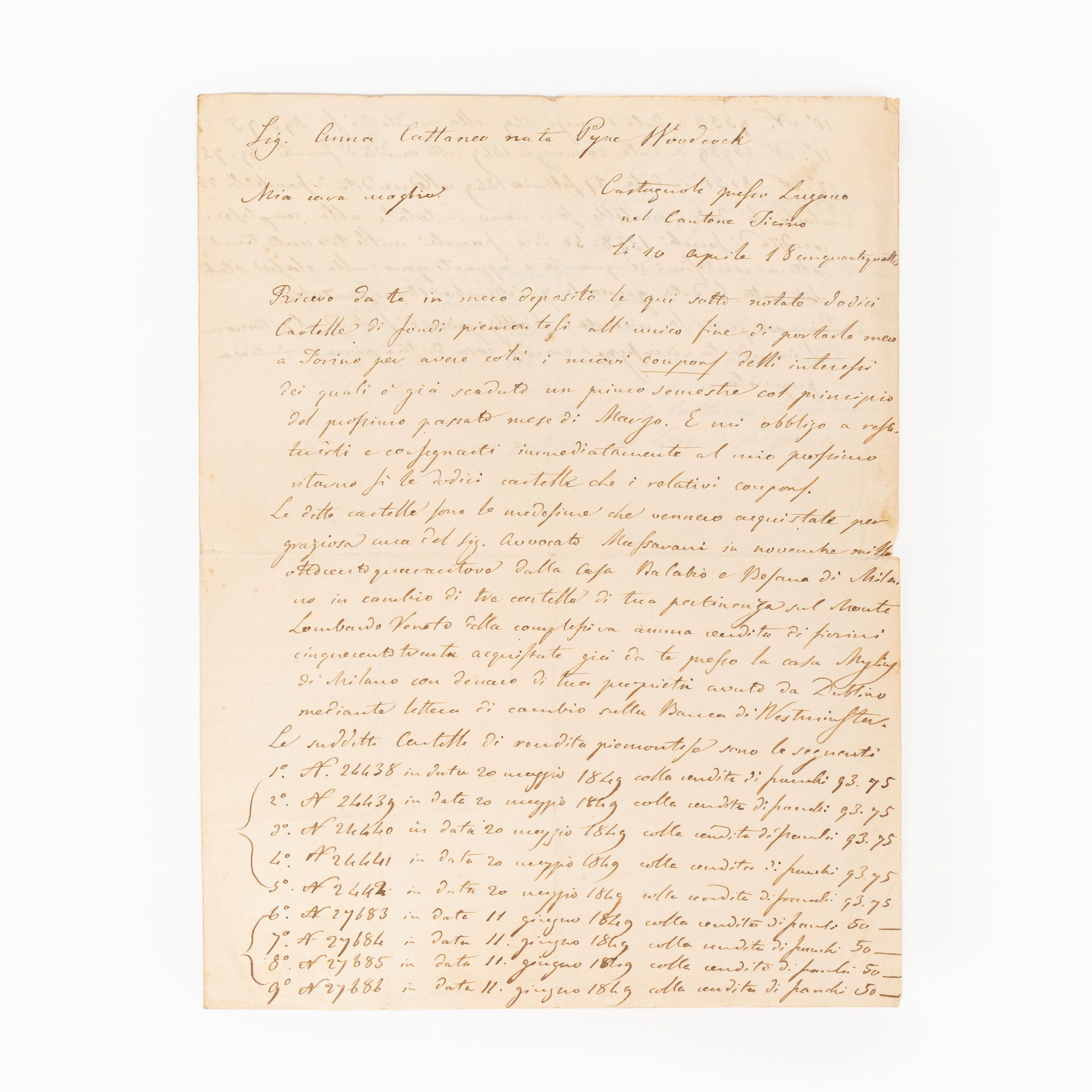 1854 Lettera autografa e testamento firmato, bifolio cartaceo in 4°, 273 x 208 mm., indirizzata alla moglie Anna Pyne Woodcock, sottoscritta presso Castagnole - Lugano in data 10 aprile 1854.