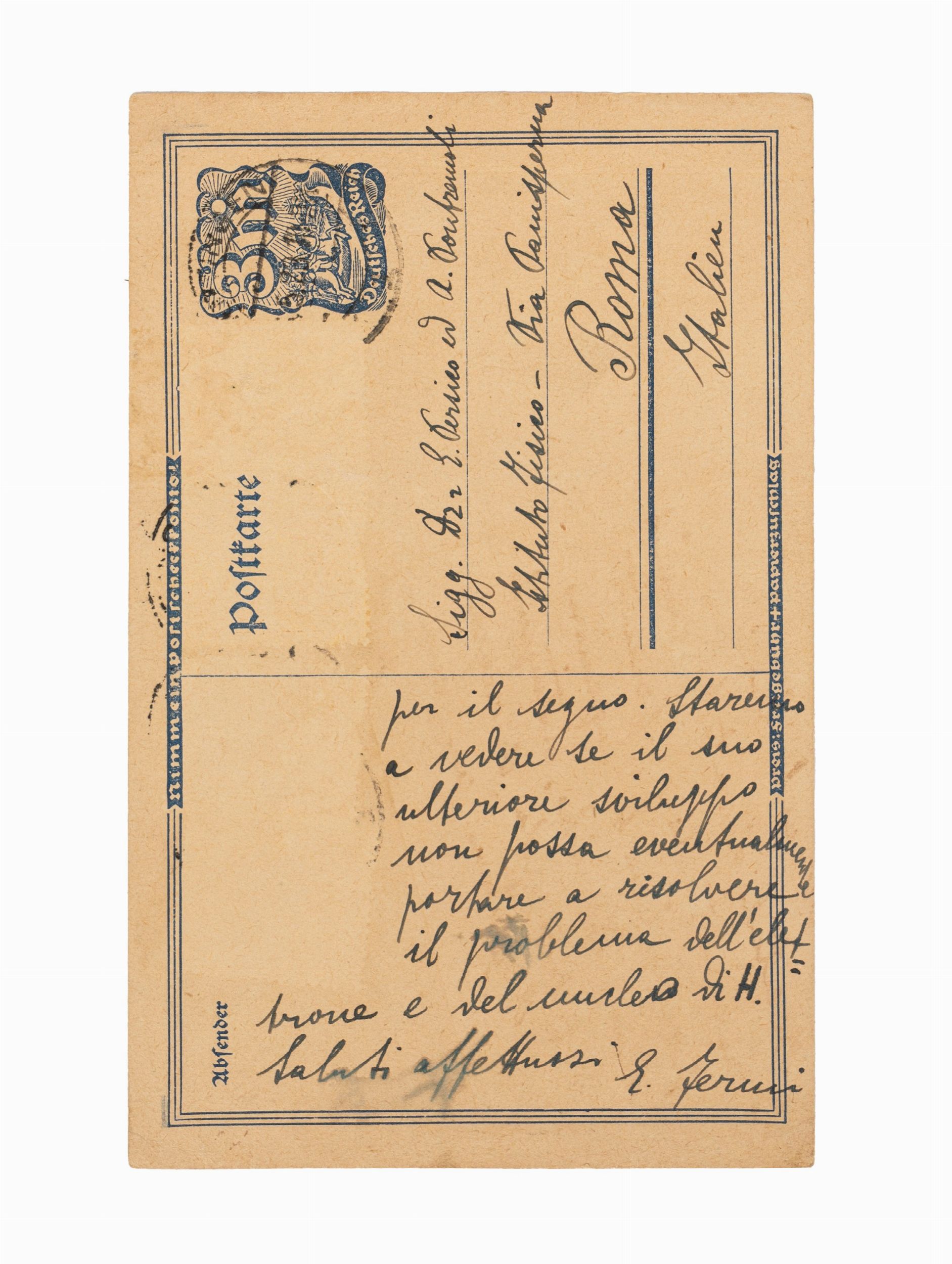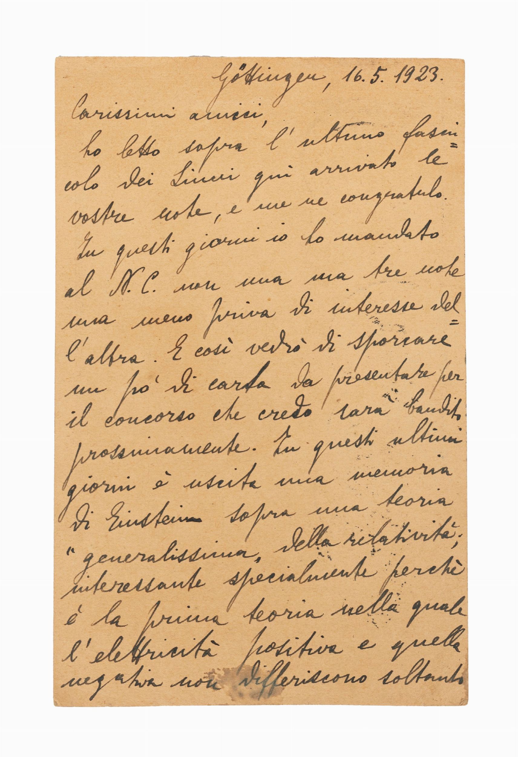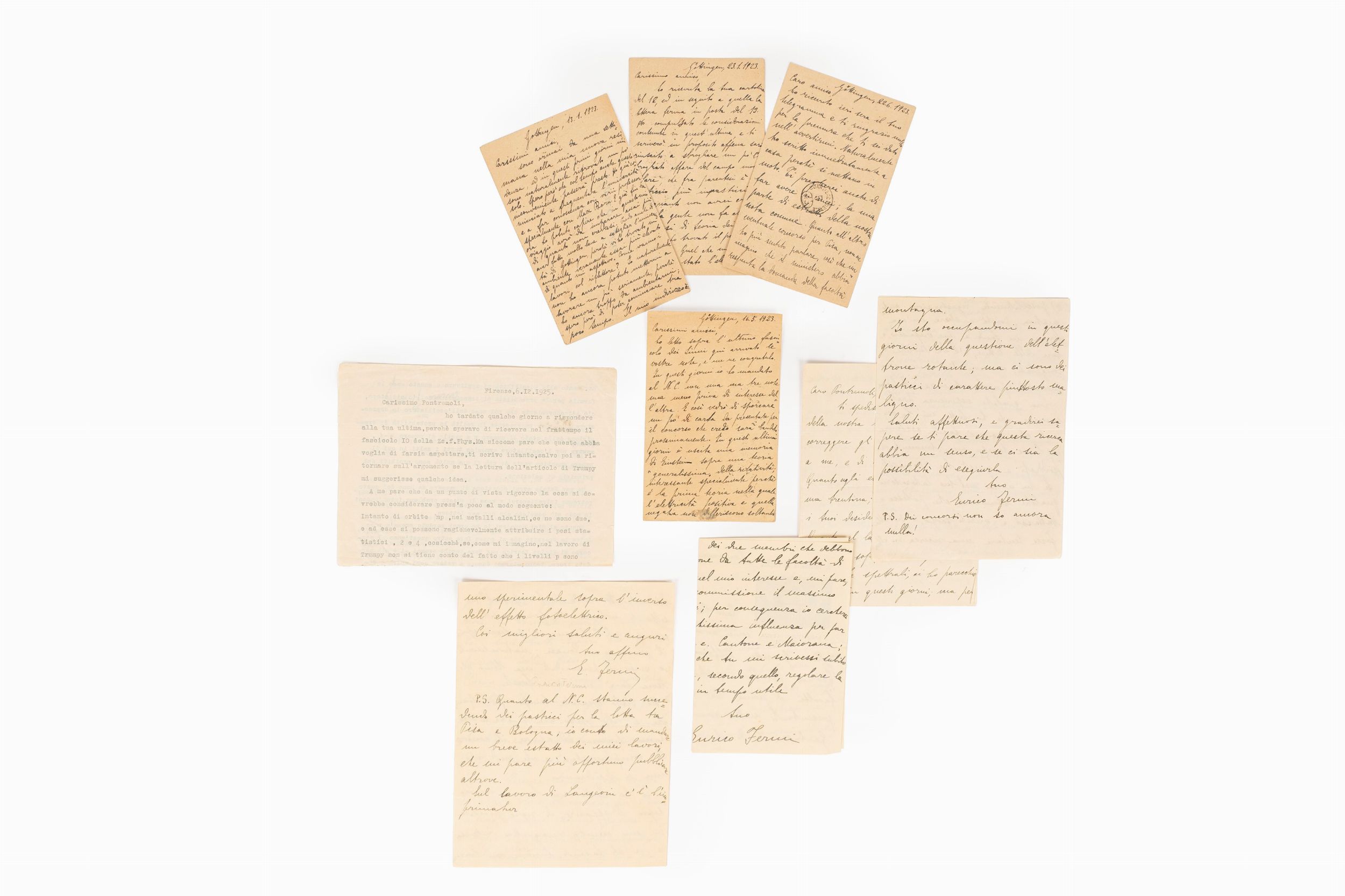 1923 Straordinario insieme di 9 lettere inviate dal giovane Enrico Fermi all'amico Aldo Pontremoli tra il gennaio 1923 e il giugno 1926. Si tratta di 5 cartoline postali autografe e firmate spedite da Gottingen tra il 13 gennaio e il 22 giugno 1923; una lettera dattiloscritta firmata inviata da Firenze il 6 dicembre 1925; tre lettere autografe e firmate inviate tutte da Firenze tra il 14 febbraio 1926 e il 9 giugno 1926.