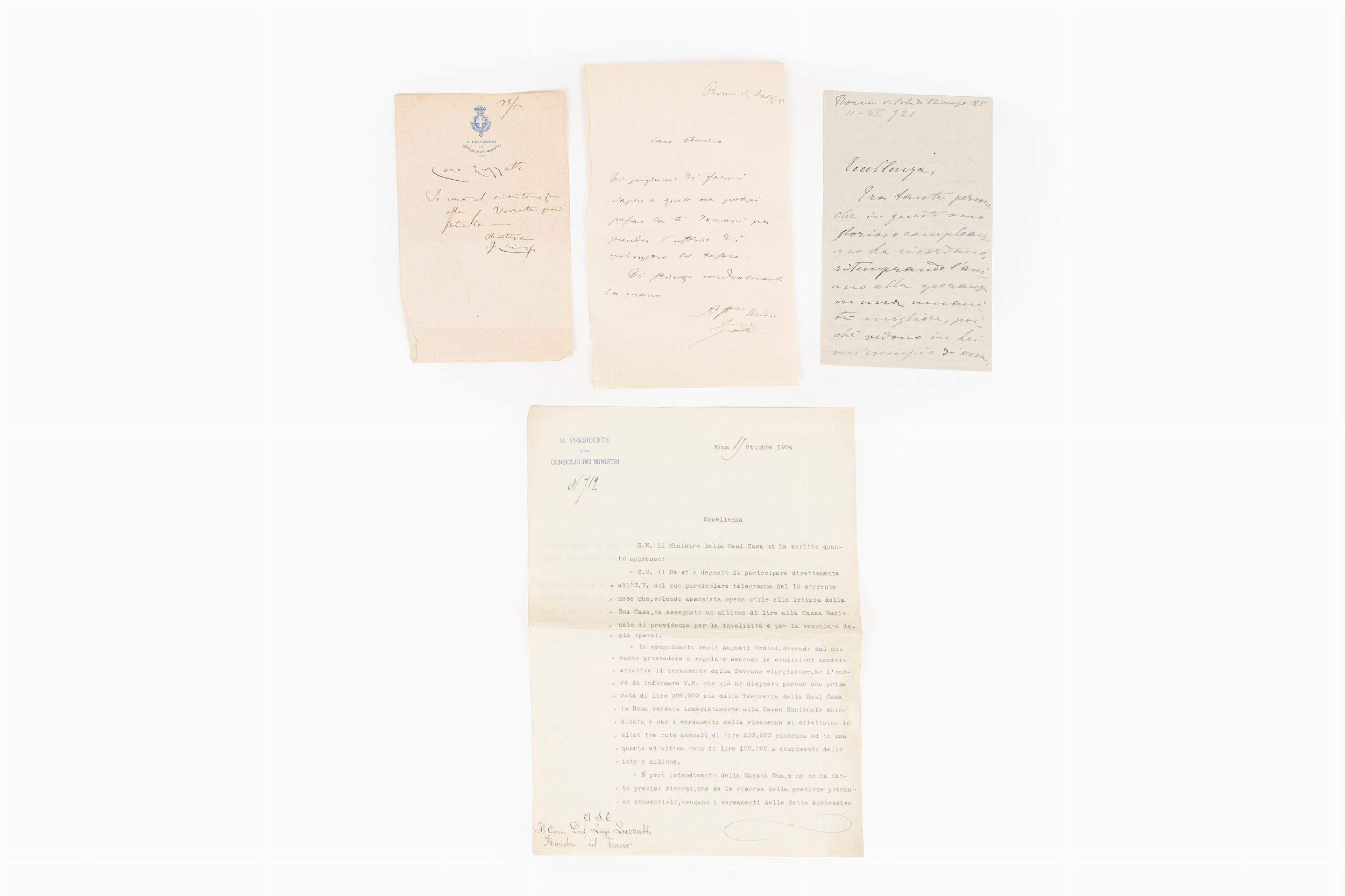 1892 Lettera autografa e firmata di Giolitti a Luzzatti , datata Roma 15 maggio 1892, in 8°, 210 x 133 mm.; lettera dattiloscritta e firmata da Giolitti, sempre indirizzata a Luzzatti, datata Roma 11 ottobre 1904; lettera di due pp. di Enrichetta Chiaravaglio Giolitti, datata 11 III 1921; biglietto di Francesco Crispi su carta intestata Il Presidente del Consiglio dei Ministri. Insieme nel lotto lettere di Zanella, Nigra, Cairoli, Mamiani, Ricasoli, Lanza, Scialoja, Rattazzi, Pelloux, Boselli, Villari, Caetani, Borromeo, Quintino Sella, Bonaldo Stringher, Gradenigo, Bonghi, Chiara etc.