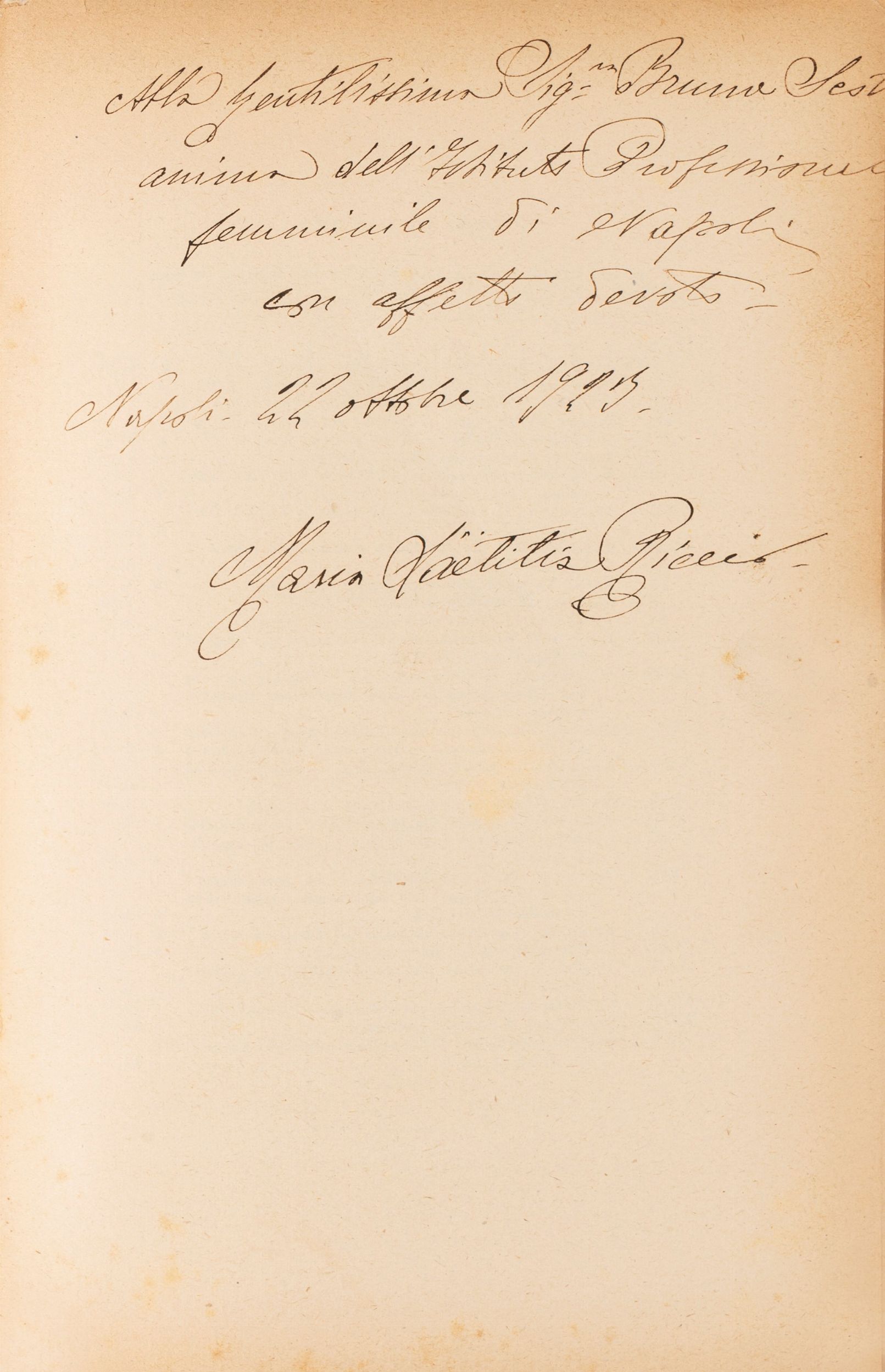 1923 Napoli, Stabilimento Tipografico F. Sangiovanni & figlio, 1923. In 8°. Dedica autografa dell'autore all'occhietto. Legatura in mezza tela, tassello, titolo in oro, copertine originali conservate. Leggera brunitura ai margini.