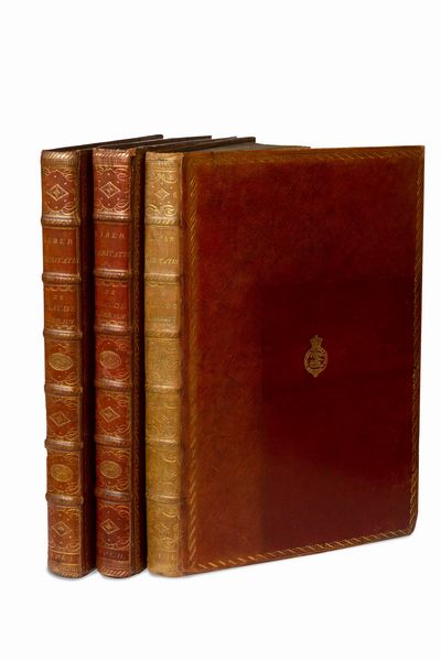 1877 Londra, Boydell, 1777- [1819]. In 2°. 3 voll. 2 ritratti (su 3), al tomo I e III, con 300 tavole incise a mezzatinta color seppia, ciascuna protetta da velina originale, bruniture, fioriture, arrossature sparse di diversa entità , eleganti legature in marocchino rosso coeve, decorazione impressa in oro, ai piatti cornice, al centro del campo tondo sormontato da corona con il motto ' honni soit qui mal y pense', dorsi a 5 nervi con autore, titolo e fregi in oro, il terzo tomo con decorazione diversa, qualche graffio, piccole mancanze, piatto anteriore con parto scolorite. Al contropiatto tassello cartaceo 'Bucher Sammulung von Ph. Nathusius'.