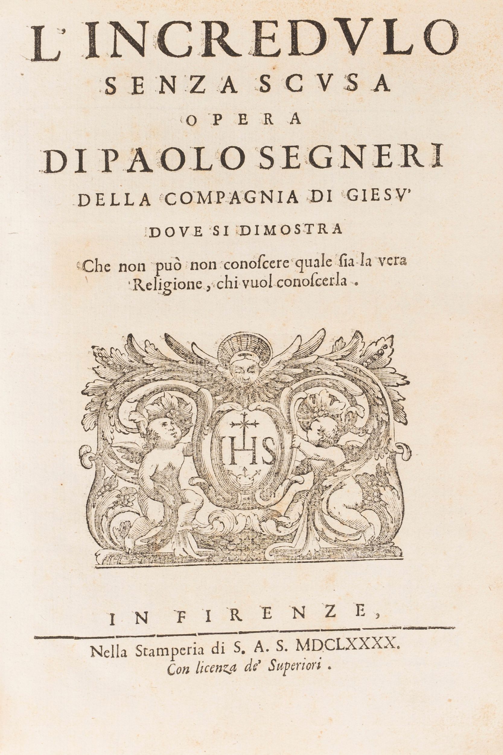 1690 Firenze, Stamperia di S.A.S., 1690. In 4°. Insegna dei Gesuiti sul frontespizio, iniziali, frontalini e finalini xilografici, lievi arrossature, legatura in pergamena rigida del sec.XIX con titolo su tassello rosso al dorso.