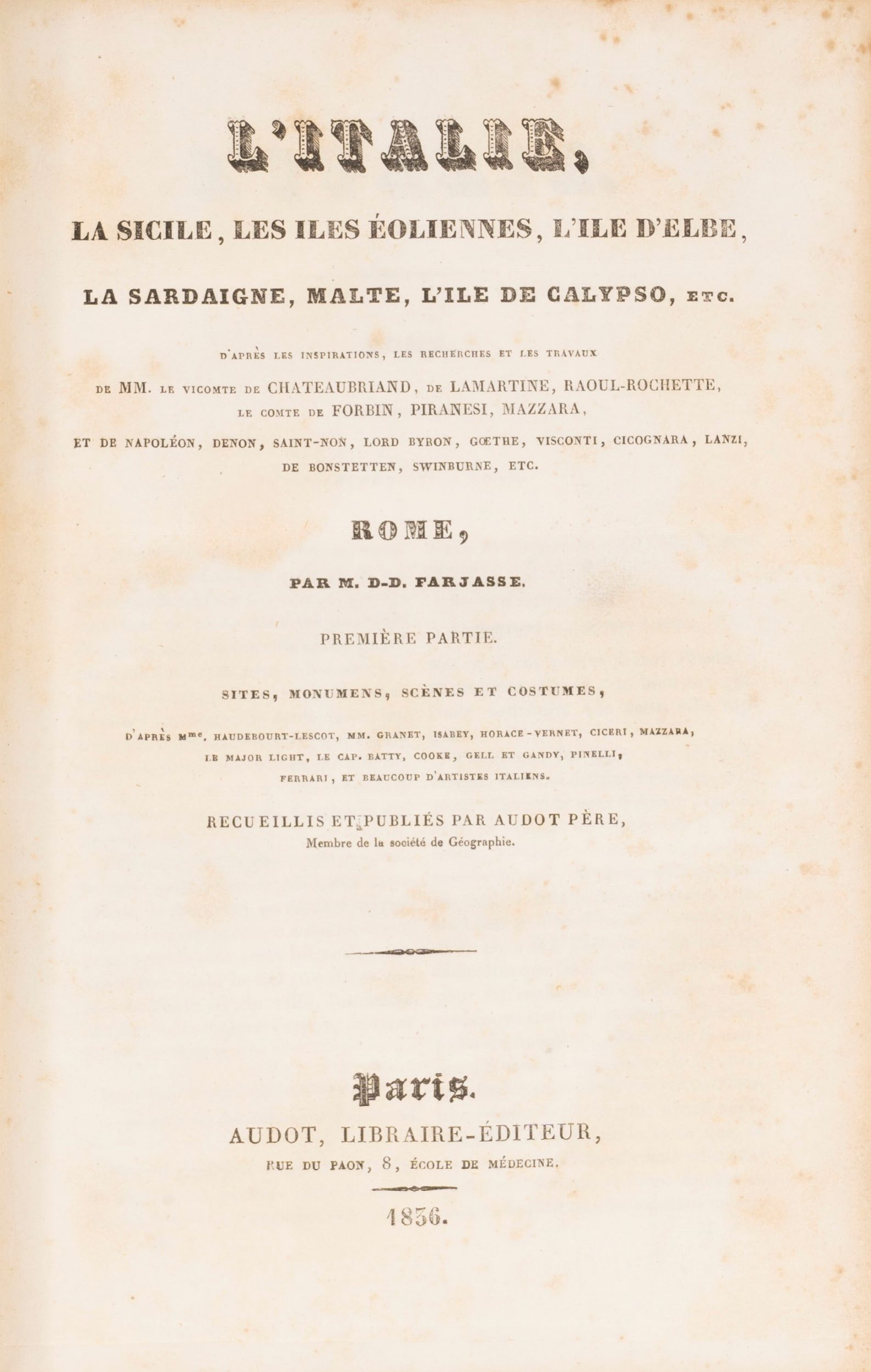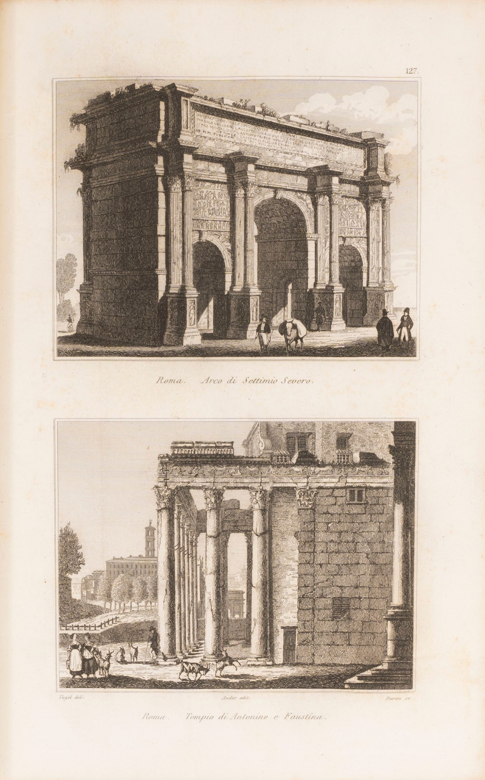 1836 Roma, Farjasse; Parigi, Audot, 1836. In 8°. Solo 2 voll. (di 8): Prima parte e seconda parte dedicati a Roma. Con 89 incisioni in rame nel testo, lievi fioriture sparse, qualche arrossatura, legatura coeva in mezza pelle e carta marmorizzata, titolo e fregi in oro al dorso a 4 nervi, piccole mancanze alle cuffie, lievi difetti.