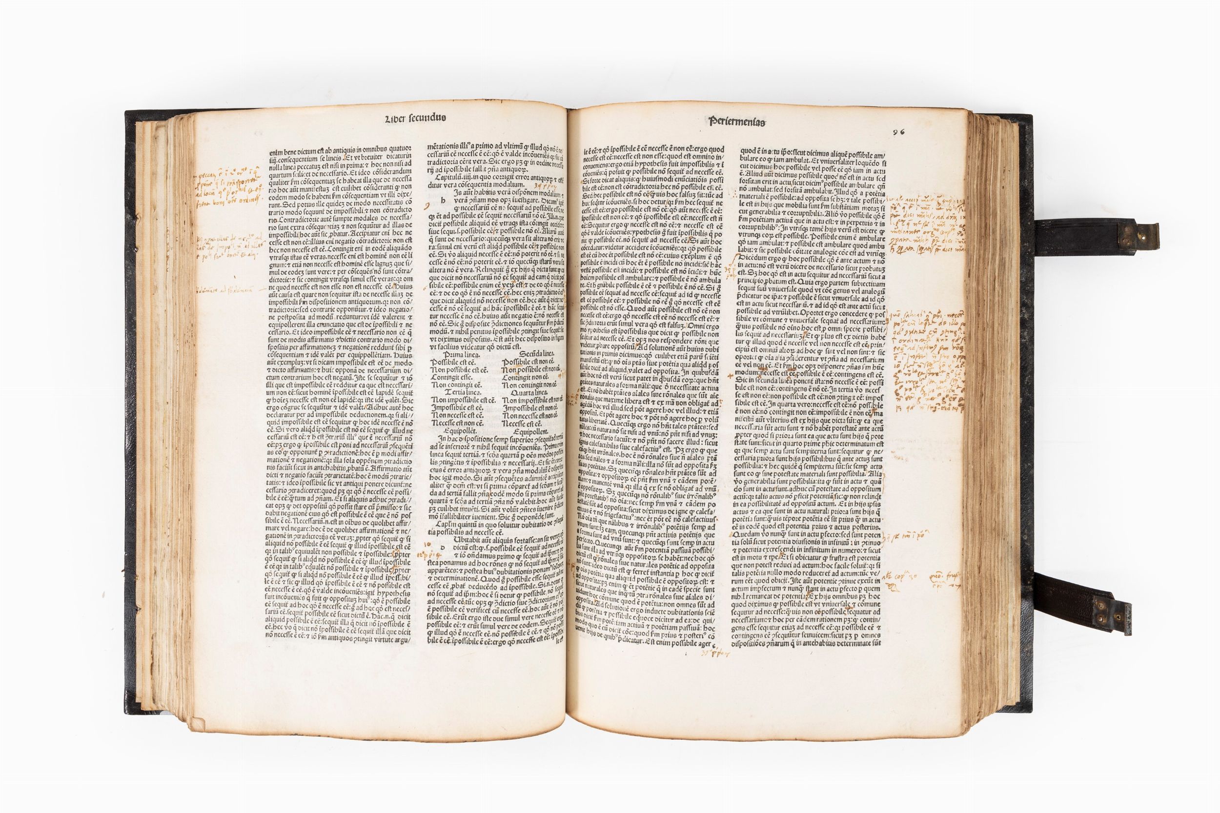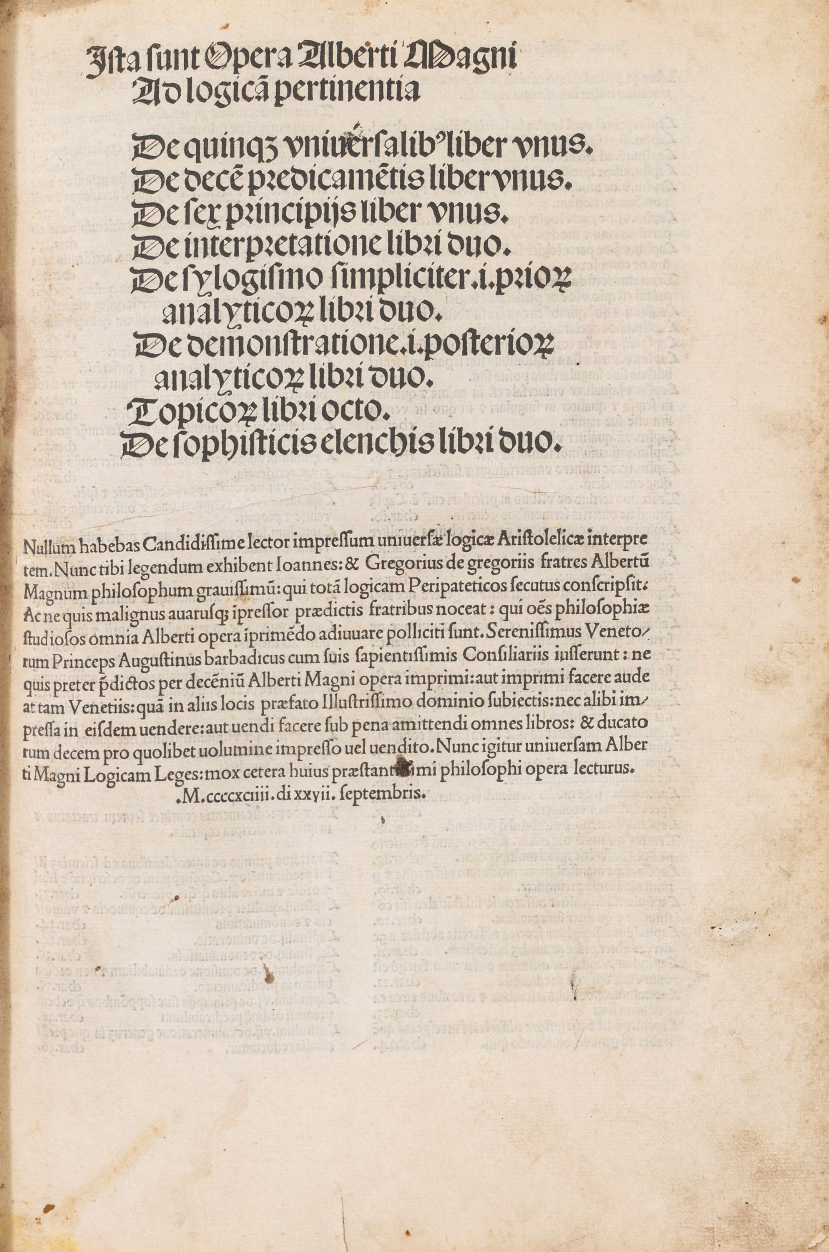 1494 Venezia, Johannes and Gregorius de Gregoriis de Forlivio, 15 giugno 1494, 27 settembre 1494. In 2°. Elegante frontespizio con titolo impresso in caratteri gotici di grande formato, seguito da un lungo testo in carattere romano di concessione dei diritti di stampa da parte della Repubblica Veneta (uno dei primi esempi di moderno copyright), carta iniziale a recto con testo in rosso e nero, testo stampato in caratteri gotici su due colonne, titoli in rosso, spazi per capilettera con letterine guida, qualche diagramma e figura geometrica nel testo, alle ultime 4 carte aloni di umidità non invasivi, marca tipografica al verso del colophon, legatura moderna in stile in marocchino scuro con fregi a secco, dorso a cinque cordoni, chiusura a fermagli metallici. Esemplare fittamente postillato da mano coeva.