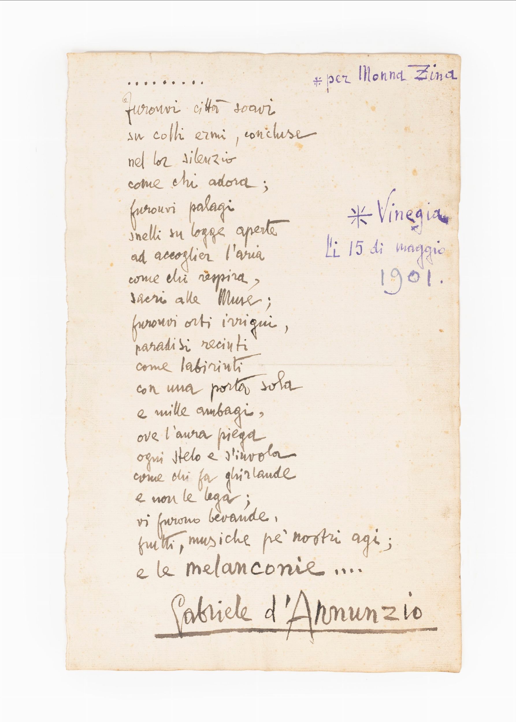 1901 Autografo firmato con dedica, su un doppio foglio verticale di carta misurante 420 x 270 mm., dedica a inchiostro color indaco '*per Monna Zina * Vinegia l'i 15 di maggio 1901.' Versi 337-357 di Maia, Laus Vitae (ed. critica a cura di Cristina Montagnani, pp.37-38).