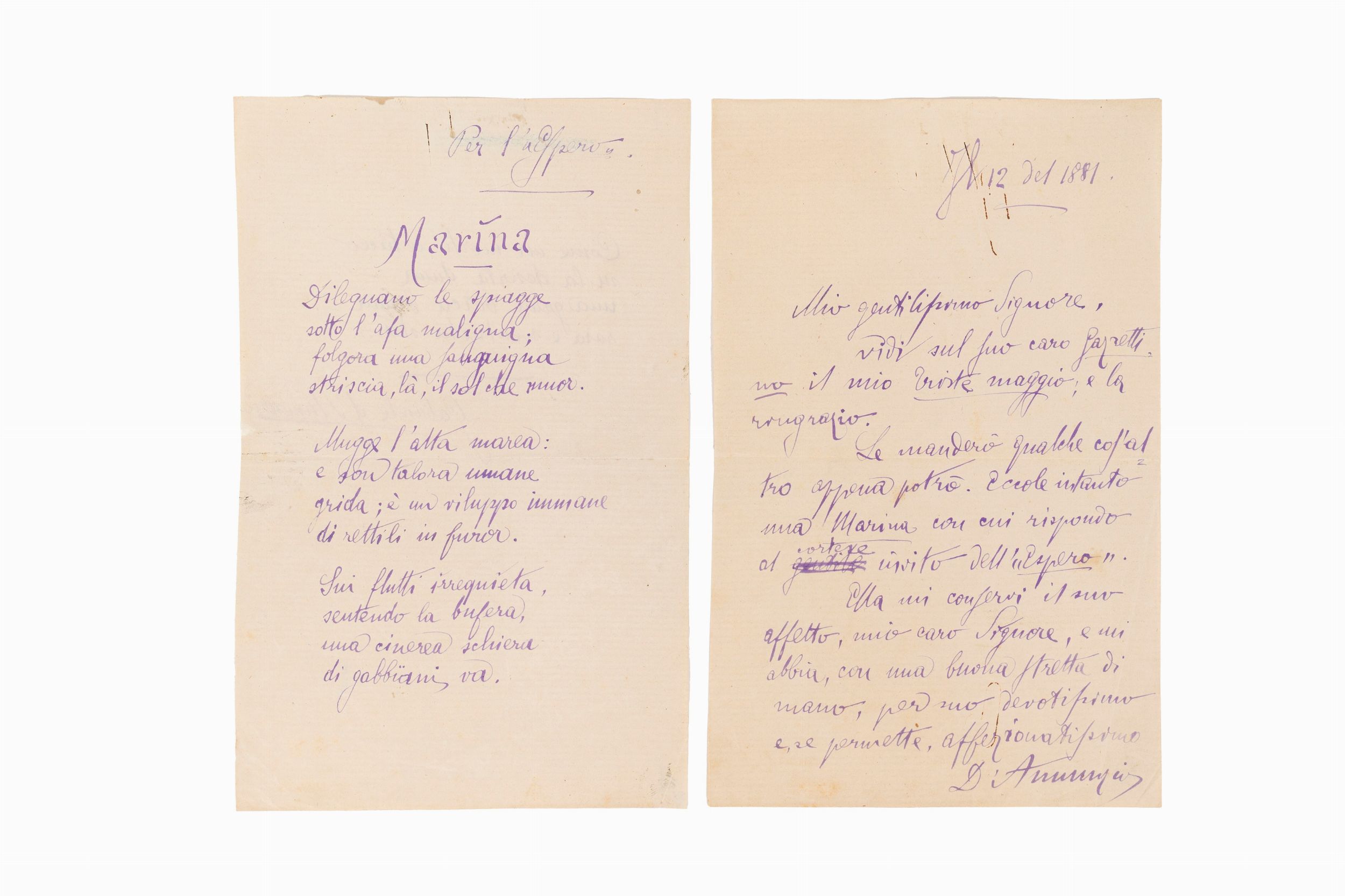1881 Poesia autografa firmata, 4 quartine su due pagine, 210 x 132 mm., unita una lettera autografa firmata che accompagnava la stessa poesia.