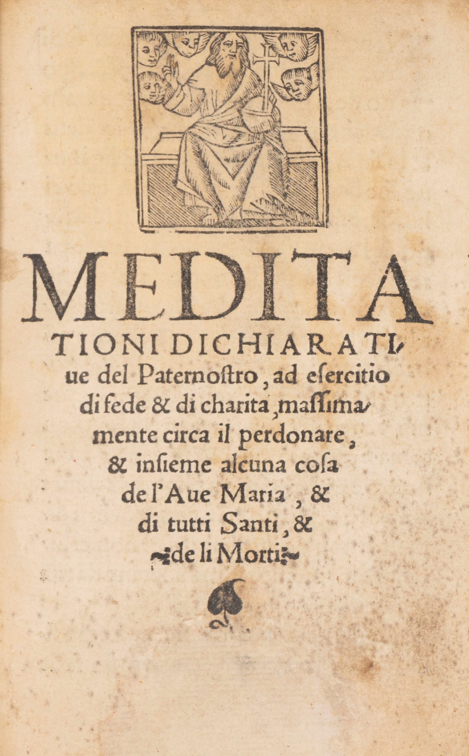 1534 Venezia, per maestro Stephano da Sabio a san Fantino, sotto le colonne, a la Madonnetta, 1534. Legato con. Pratica de li sacramenti, & incidentemente vn poco del Purgatorio, & de la fede & de le opere . Venezia, per Stephano da Sabio, 1534. Legato con. De la Ave Maria, & del Credo, & dimonstrare in qual cosa debbiamo haver fede in Dio . Venezia, Stefano da Sabio, 1535 marzo. In 8°. Vignetta xilografica al frontespizio, restauro al margine inferiore del frontespizio, senza perdita, sporadiche arrossature e piccolo foro al margine inferiore bianco del frontespizio dell'ultima operetta. Legatura moderna in piena pergamena.