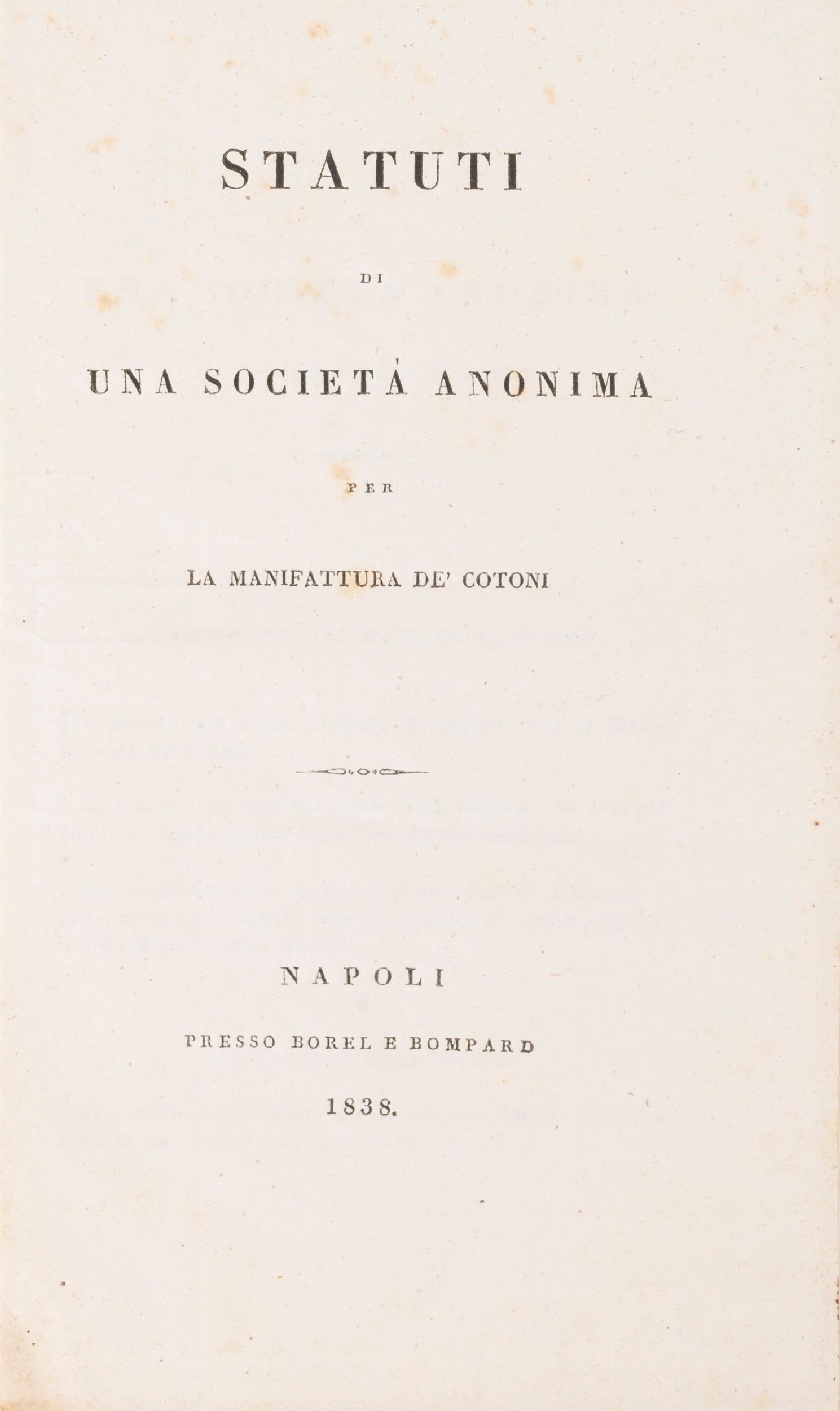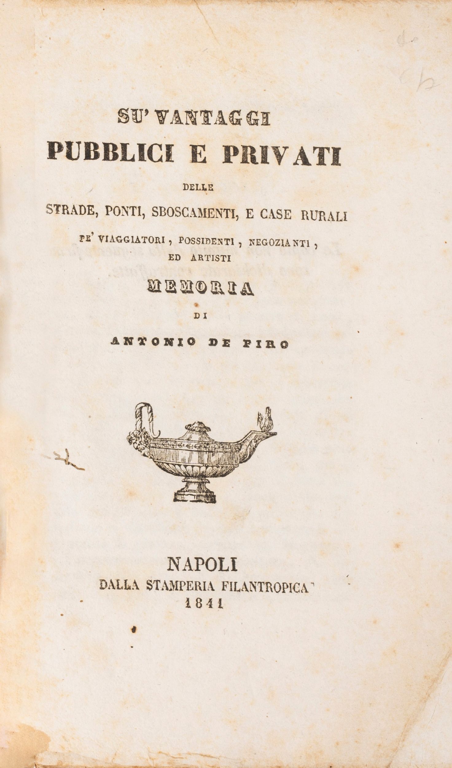 1821 Napoli, Chianese, 1821. In 16°, pp. 63-(3). Cartonato. Edizione originale. Raro. § Insieme: Statuti di una società anonima per la manifattura dei cotoni . Napoli, Borel e Bompard, 1838. 8, pp. 19 con un fac-simile 'Formola d'azioni' ripiegato f.t. Copertina muta. Fioriture sparse. § De Piro, Antonio. Su' vantaggi pubblici e privati delle strade, ponti, sboscamenti e case rurali pe' viaggiatori, possidenti negozianti ed artisti . Napoli, 1841. 16°, pp. 38-(2). Brossura editoriale. Raro. Leggera brunitura, fioriture sparse.