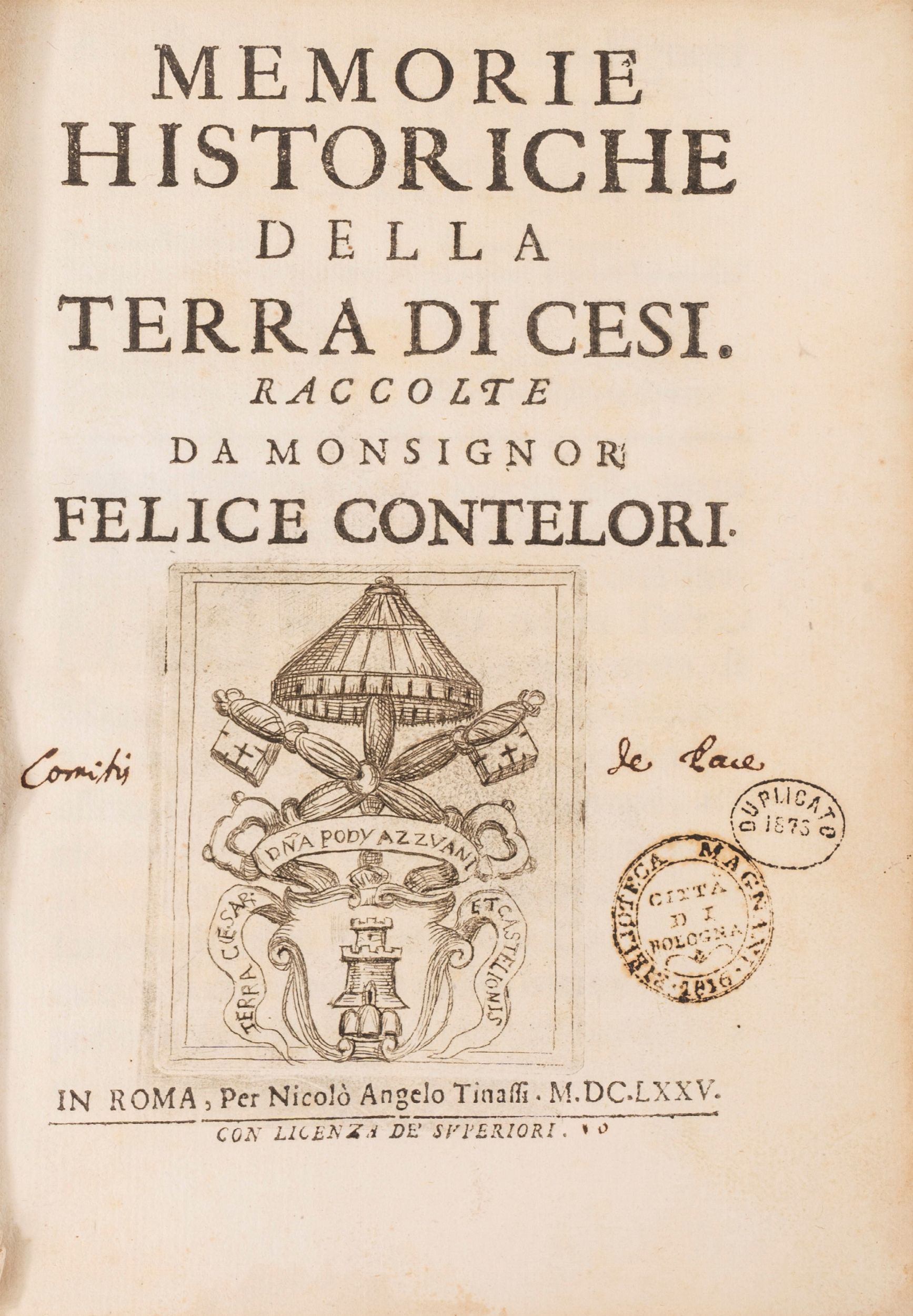 1675 Roma, per Nicolò Angelo Tinassi, 1675. Legatura coeva in piena pergamena con impressioni in oro ai piatti, strappi al piede del dorso. Lacerazioni ai fogli di guardia. Esemplare corto di margini. Arrossature e bruniture sparse. Al frontespizio timbri di appartenenza di biblioteca estinta e la certificazione di duplicato.