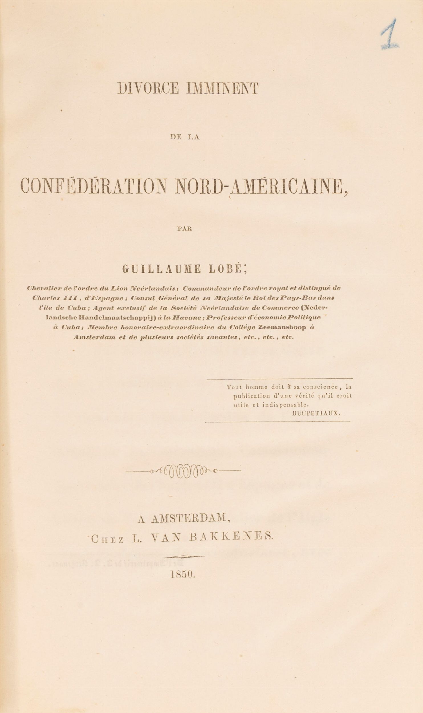 1850 Miscellanea con testi in francese di natura prevalentemente geopolitica e militare tra cui: Divorce imminent de la Confédération Nord-Americaine , Amsterdam, L. Van Bakkenes, 1850. Considerations sur les Tendances de l'Epoque , Anversa, Buschmann, 1855. Considération sur la Campagne en Crimée , Bruxelles, Stapleaux, 1854 (con una grande mappa ripiegata). Revue des Evénements militaires en Orient , Bruxelles, Charles Muquardt, 1854 (con grande mappa ripiegata). Notice sur le Mer Noire, sur son littoral et sur les principaux forts , Bruxelles, G. Stapleaux, 1854 (con due grandi mappe ripiegate). La Vèritè sur la question des Lieux-Saints , Malta, 1853. Réponse a quelques journaux relativement aux Affaires de Turque , Bruxelles, F. Michel, 1853. Le Royaume de Naples et la Pression Etrangére , Bruxelles, de Korn, 1857. Legatura coeva in mezza pelle, al dorso in oro 'Miscellanea 2' e tassello bibliotecario, lievi difetti.