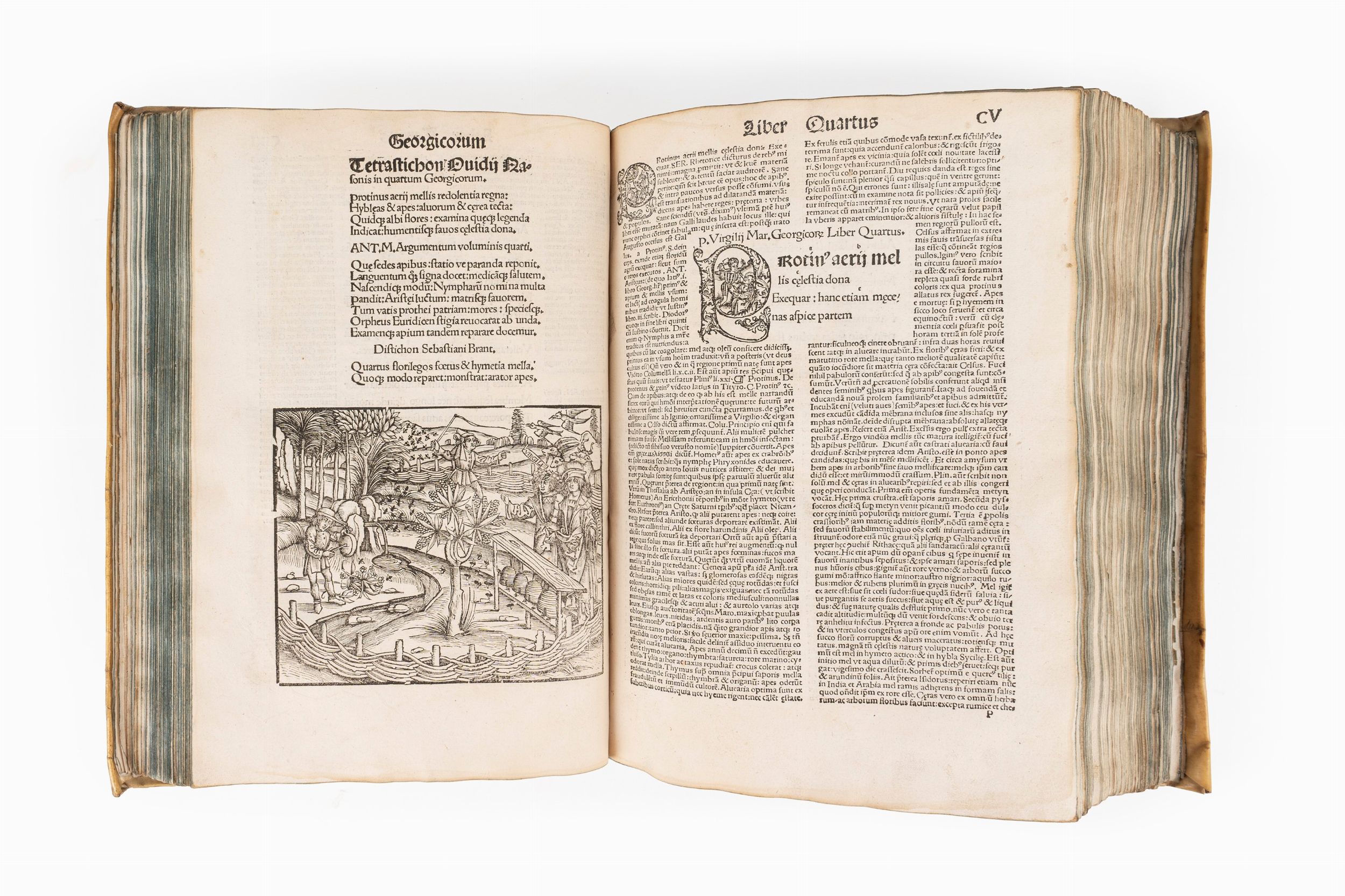 1502 Strasburgo, Gruninger, 1502. In 2°, 294 x 204 mm. Edizione curata da Sebastian Brant . Titolo stampato in rosso e nero, 214 grandi illustrazioni xilografiche tra cui la xilografia del titolo e un'illustrazione a doppia pagina, iniziali xilografiche istoriate, marca dello stampatore al colophon, alcune illustrazioni colorate, restauri alla prima carta senza perdite, altri restauri al margine inferiore di alcune carte, arrossature, piccoli forellini, legatura in piena pergamena rigida cinquecentesca.