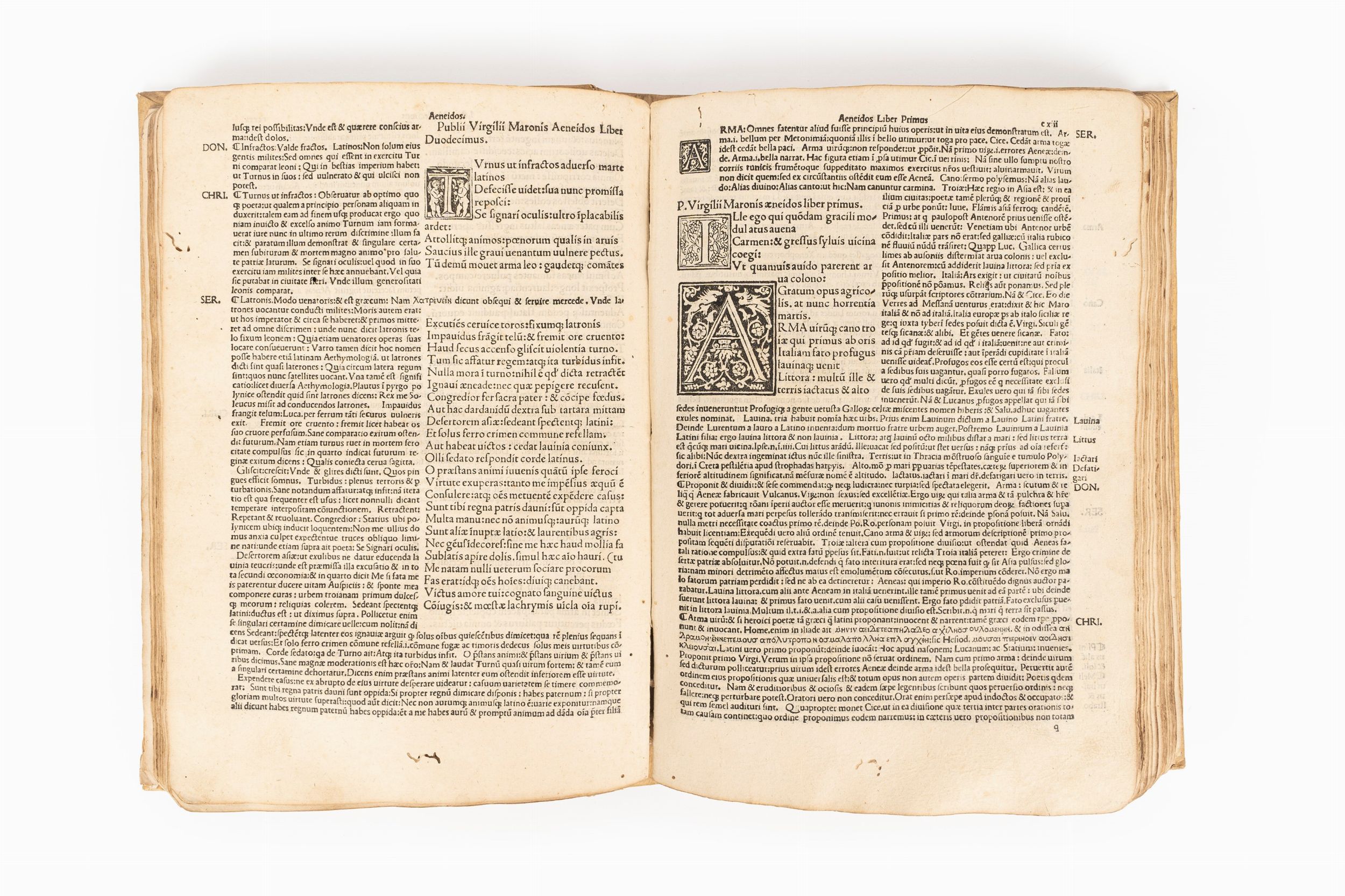 1500 Venezia, [Albertinus Rubeus Vercellensis] per Lucantonio fiorentino, 27 agosto 1500. In 2°. Occhiello iniziale, dedica di Antonio Mancinelli al pontefice, testo in carattere romano con commento, capilettera figurati, forellini, aloni di umidità , restauri delicati al margine della I carta, strappo al margine esterno di p.96 e 124, riprodotte in facsimile le cc.338-341 e 358-359 finali, per un totale di 6 carte, legatura in cartone del sec.XVIII. Postille copiose di mani differenti.