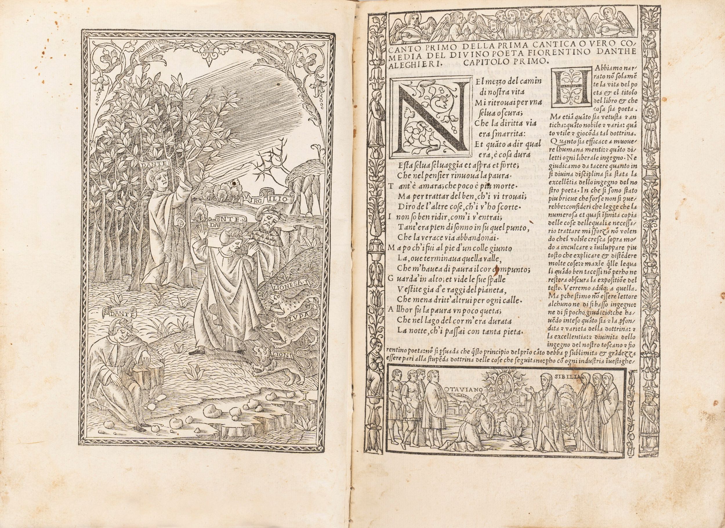 1512 Venezia, Bernardino Stagnino, 1512 adì XXIIII Nouembrio. In 4°, 217 x 155 mm. Frontespizio in rosso e nero, al centro immagine di S. Bernardino da Siena con disco radiante con monogramma di Cristo IHS e mitra in basso e in alto, entro cornice, variante A secondo Edit16, illustrazione a piena pagina in apertura della prima Cantica con Dante in tre pose diverse accanto a Virgilio e alle tre fiere, 98 illustrazioni xilografiche nel testo, restauri ai margini della prima carta e delle ultime, aloni marginali, strappo a p.55 senza perdita, forellini di tarlo ai margini interni di alcune carte, nel complesso una buona copia, legatura coeva in piena pelle con impressioni a secco, dorso rifatto, all'interno sui contropiatti applicati fogli pergamenacei del XIII sec. con rituale cristiano.
