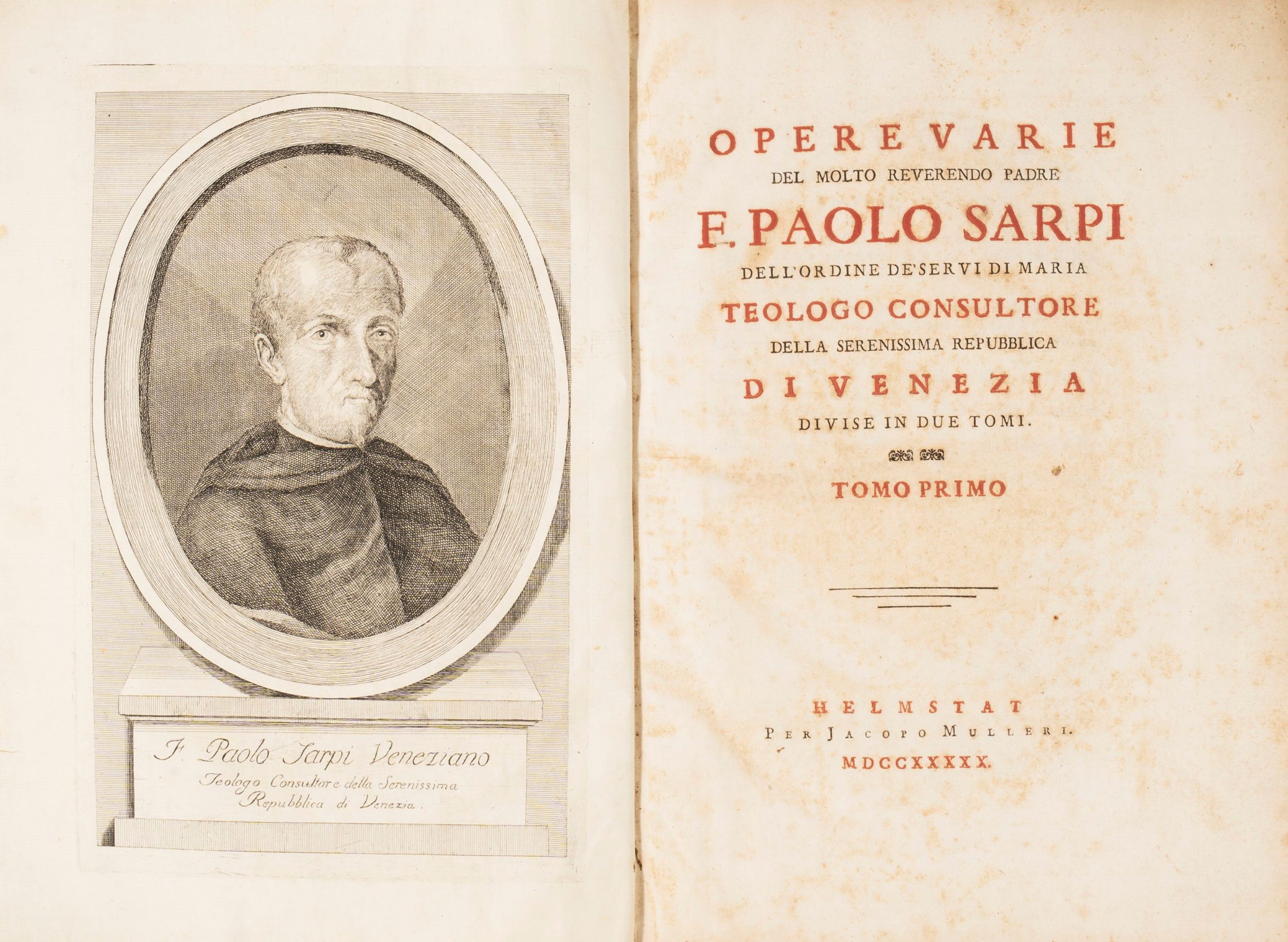 1750 Helmstat, per Jacopo Muller, 1750. Due volumi in folio. Legatura coeva in piena pergamena leggermente imbarcata. Esemplare a grandi margini. Antiporta incisa con il ritratto di Paolo Sarpi. Sporadiche arrossature nelle prime pagine del tomo I.