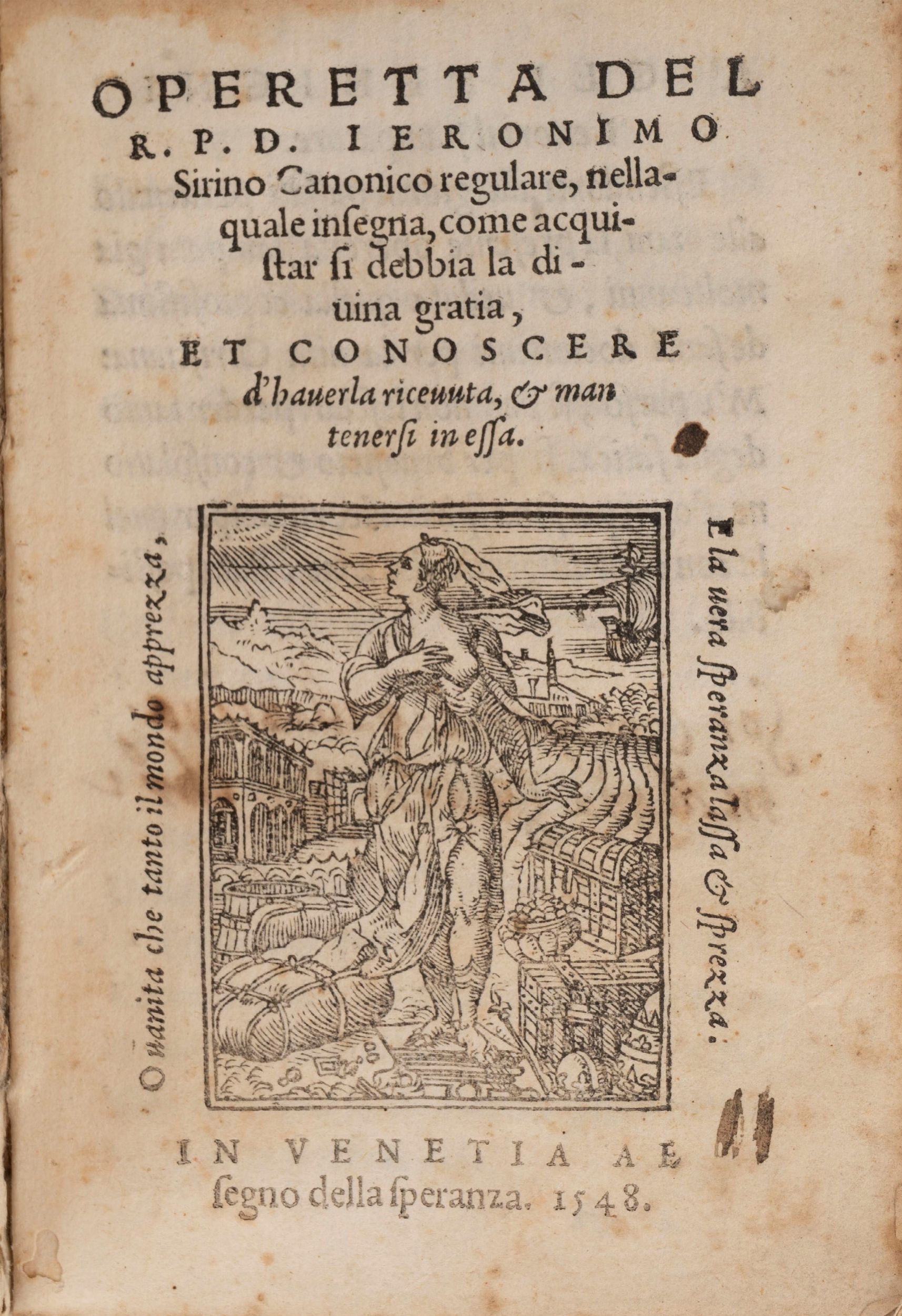 1548 Venezia, al segno della Speranza, 1548. In 16°. Marca tipografica sul frontespizio raffigurante la Speranza, lievi fioriture, piccolo alone alle ultime carte, legatura coeva in pergamena, piccole mancanze, difetti.