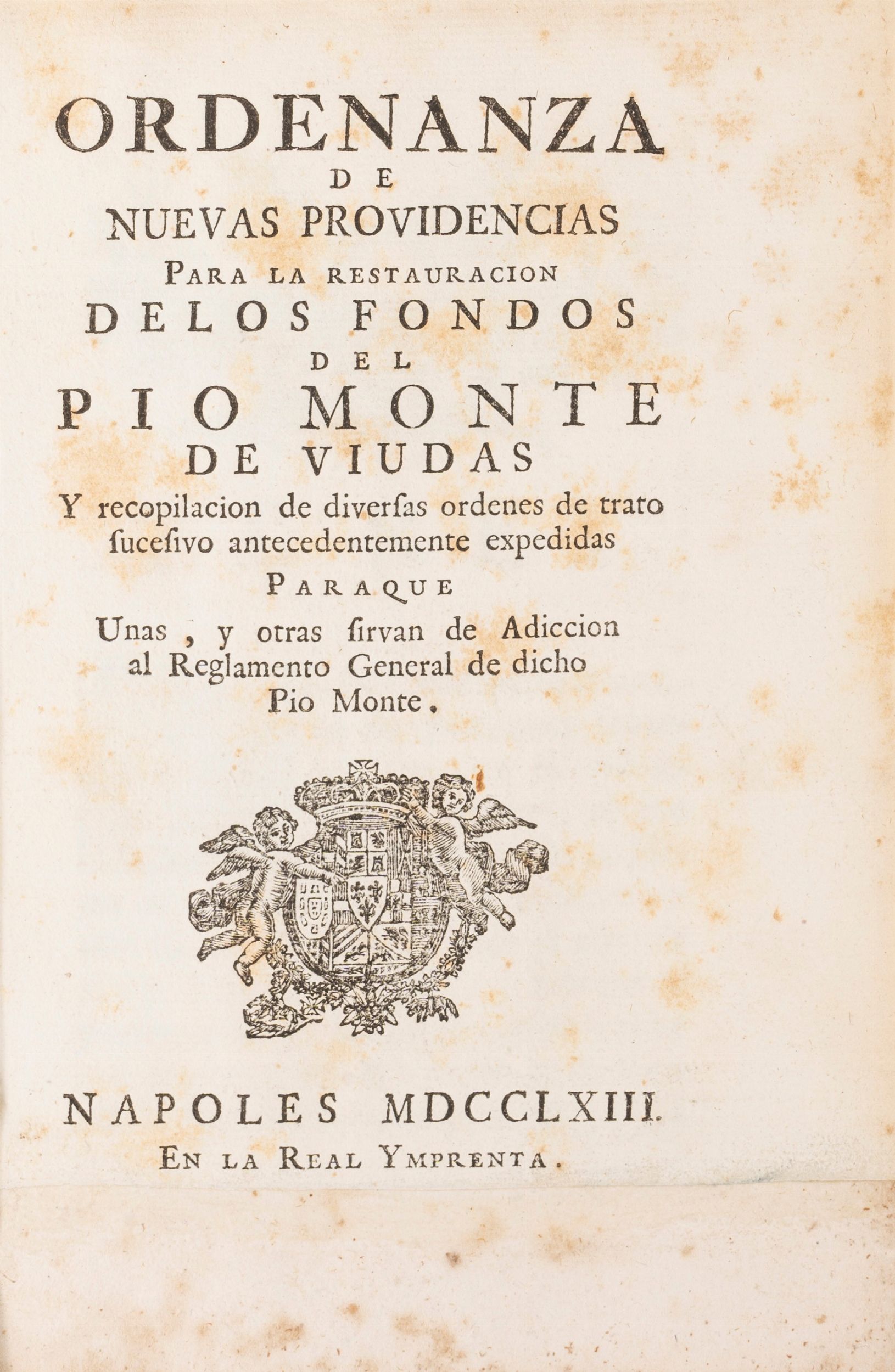 1763 Naples, en la Real Ymprenta, 1763. 4°, stemma borbonico inciso al frontespizio, pp. 32. Legatura coeva in piena pergamena. Restauro al margine inferiore del frontespizio, fioriture.