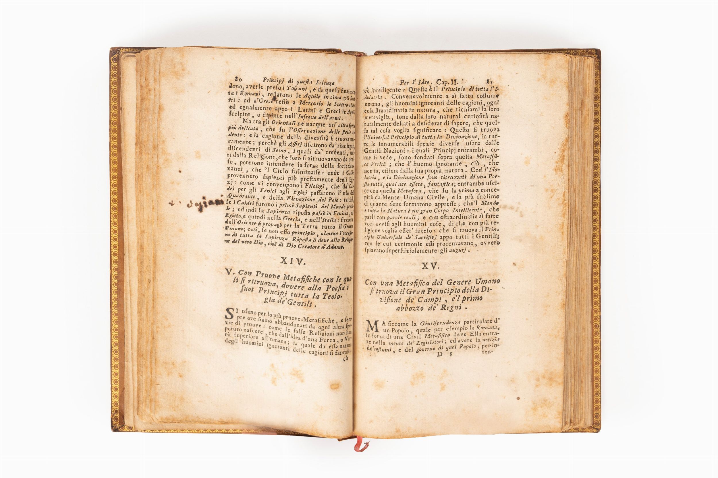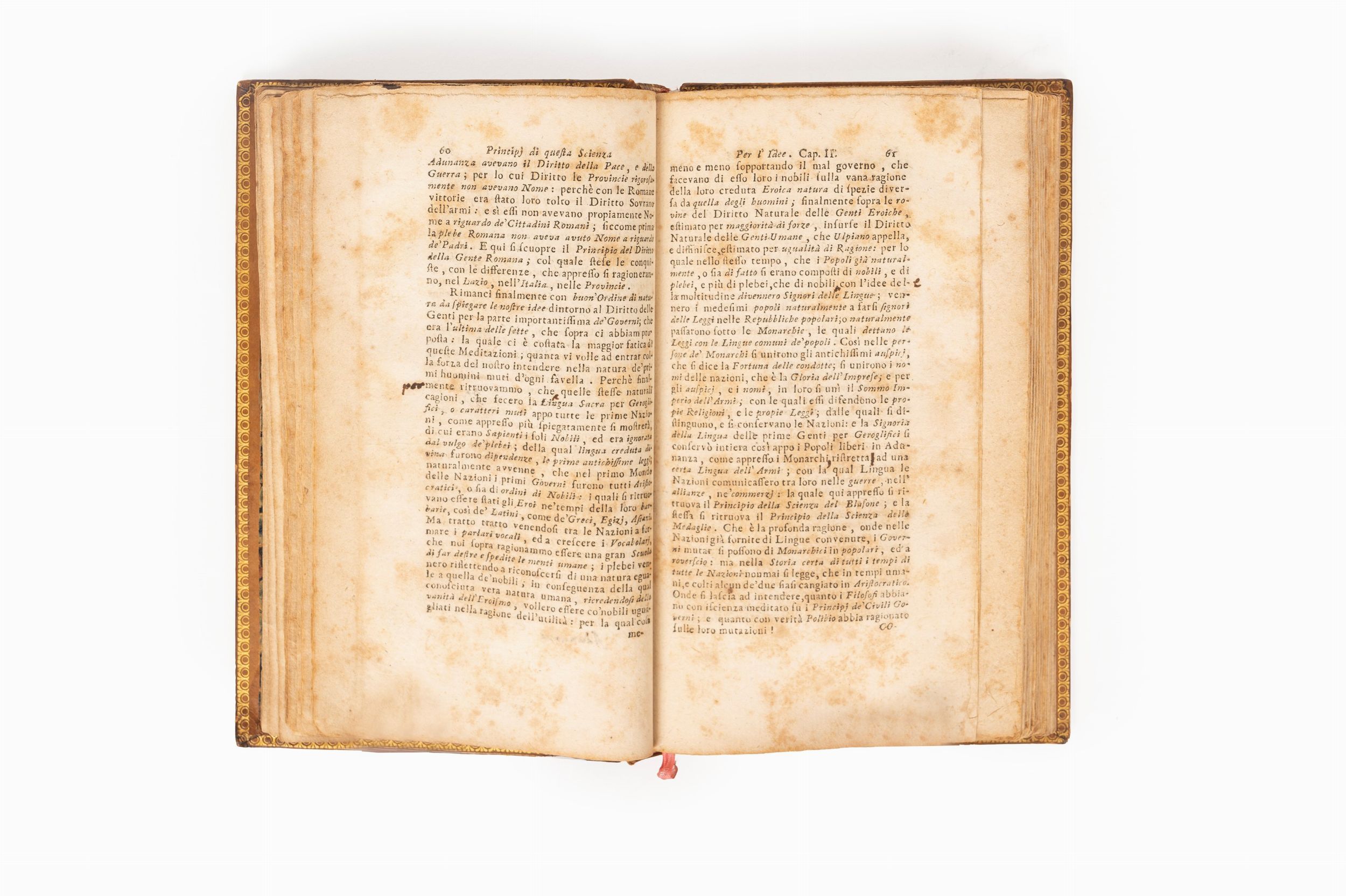 1725 Napoli, Felice Mosca, 1725. In 12°, 161 x 95 mm. Fregio calcografico al frontespizio, capilettera e titoli correnti, ESEMPLARE IN BARBE, consuete bruniture della carta, legatura coeva in pieno vitello biondo con impressioni a secco ai piatti, cornice dorata ad unico filetto, al dorso 5 nervi a separare sei comparti con decorazioni in oro, titolo su tassello in pelle nera, mancanze alla cuffia superiore e difetti a quella inferiore e alle cerniere. Esemplare Marzorati, n.915 del suo catalogo. ECCEZIONALE COPIA RECANTE CORREZIONI AUTOGRAFE DI VICO alle pp.35, 46, 59, 60, 61, 108, 142, 173, 249, 267, cartouche di 3 righe incollato sul verso dell'ultima pagina del testo ad emendarlo. Altre pagine recano integrazioni e revisioni di testo probabilmente attribuibili a lettori vicini a Vico , essendo risaputo l'invio che Vico stesso farà di diversi esemplari (circa 30) della presente edizione ad amici a lui vicini.