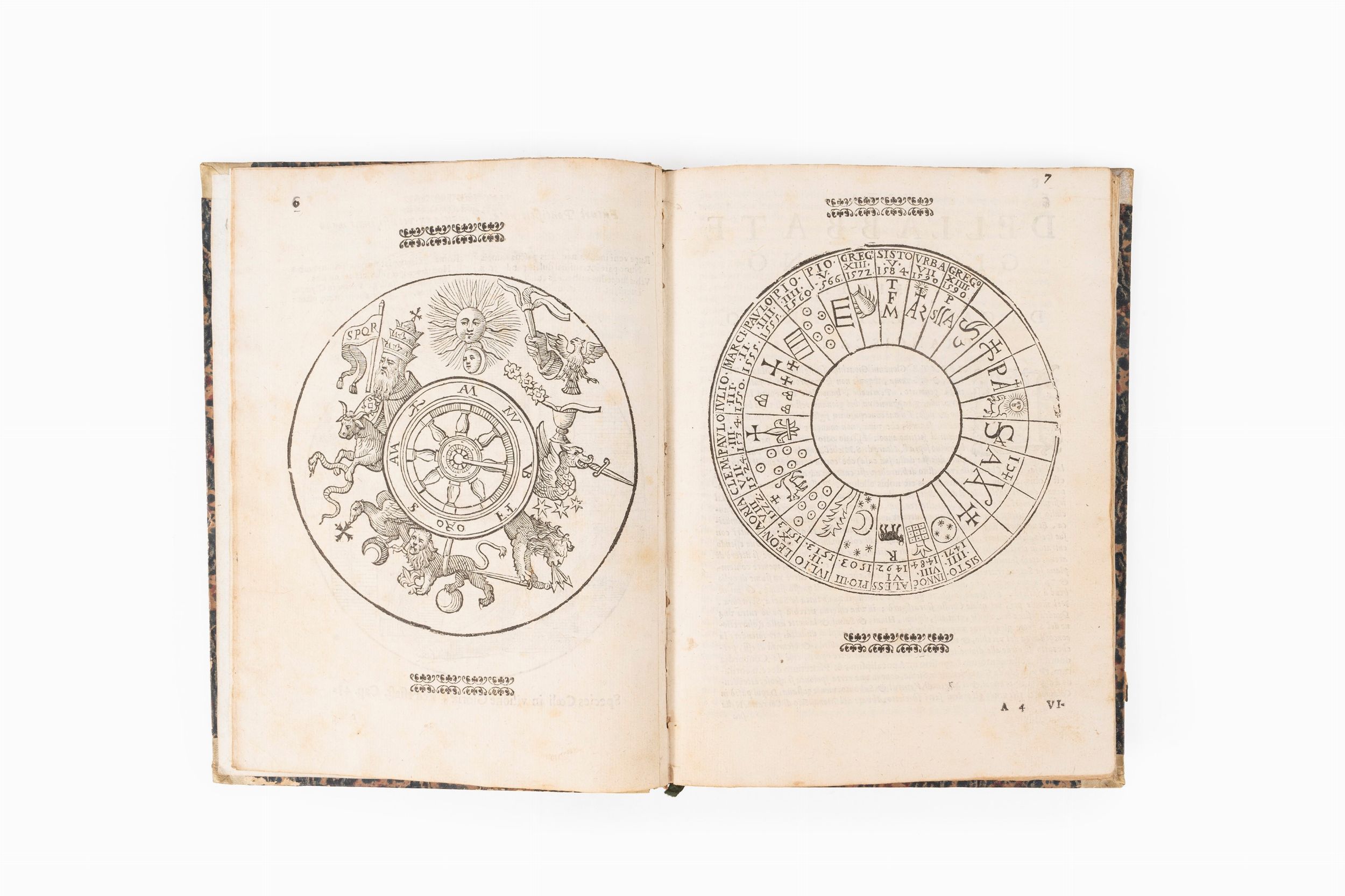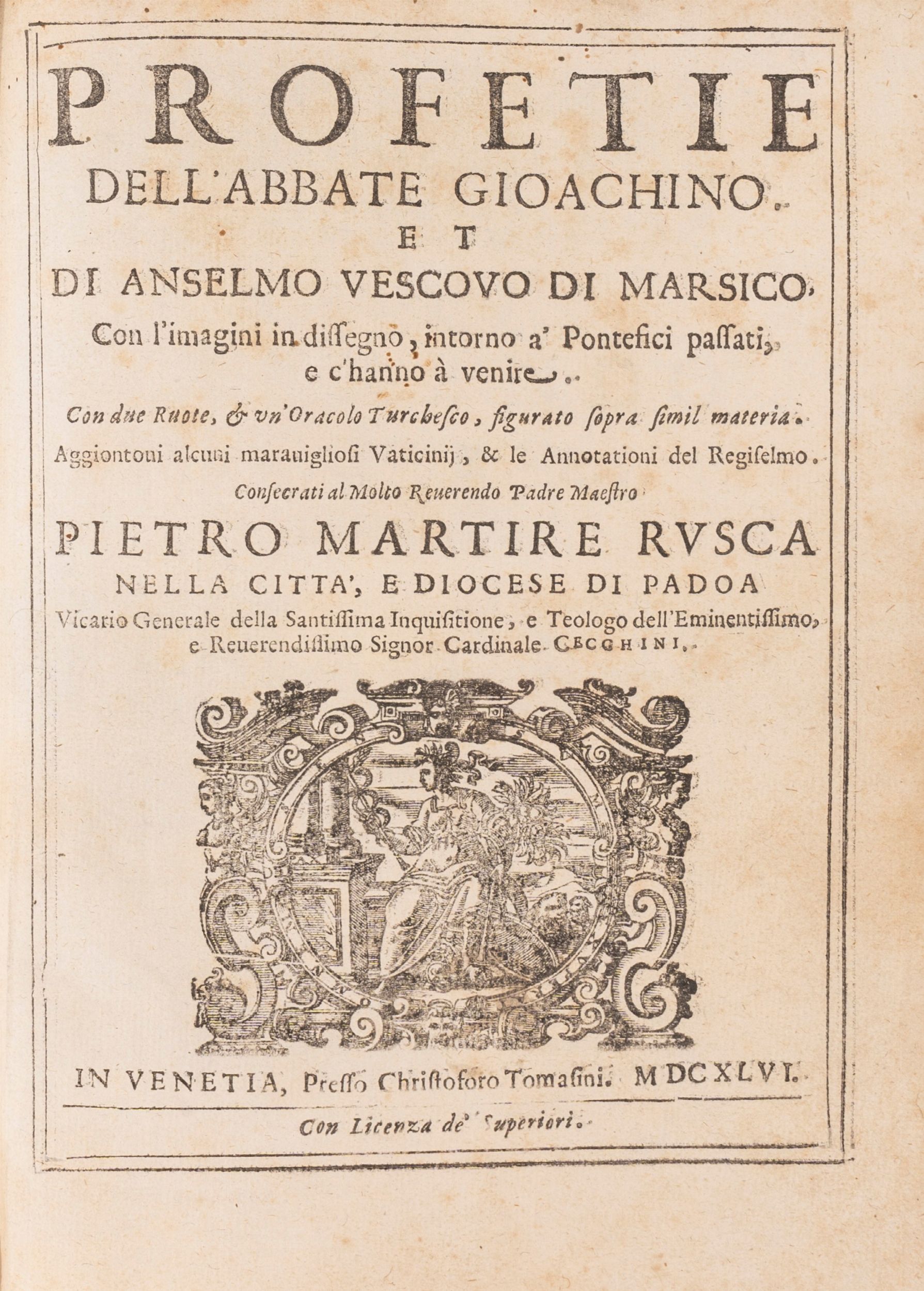 1646 Venezia, Presso Cristoforo Tomasini, 1646. In 8° grande. Marca tipografica al frontespizio, testate e capilettera xilografici, 34 grandi xilografie allegoriche di vaticini nel testo, perlopiù a piena pagina. Legatura del diciannovesimo secolo in mezza pergamena con titolo impresso in oro. Corto di margini. Alone di umidità su alcune carte, sporadiche macchie.