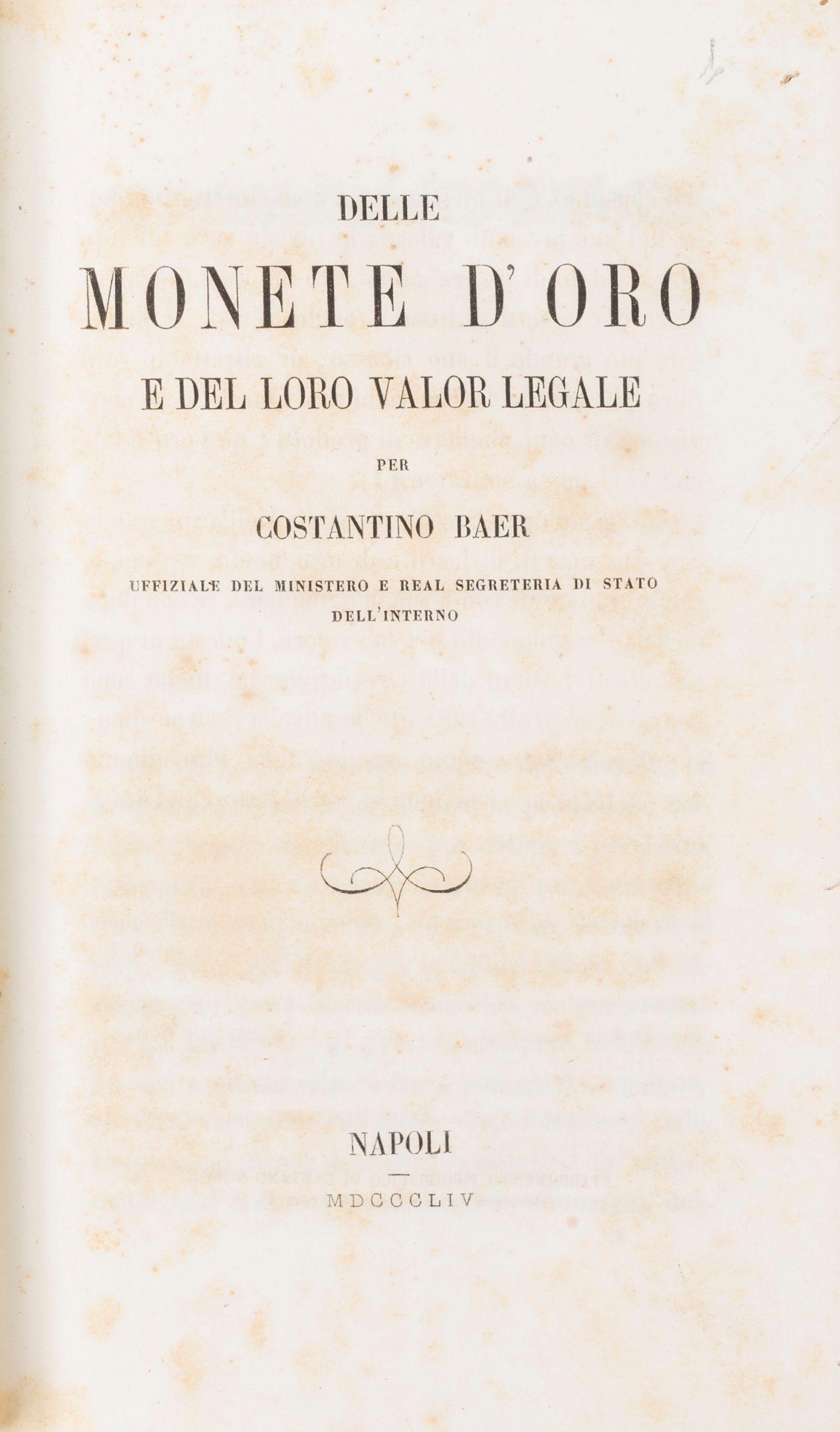 1854 1) BAER Costantino. Delle monete d'oro e del loro valore legale. Napoli, 1854. 8°, pp. 66. Rara edizione originale. Cfr. 'Corvaglia Ennio. Costantino Baer fra globalizzazione e nuovo stato. Costantino Baer (Napoli, 1819 - Torino, 1894). Funzionario del Ministero delle Finanze del Regno delle Due Sicilie prima e italiano dopo. Fu un economista autodidatta attento allo studio dei classici, in particolare di Adam Smith, e autore di importanti saggi, sulla scienza classica, sulla moneta, sui cambi e sul libero scambio. Saggi in cui e evidente come il Baer tende e fare una sintesi tra i problemi teorici e lo studio delle questioni pratiche inerenti la situazione economica interna del Regno delle due Sicilie. Trasferitosi a Torino, dopo la caduta del Regno, entròa far parte di quel gruppo di politici ed economisti meridionali (Manna, Scialoja, de Cesare, Magliani) fautori di una liberalizzazione tesa alla formazione di un ampio mercato interno accompagnata da un vasto piano di lavori pubblici e di rafforzamento di una coesione nazionale. Ricopri importanti cariche tra cui quella di Ispettore Generale delle Finanze e Segretario Generale del Ministero di agricoltura, industria e commercio. Segue: 2) GALLOTTI Giuseppe. Del ribasso del valore permutabile dell'oro e delle conseguenze che debbono derivare da questo ribasso. Napoli, 1856. 8°, pp. 112. Rara edizione originale. Giuseppe Gallotti (Napoli 1803 - 1879). Politico, letterato ed economista. Fervente patriota si mise in evidenza durante i moti del 1820-21 ma la repressione seguita al fallimento dell'esperimento costituzionale lo costrinse all'esilio a Parigi. Tornato a Napoli dopo l'amnistia del 1830 si dedicò esclusivamente ai suoi studi letterari e storici. Nel 1848 fu uno dei principali esponenti dell'ala moderata dell'assemblea costituente. Condannato per cospirazione contro lo stato, fuggi di nuovo in Francia da dove rientrò solo nel 1859. Fu in questo periodo che si dedicò agli studi economici che culminarono nella pubblicazione della presente opera e nel 1861 dell saggio 'Studio sulle presenti condizioni delle province napoletane'. Segue: 3) BAER Costantino. Del basso corso dei cambi e delle grandi immissioni d'argento in Napoli. Napoli, 1856. 8°, pp. 92-(4). Rara edizione originale. Dedica autografa dell'autore all'economista Giovanni Manna. Segue: 4) MANNA Giovanni. Del credito immobiliare. (Napoli, Stab. Tipografico di P. Androsio, 1848). 8°, pp. 72. Rara edizione originale. Un solo esemplare conosciuto conservato nella Biblioteca comunale Giosuè Carducci di Città di Castello. Manca alla Biblioteche napoletane. Unito: Delle società di credito immobiliare. Estratto dagli Annali di Diritto del Prof. Capuano. (Napoli, Stabilimento Tipografico di G. Nobile, 1856-1858). 8°, pp. 16. Nessun esemplare conosciuto. Giovanni Manna (Napoli, 21 gennaio 1813 – Napoli, 23 luglio 1865) è stato un giurista, economista, politico e accademico italiano. Insegnò Diritto Amministrativo all'Università di Napoli fino al 1860 quando, dopo l'Unità , svolse una più intensa attività politica. Assieme a Pietro Calà Ulloa, Enrico Cenni e Federico Persico, appartenne al gruppo di intellettuali napoletani 'neoguelfi', ossia cattolici moderati che aspiravano a una confederazione di stati preunitari sotto la presidenza del papa. nel Regno delle Due Sicilie fu ministro delle Finanze nel 1848 (I governo di Carlo Troja) e nel 1860 (governo di Antonio Spinelli di Scalea). Dopo una sua fallita legazione per ottenere un accordo con i piemontesi si ritirò dalla vita politica attiva. Nel Regno d'Italia fu ministro dell'Agricoltura, Industria e Commercio nei governi Farini e Minghetti I). Durante questo mandato prese parte al dibattito per l'unificazione degli istituti d'emissione monetaria, che si ebbe nel primo decennio unitario. Come ministro il Manna propugnava, con tesi moderne e avanzate per l'epoca, l'unione di tutti gli istituti d'emissione secondo il modello francese. La sua attività di giurista è nota soprattutto per aver scritto in Italia il primo libro di Diritto Amministrativo con il suo 'Il diritto amministrativo del regno delle Due Sicilie' pubblicato da 1840 al 1847. Celebre è la sua frase: i governi passano, l'amministrazione resta. Come economista intervenne in maniera decisiva nel dibattito accademico italiano della metà del XIX vertente sulla opportunità di adottare il paradigma marginalista nello studio dell'economia politica. Segue: 5) SCALAMANDRE Girolamo. Delle università e de comuni del reame di Napoli. Cenno istorico. Napoli, Dai Tipi di Andrea Festa, 1848. 8°, pp. 16. Rara edizione originale. La seconda fu pubblicata nel 1860. Segue: 6) MANGONI Andrea. 8°, pp. 26. Alcune idee intorno a' banchi intesi a ricevere e dare il danajo ad una tenue ragione. Intorno al modo di aumentare i mezzi di rappresentare il valore delle cose. Napoli, 1848. Rara edizione originale. Un solo esemplare conosciuto conservato nella Biblioteca della camera di commercio di Lecce. Segue: 7) RISEIS Panfilo (de). Società in anonimo per la Ferrovia Abruzzese pei confini romani. Napoli, Stabilimento Tipografico di Nicola Porcelli, 1856. 8°, pp. 140 con una carta settentrionale del Regno delle due Sicilie, confini colorati all'acquarello, disegnata e litografata da Giuseppe Rodini, ripiegata f.t. Segue: 8) COOP Giovanni. Tavole per facilitare le calcolazioni commerciali tanto in dogana che nei Banchi modellate sulla legge de' pesi e delle misure. Napoli, nella Tipografia della Gazzetta dei Tribunali, 1846. 8°, pp. 147. Segue: 9) AFAN DE RIVERA Carlo. Considerazioni sulle circostanze fisiche ed economiche del Tavoliere di Puglia e su gli spedienti atti a migliorarne l'industria campestre e promuoverne la prosperità per mezzo della istituzione di una banca rurale e commerciale. Napoli, dalla stamperia e cartiera del Fibreno, 1834. Napoli, dalla Stamperia e Cartiera del Fibreno, 1834. 8°, pp. 70-(2). Rara edizione originale. Esperto di viabilit