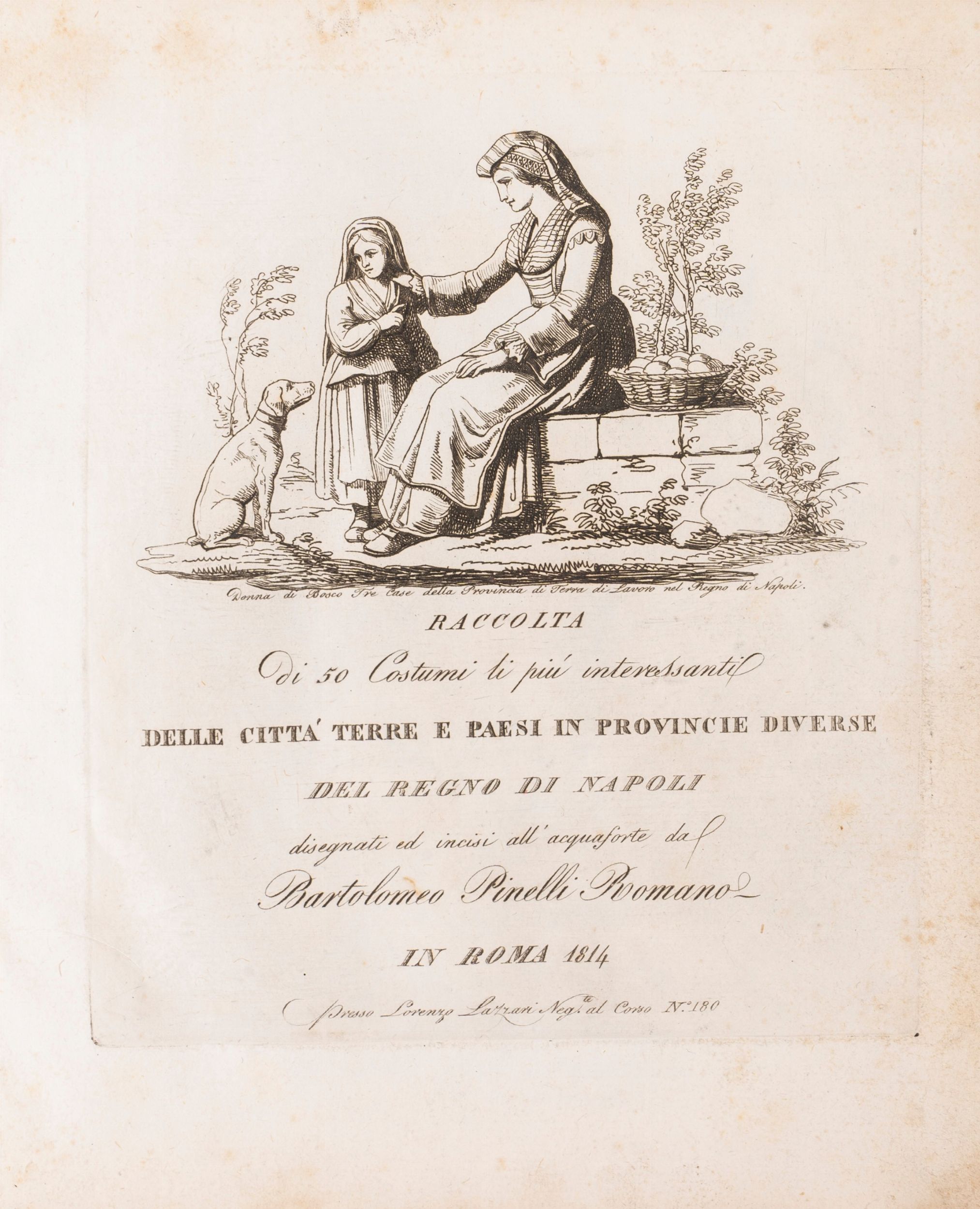 1814 Roma, presso Lorenzo Lazzari, 1814. In 8°. Legatura della fine del diciannovesimo secolo in mezza pelle e tela, con tracce d'uso. Illustrato da 50 tavole calcografiche raffiguranti costumi napoletani (Abruzzo, Molise, Terra di Lavoro). La tavola n. 7 raffigurante 'Il venditore dei torroni' in antica coloritura. Arrossature dovute alla qualità della carta.