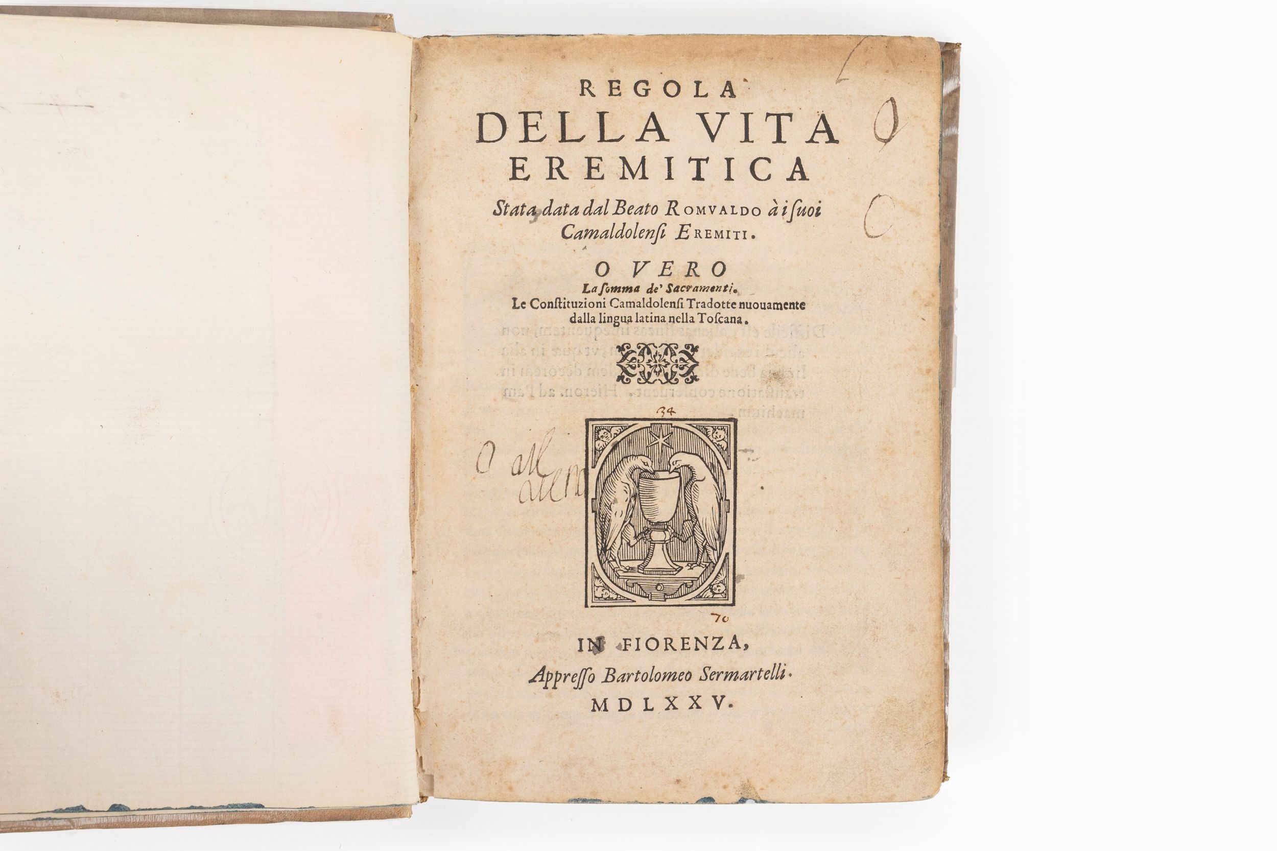 1575 Firenze, appresso Bartolomeo Sermartelli, 1575. In 4°. Al frontespizio xilografia con due colombe che si abbeverano ad un calice, al colophon una tartaruga che tiene sul guscio una vela con giglio fiorentino, in cornice figurata con motto Festina lente, marginali arrossature, legatura in pergamena rigida del sec.XVIII.