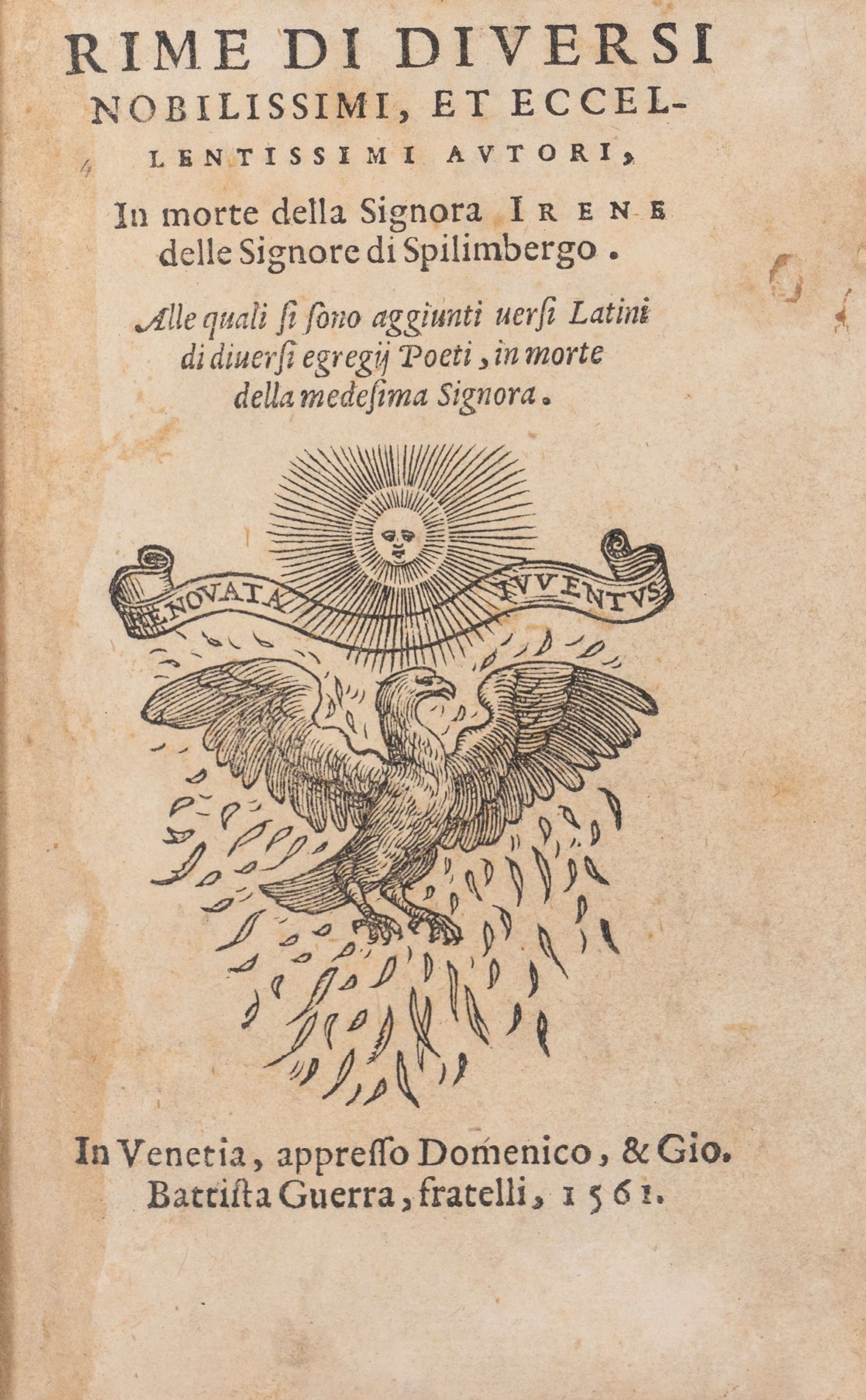 1561 Venezia, Domenico & Gio. Battista Guerra, 1561. In 8°. 2 parti in un volume, la seconda parte intitolata Diuersorum praestantium poetarum carmina in obitu Irenes Spilimbergiae. Marca tipografica ai frontespizi, testo in corsivo romano, iniziali xilografiche, qualche rara arrossatura, piccolo foro l margine bianco di b8 (seconda parte), bella legatura di epoca successiva in marocchino, piatti inquadrati da elegante cornice, titolo in oro al dorso a 5 nervi con fregi fitomorfi, carte di guardia marmorizzate, tagli dorati. Ex libris cartaceo al contropiatto.