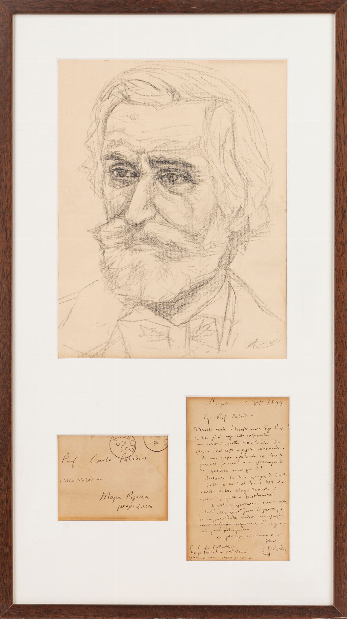 1899 Bella composizione celebrativa del genio di Busseto: entro cornice di legno scuro sono raccolti un ritratto a carboncino , 300 x 230 mm. e una bella lettera di una pagina in 8° con busta , 165 x 105 mm., indirizzata a Carlo Paladini presso Villa Paladini a Massa Pisana, Lucca, datata 15 agosto 1899.