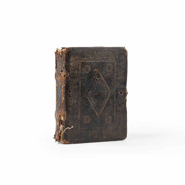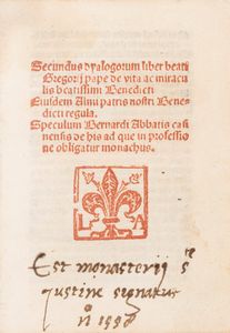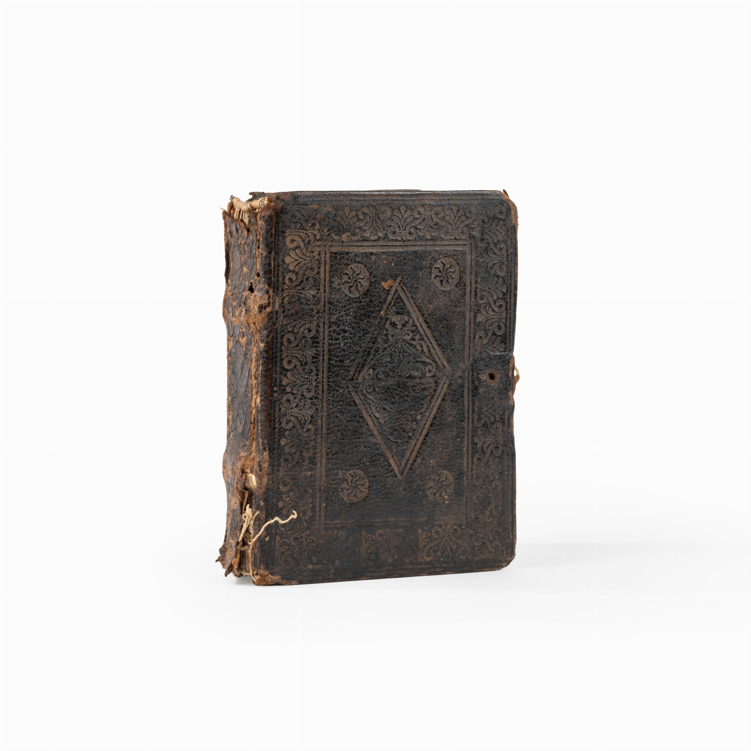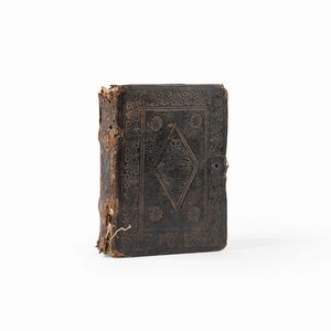 1505 Venezia, [Jacopo Pencio e] Lucantonio Giunta, 13 marzo 1505. In 16°. Frontespizio stampato in rosso con marca tipografica, testo in carattere gotico in rosso e nero, 3 incisioni a piena pagina, 3 cornici incise e 3 grandi iniziali istoriate, in fine al volume vignetta di San Giorgio incisa in legno, A2-7 parzialmente staccate, qualche lieve alone, legatura coeva in pelle con belle impressioni a secco, tagli marroni, difetti al dorso, lievi segni di usura. Firma di appartenenza al frontespizio.
